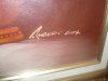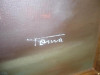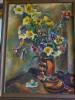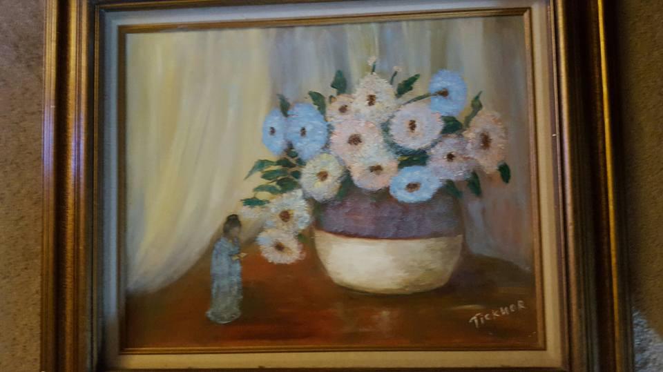 a painting of a vase of flowers with a figurine of an oriental woman with a backdrop of drapes in blues and pinks, signed Ticknor with a backwards "N" Passed down from great grandmother. Painting is on a Duroboard canvas.