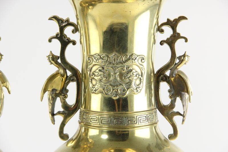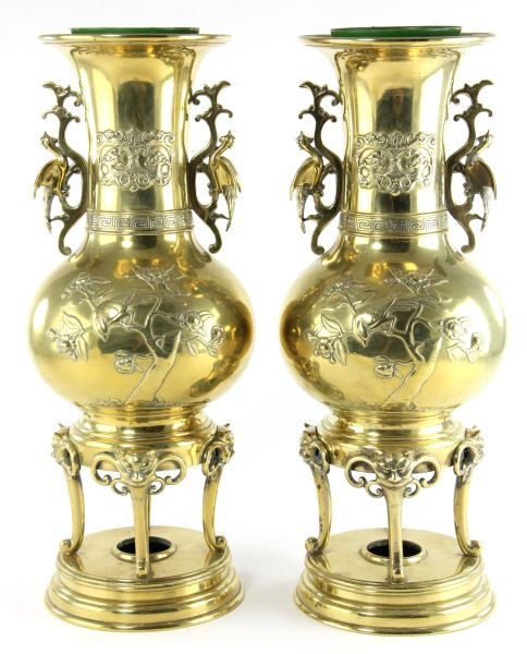 Obtained recently from the Edan Earle Boykin Estate, a pair of 20th century brass censers, tall vase form, mounted on bases where burner would be placed, applied dragon handles, gargoyle legs, Greek key designs, 18.5 x 8 in. diameter.  Very good condition although slight leg wobble on 1 or 2 legs.