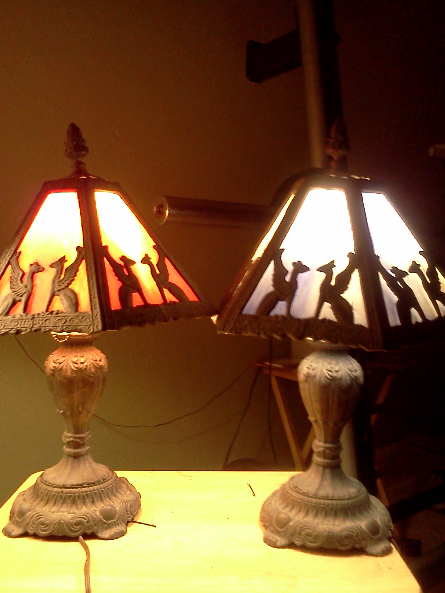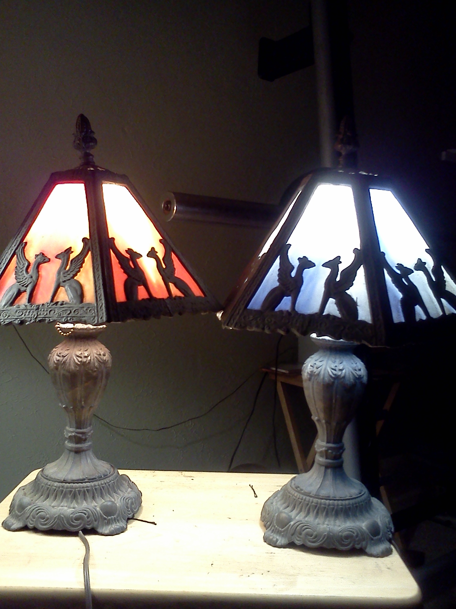 Pair of EF&EF Industries pewter lamps with stained glass shades. One lamp features blue and white glass, the other orange and white glass. They both feature camel like animals with wings accross glass shaded. They are stamped on the bottom withe EF&EF trademark and the #545x and yr.1976. They are both in excellent condition but need to be cleaned.