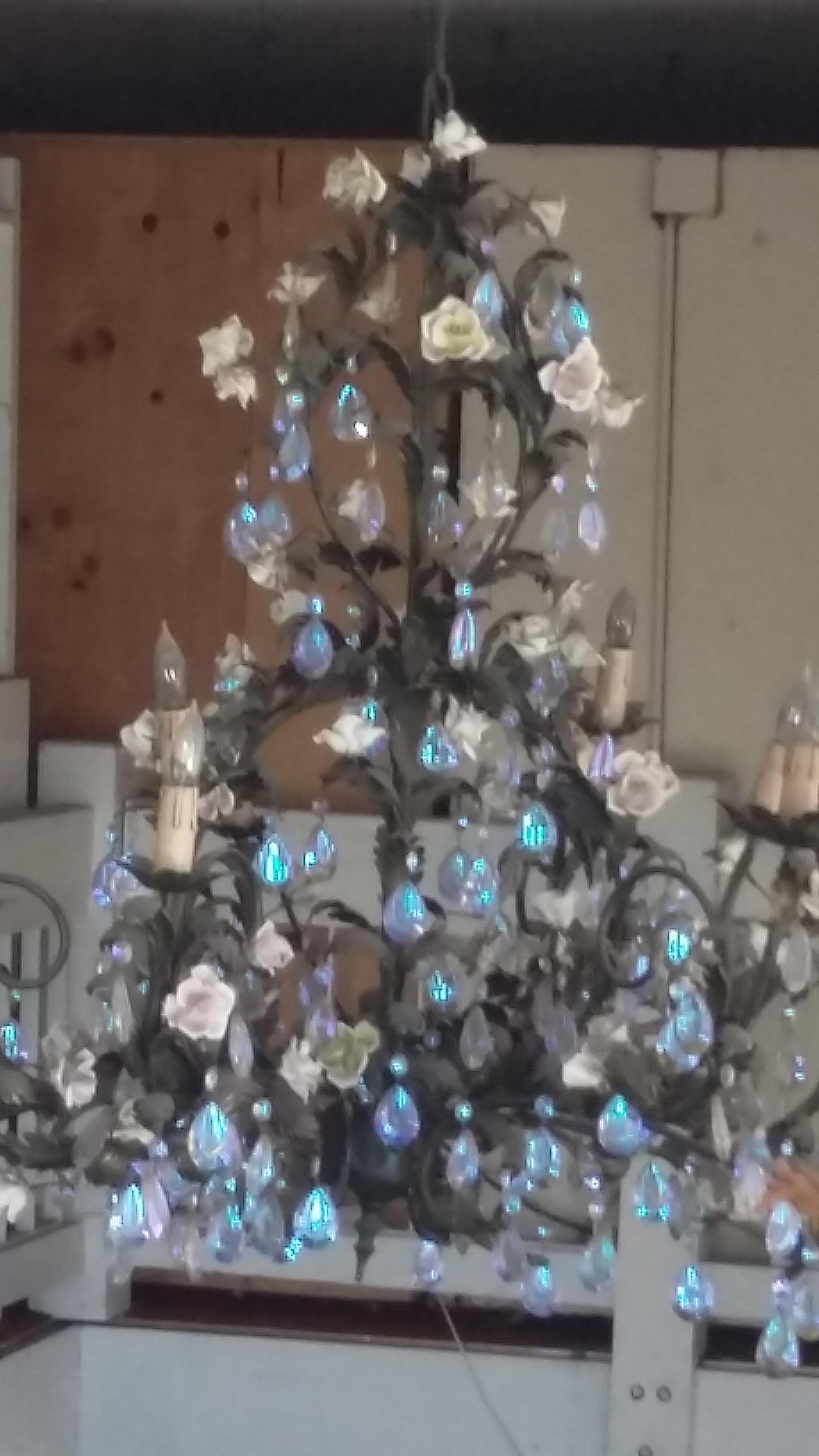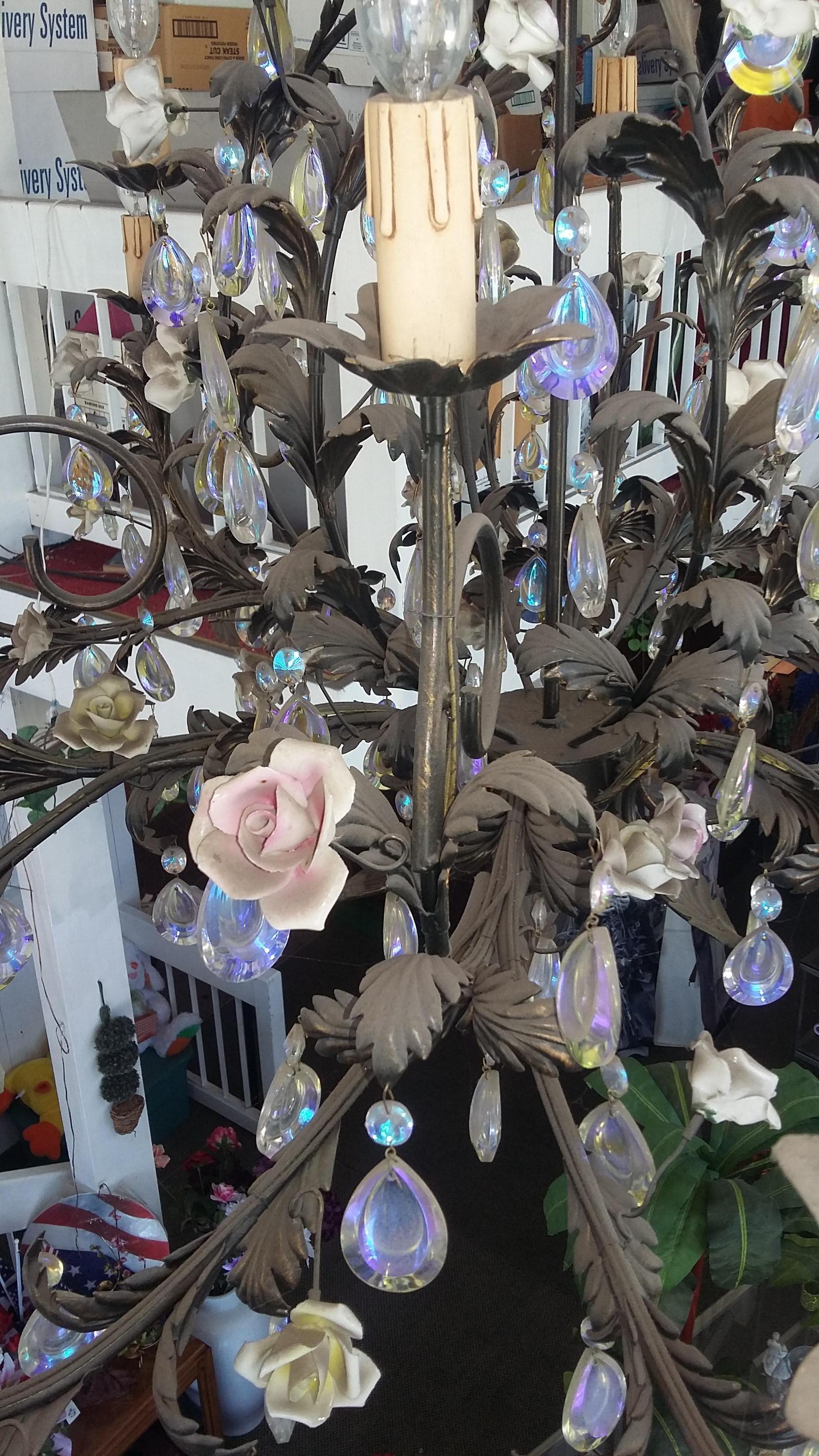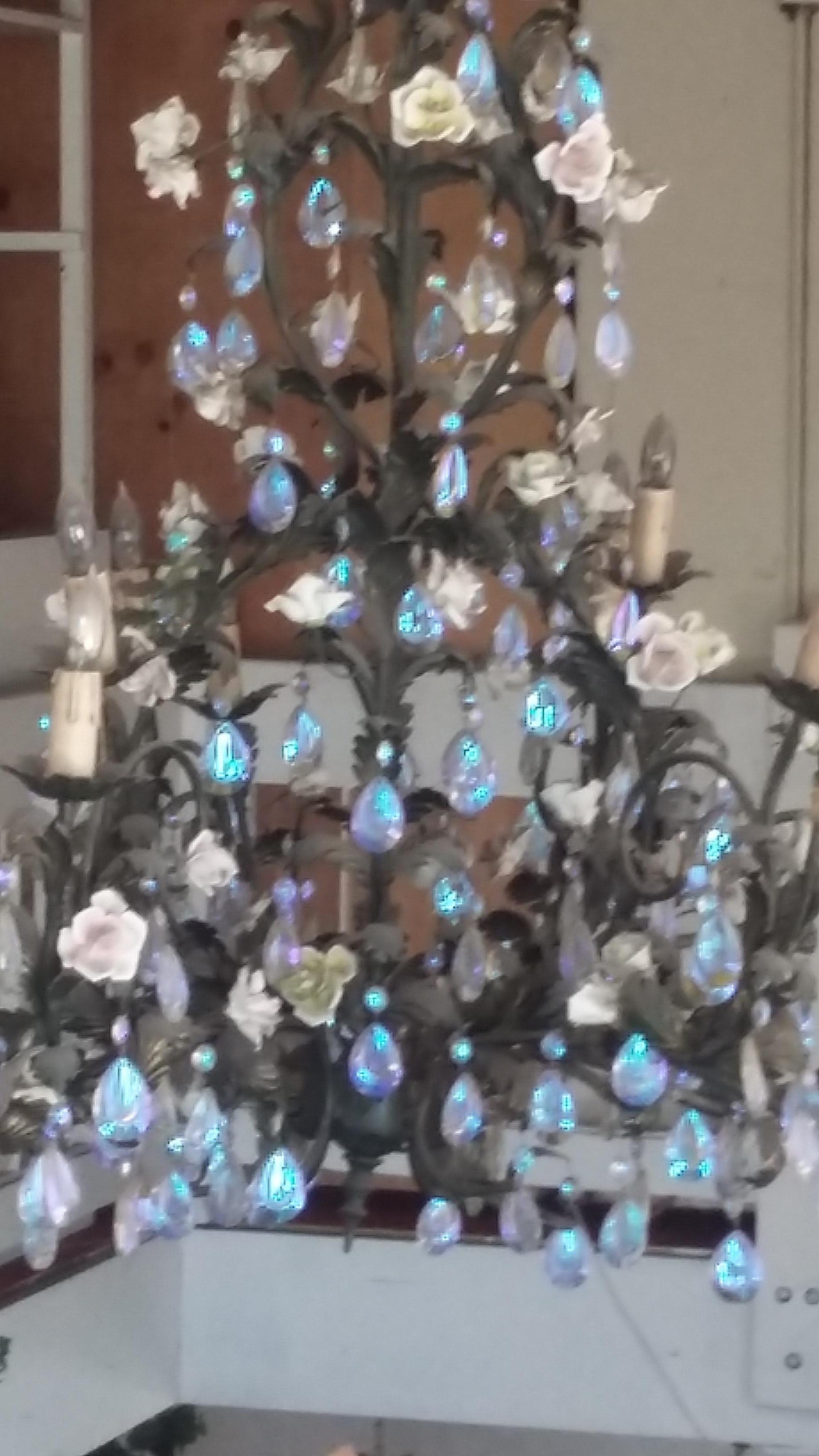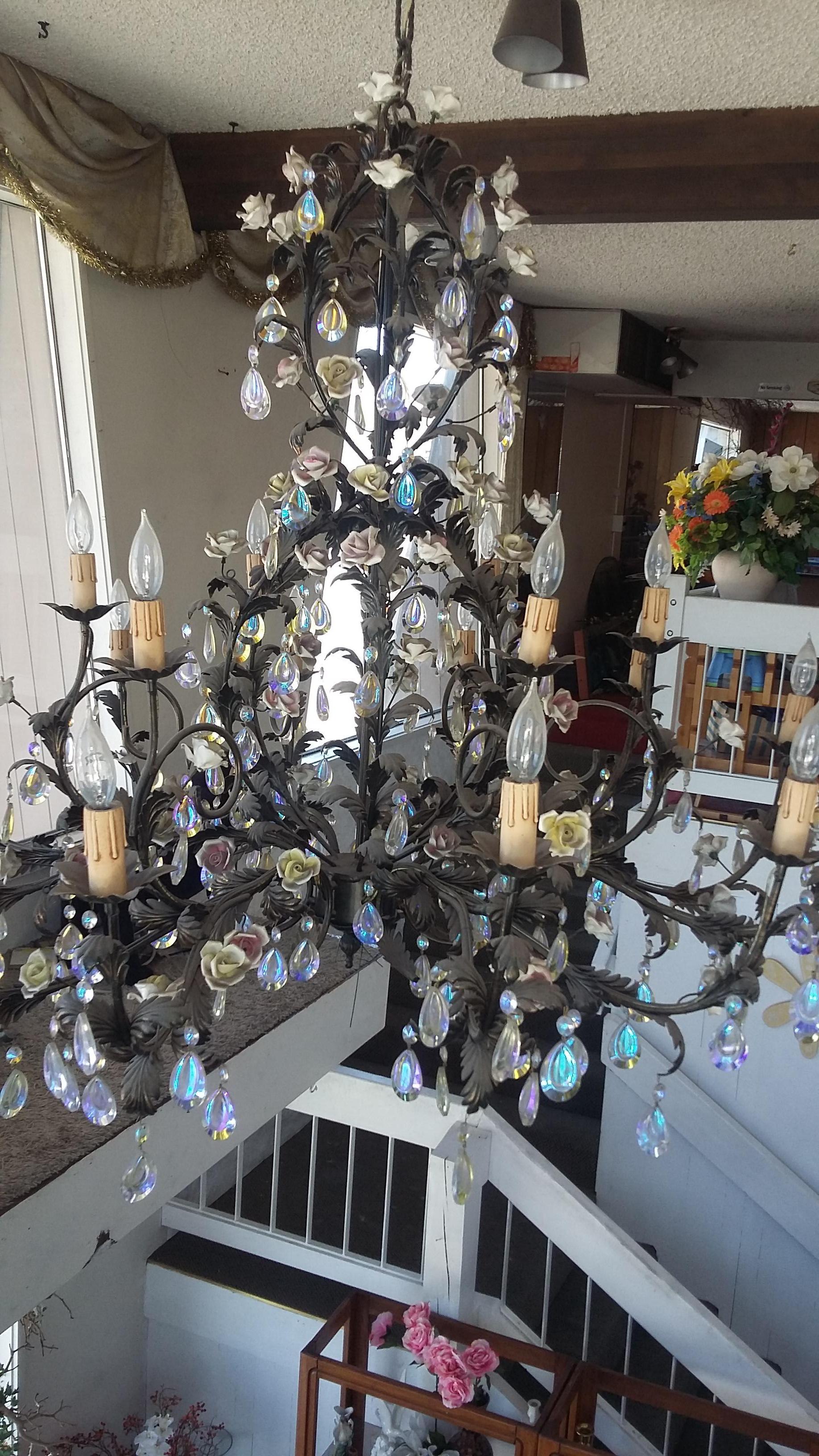 Two beautiful Auroa Bore Alis droplet porcelain roses Chandler with 8 middle row arms and 18 arms in the first row. 18 candle stick lights throughout. Pink and white roses throughout entire pieces along with the generous amount of light reflecting chrystals hanging from each arm. I don't know the year or have any knowledge about there value but need some information because looking to sell both before moving.