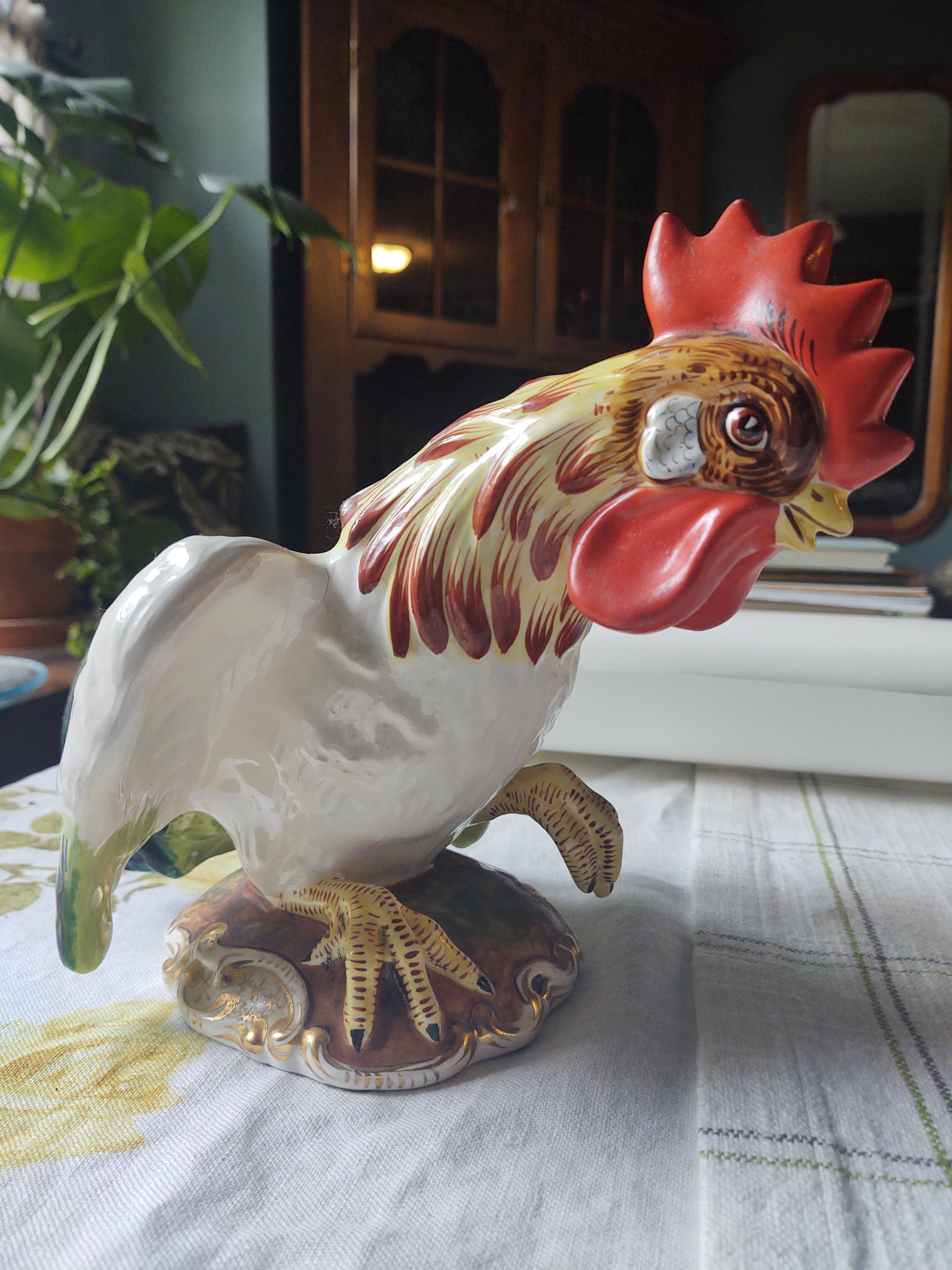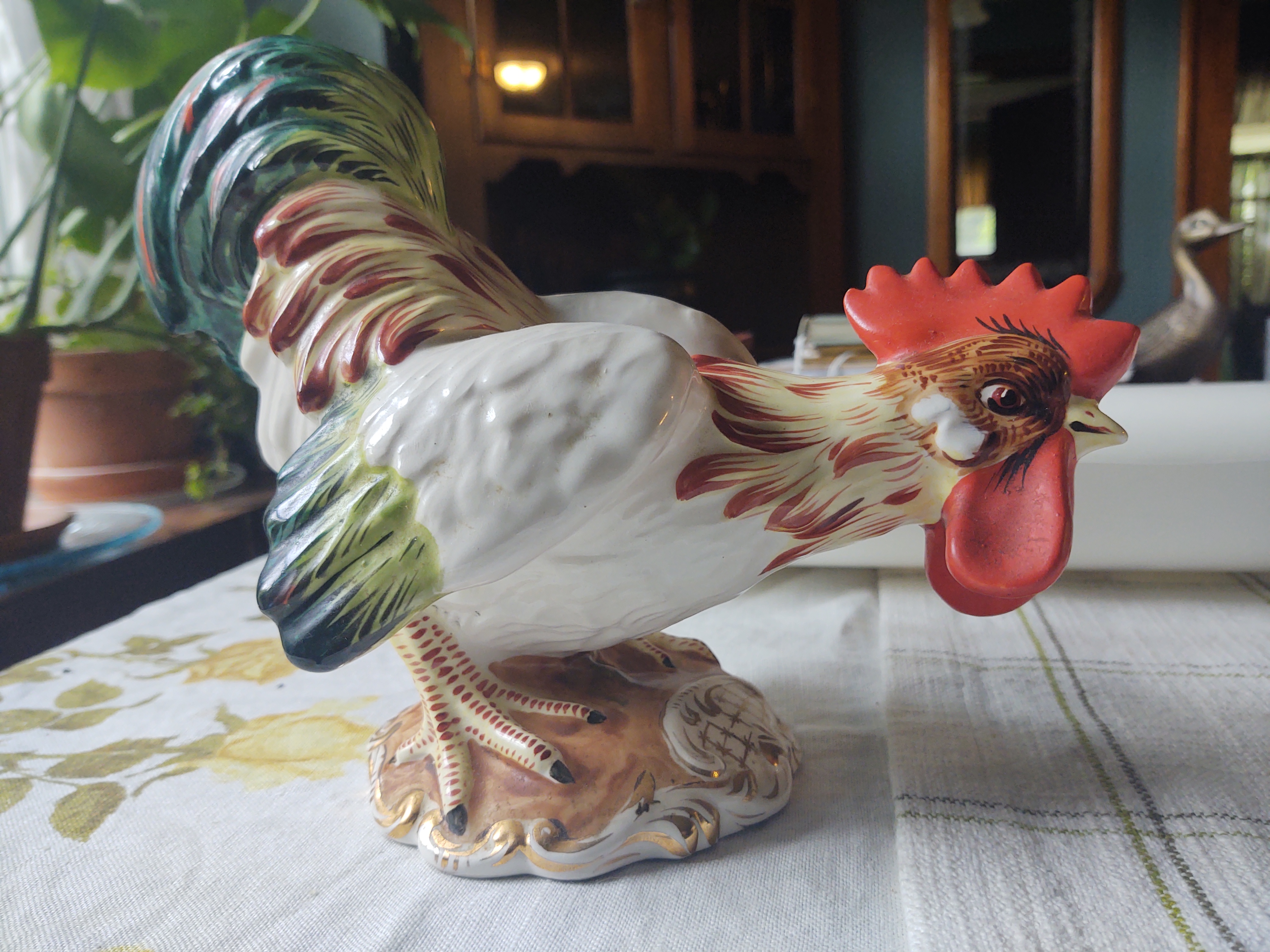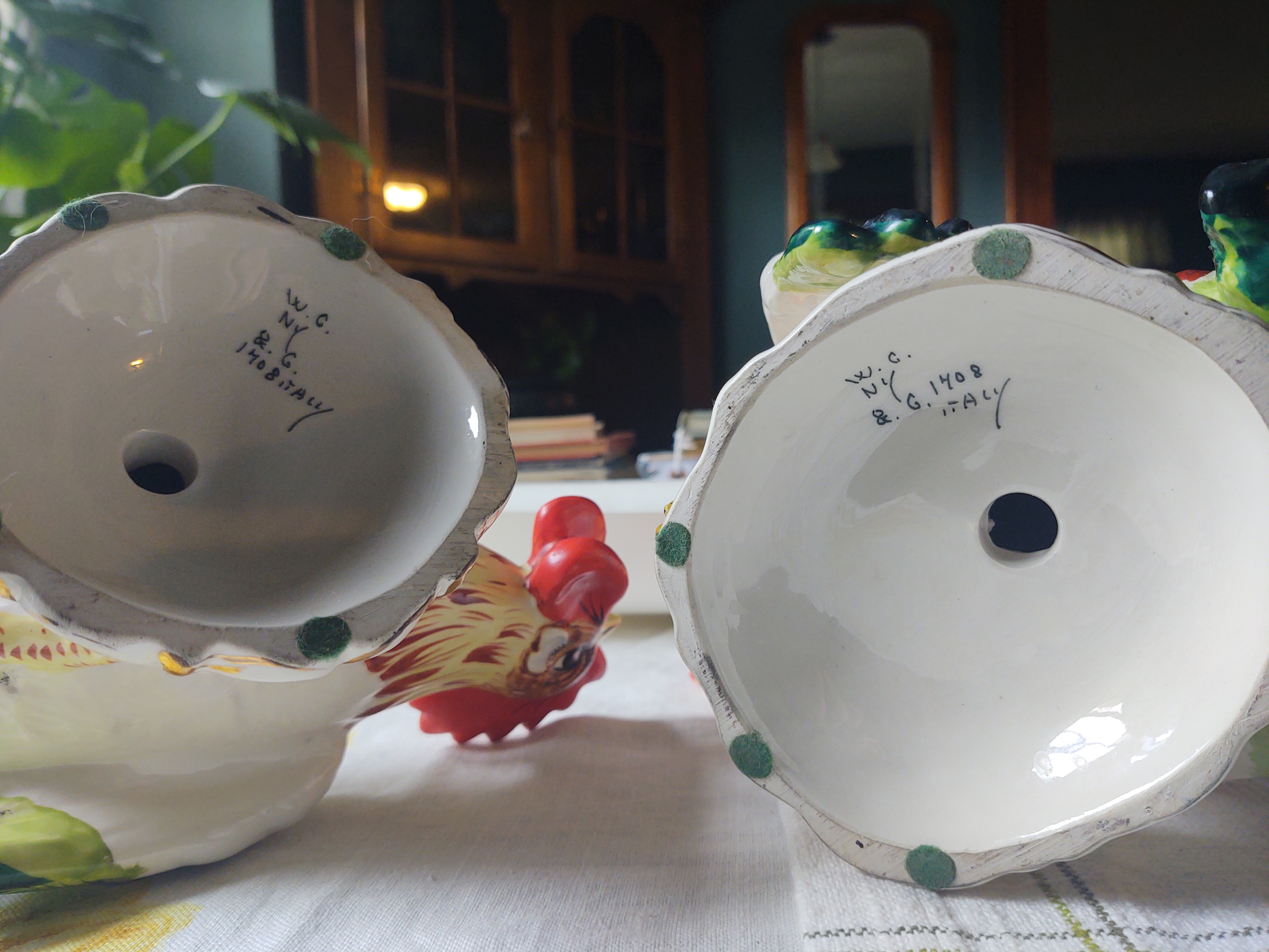 Pair of ceramic roosters hand painted with lovely glaze detailing, gold china paint on base, bottom of both signed W.C NY & G. 1408 Italy