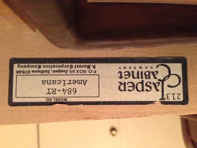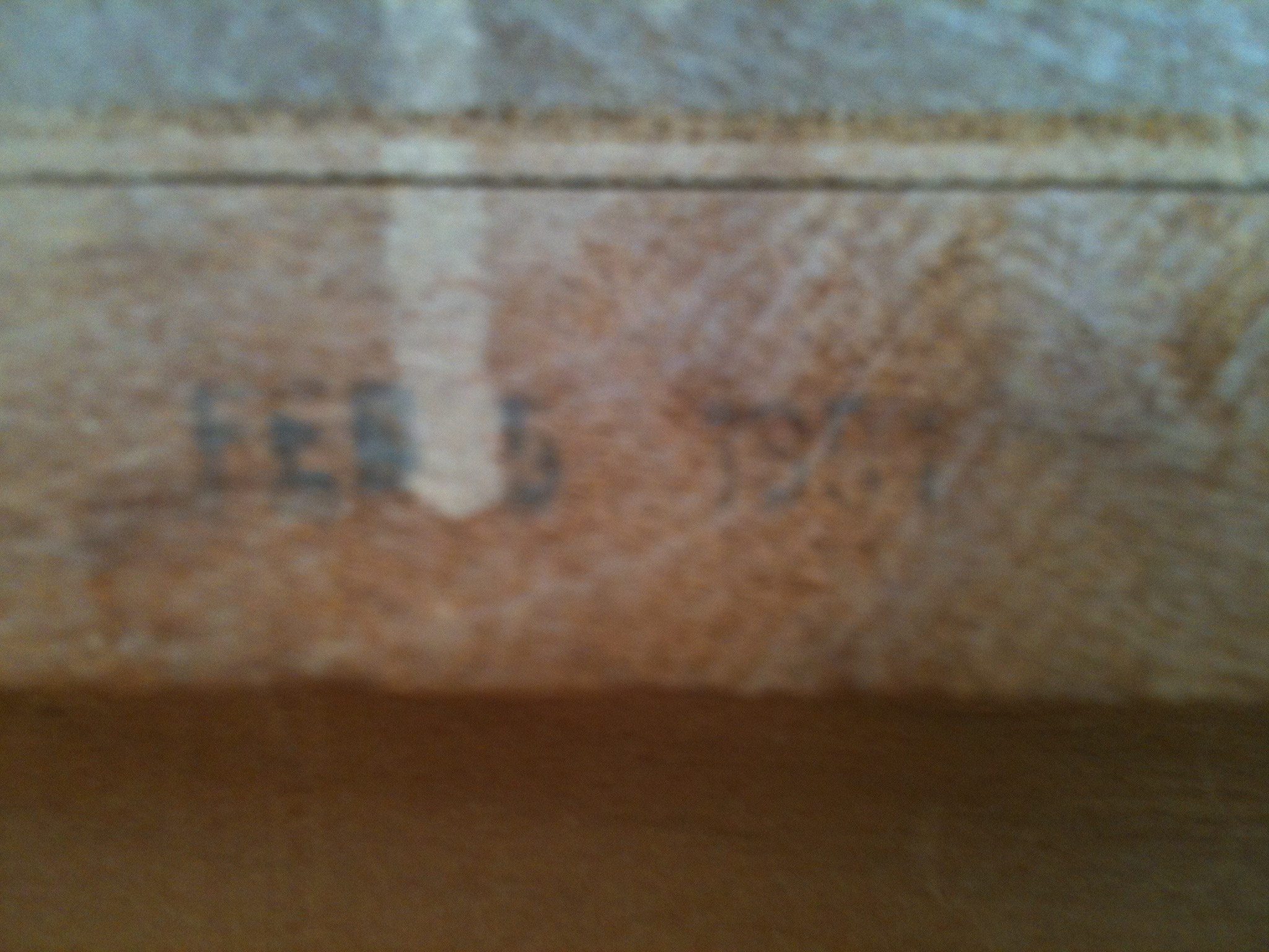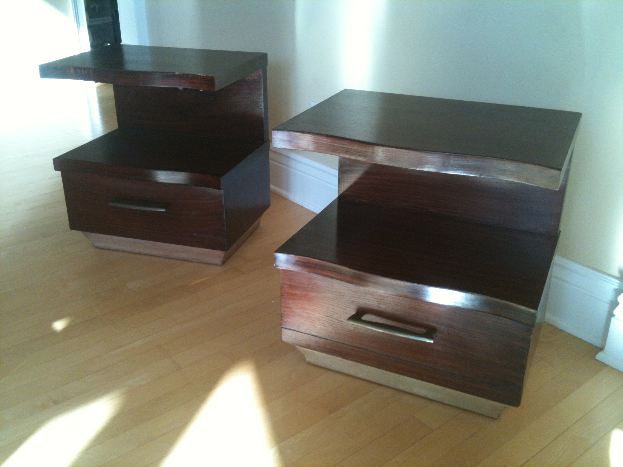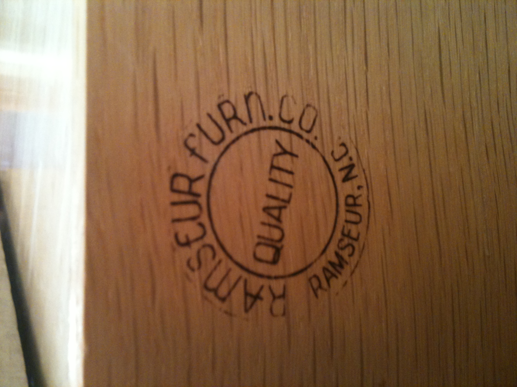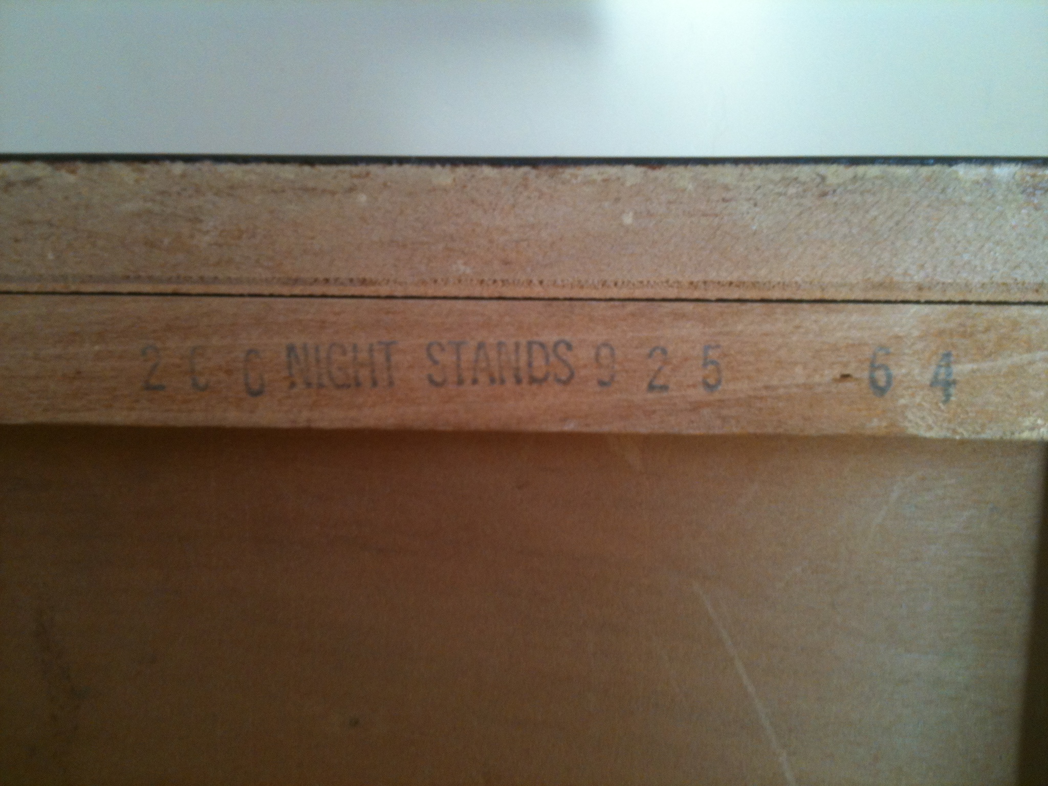 This pair of MCM nightstands is made from a light wood given a cherry stain, and have metal handles on their drawers. They are marked Ramseur Furniture Co inside the drawers, and are marked as Oak and Feb 3 1957, and Feb 5 1957. Both have some scratching of the varnish, and the handles are somewhat tarnished/oxidized. One has some chipping on the top surface. They are both marked '206 NIGHTSTANDS 925'.