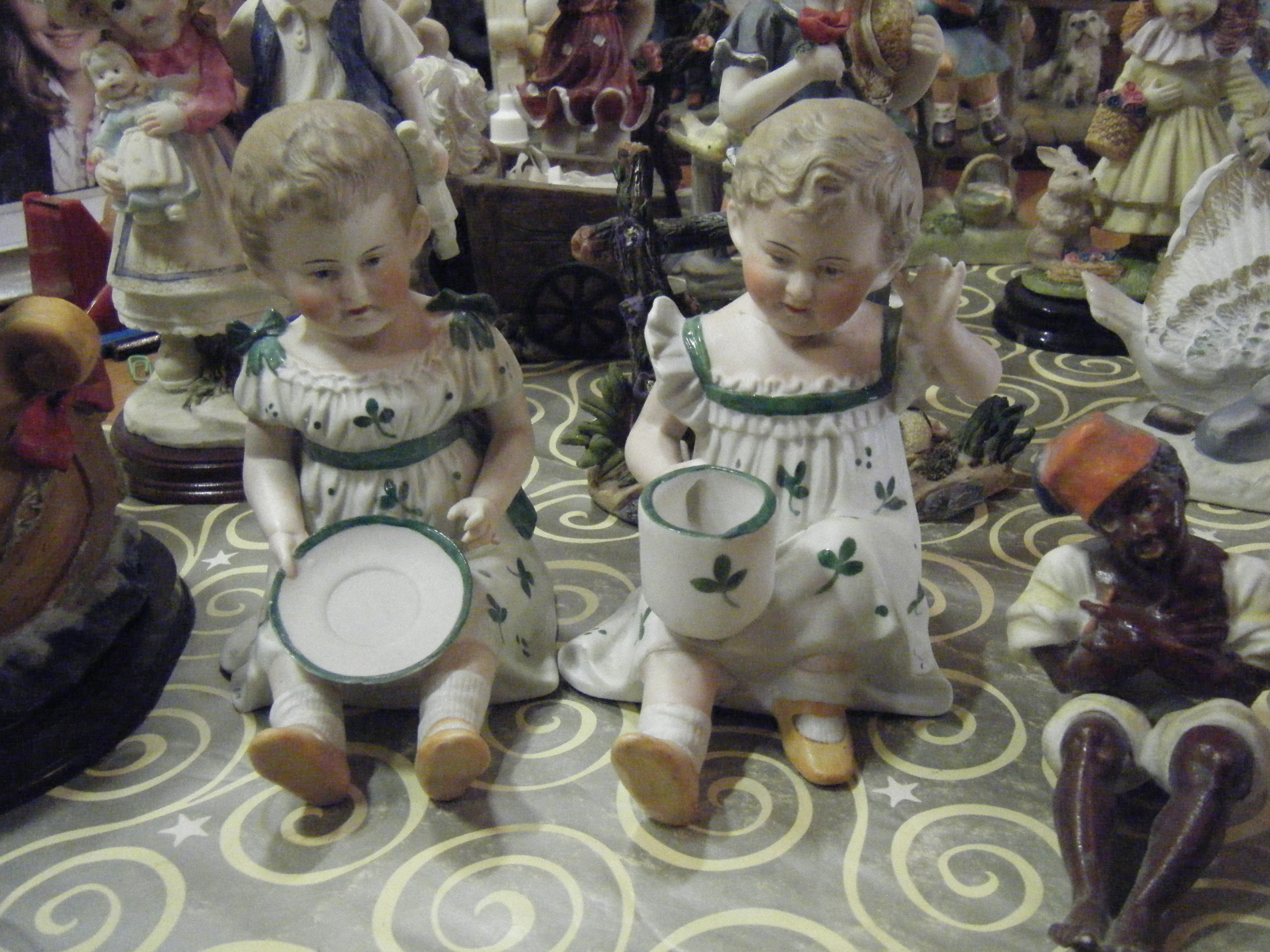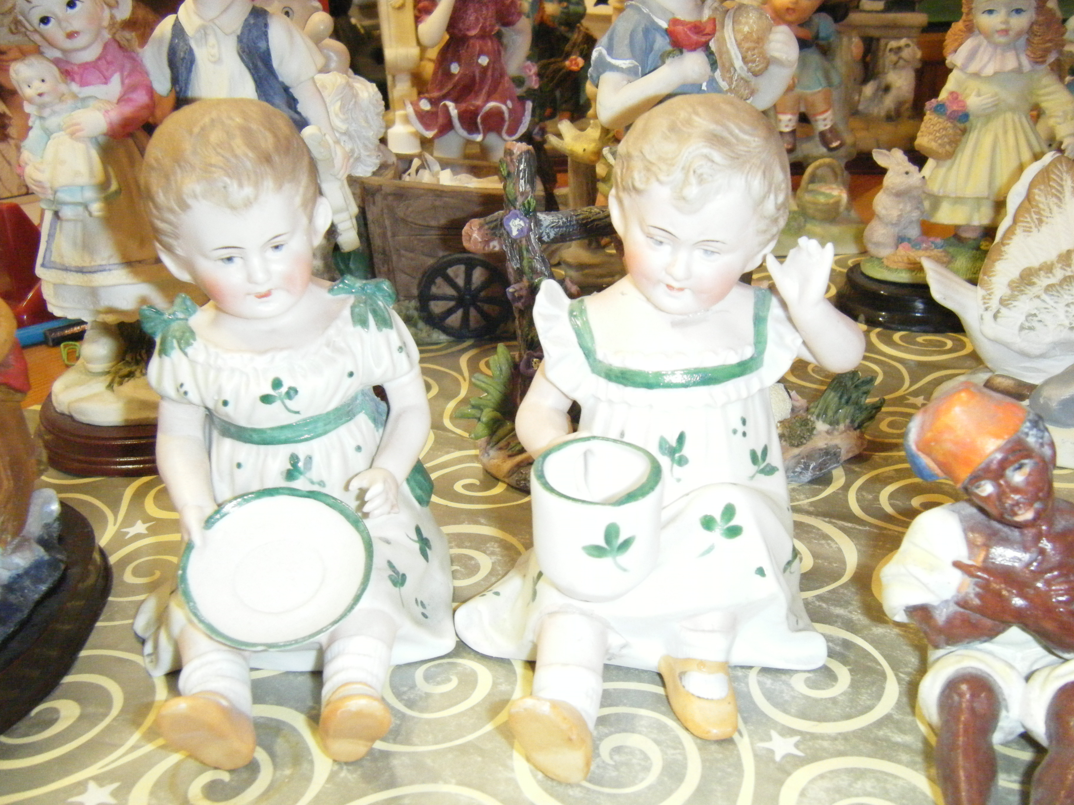 I have a pair of over 100 yrs old china dolls 1 is mended the other intact .there are no marks on them .Can anybody tell me anything about them and their value