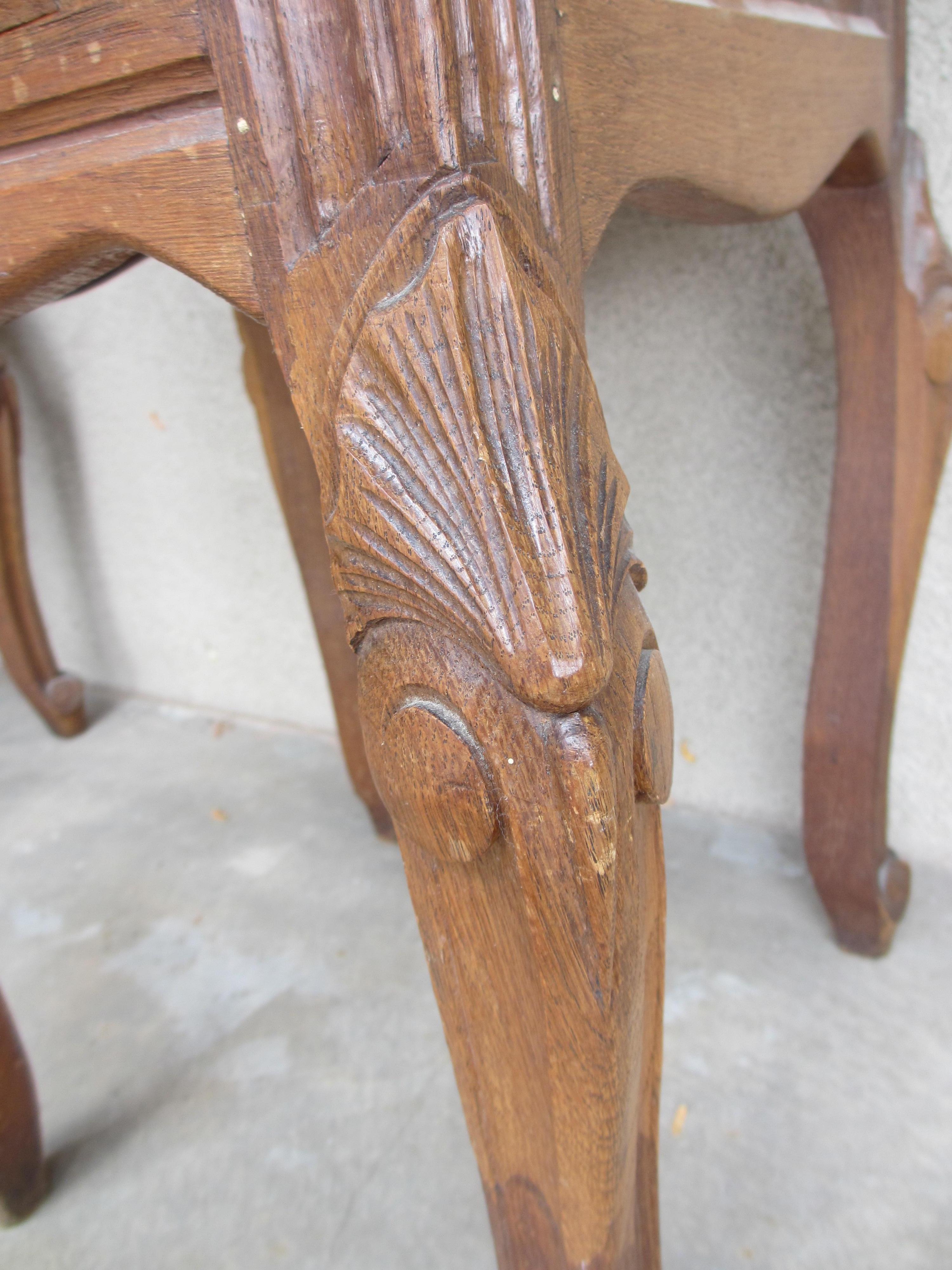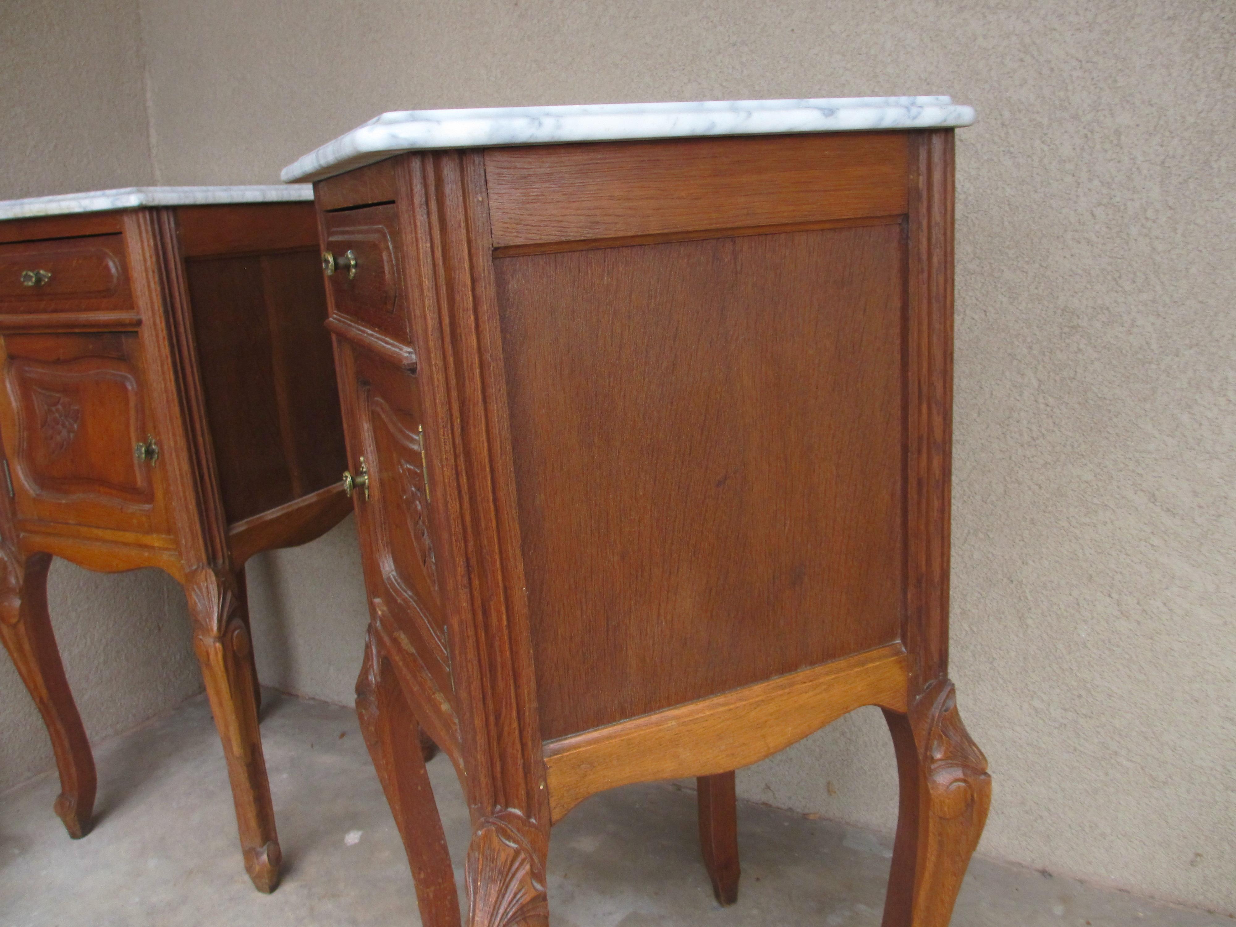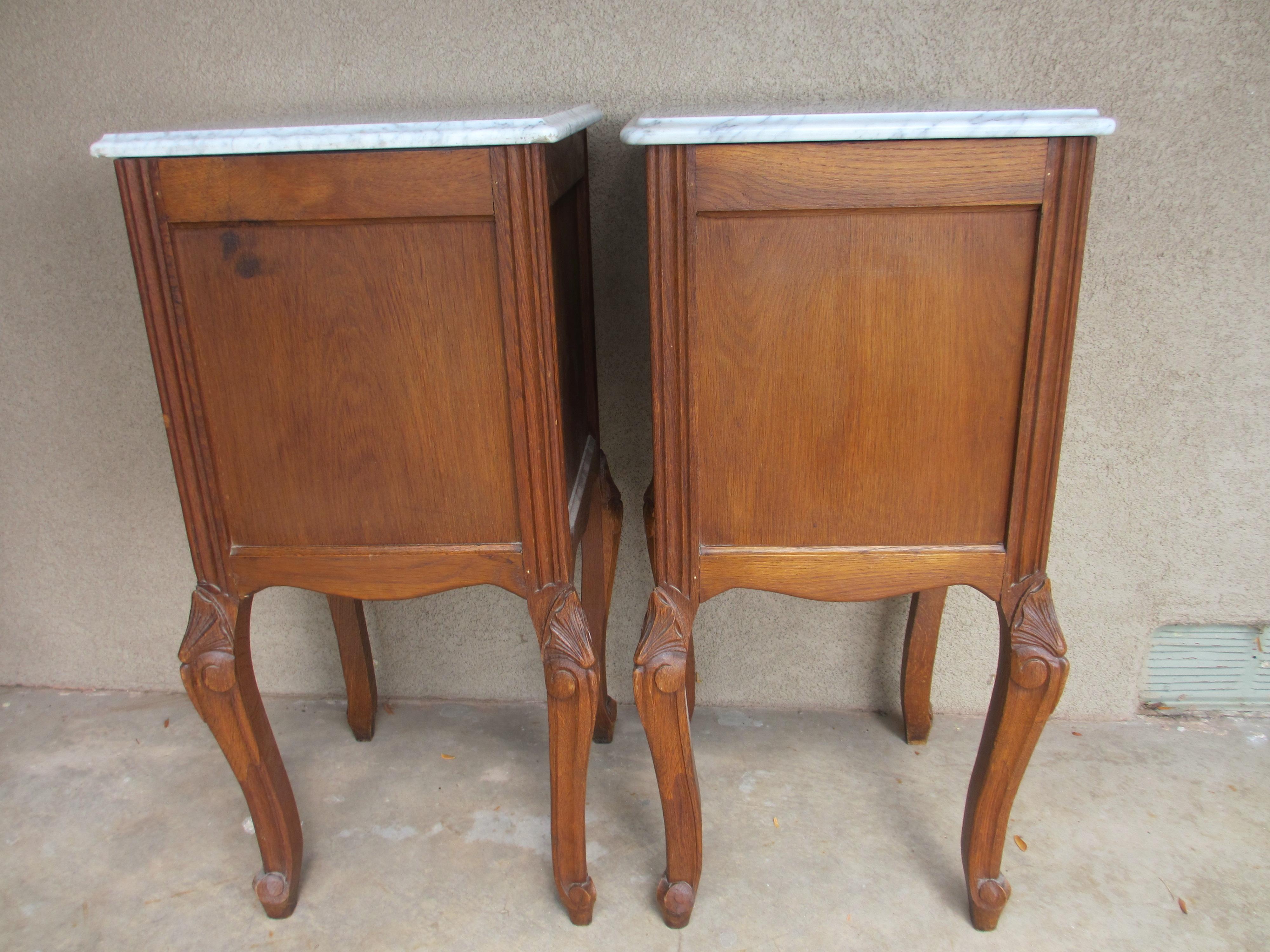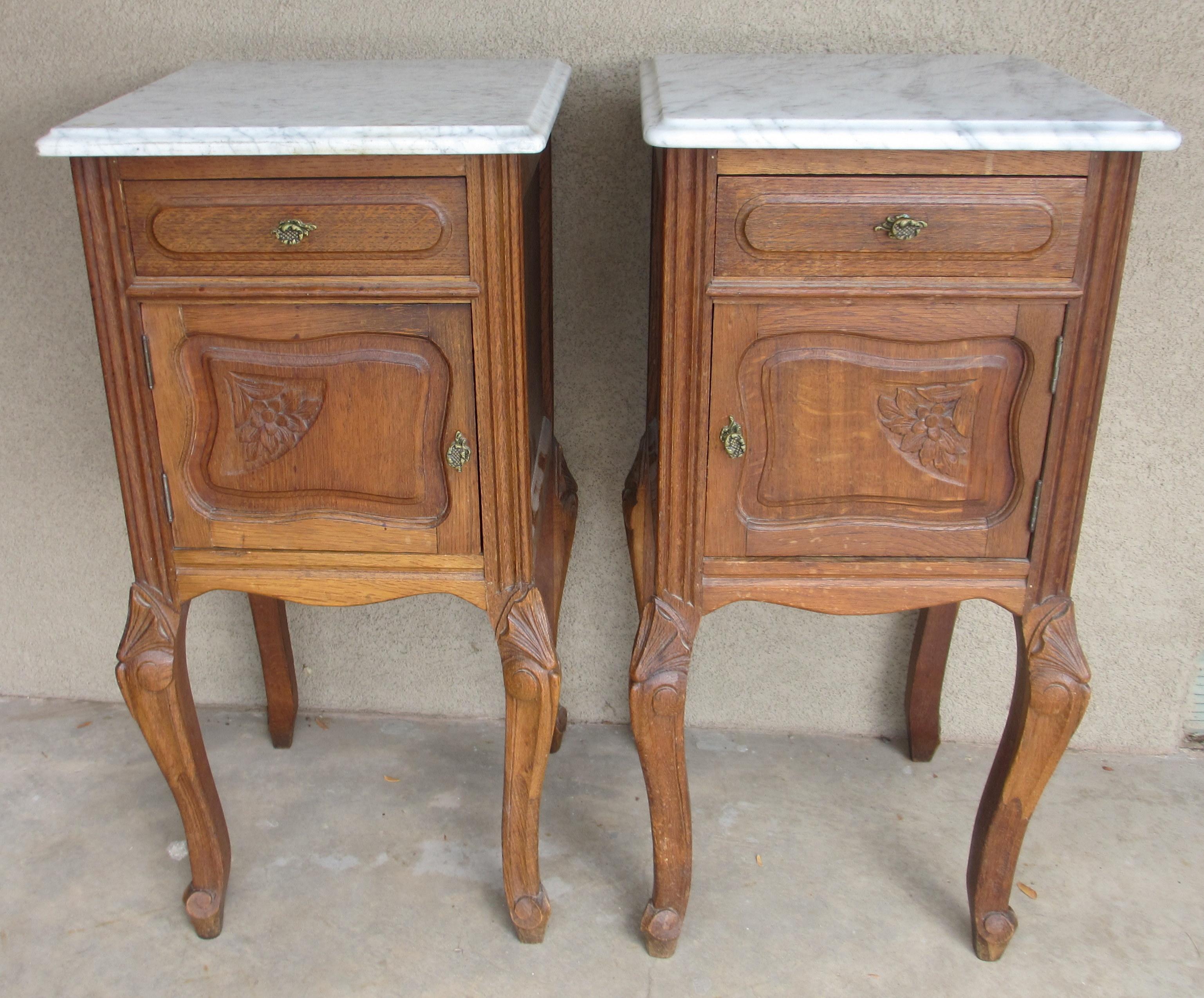 I have a pair of French marble-topped tables, circa 1920's, or so I was told when I inherited them about 17 years ago. I would like to know an estimate of the value of them. They are constructed of solid walnut for the frames, legs, and fronts of cabinets/drawers, and veneer on the sides and backs. They appear to be hand-carved. The marble tops measure 16 inches (41 cm) square, and they are about 33 inches (84 cm) tall. Any information you could give me on them, especially their fair market value, would be greatly appreciated, thanks!