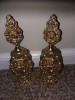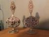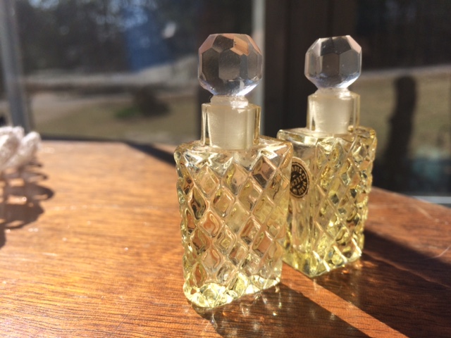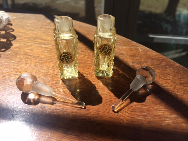 This pair of glass perfume bottles are approx 2 inches in height with the stopper in and almost 3/4 inch wide. The pattern is cut into the glass on 3 sides with the 4 side being flat - like the 2 were made to be placed side by side.