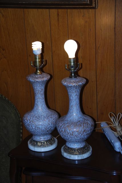 I have a pair of gold speckled and white lamps made out of glass. They are both on top of a metal base, gold-colored, possibly brass?? There is a possible marble base under the metal part. I do not know how to verify the materials.