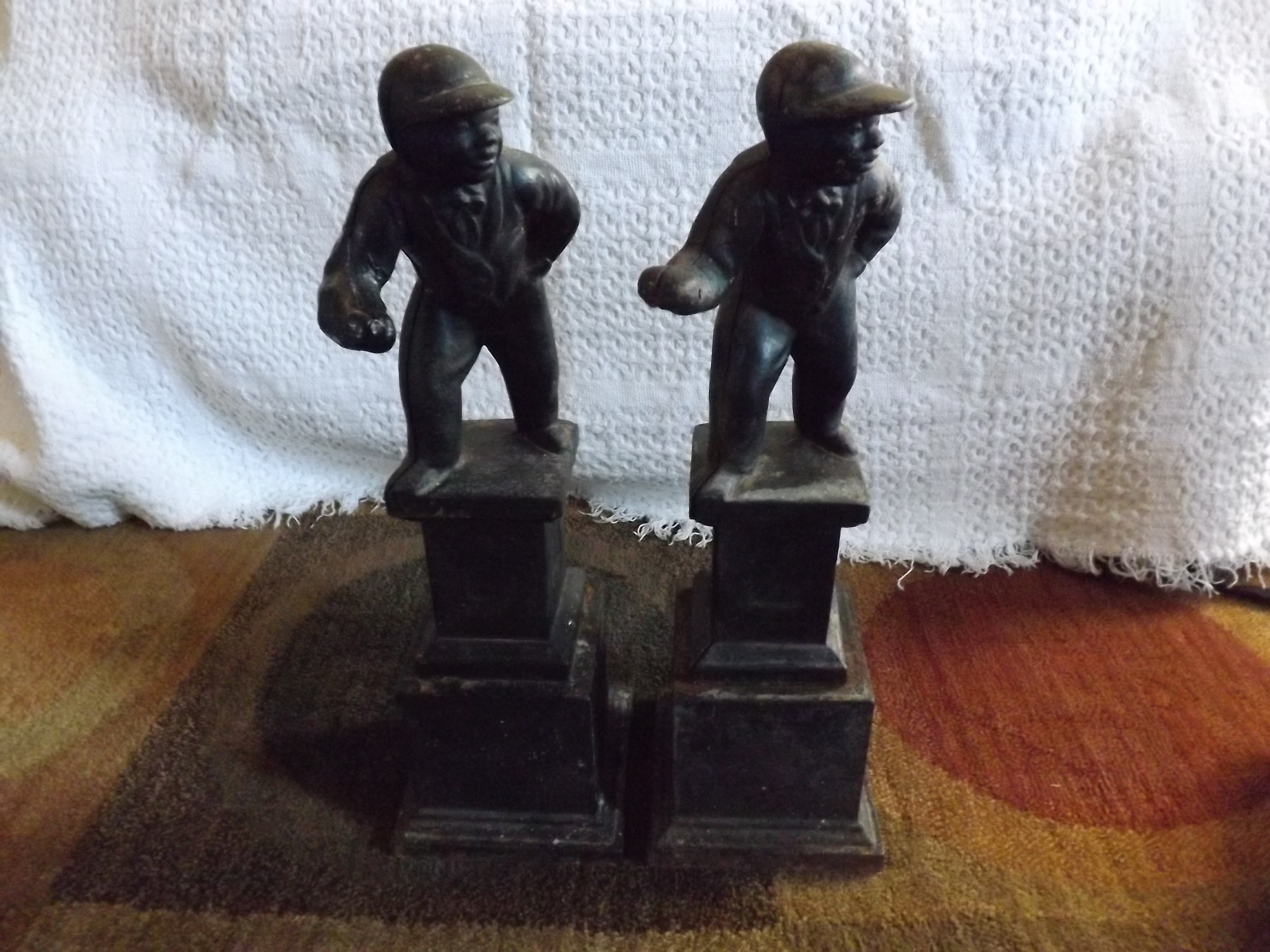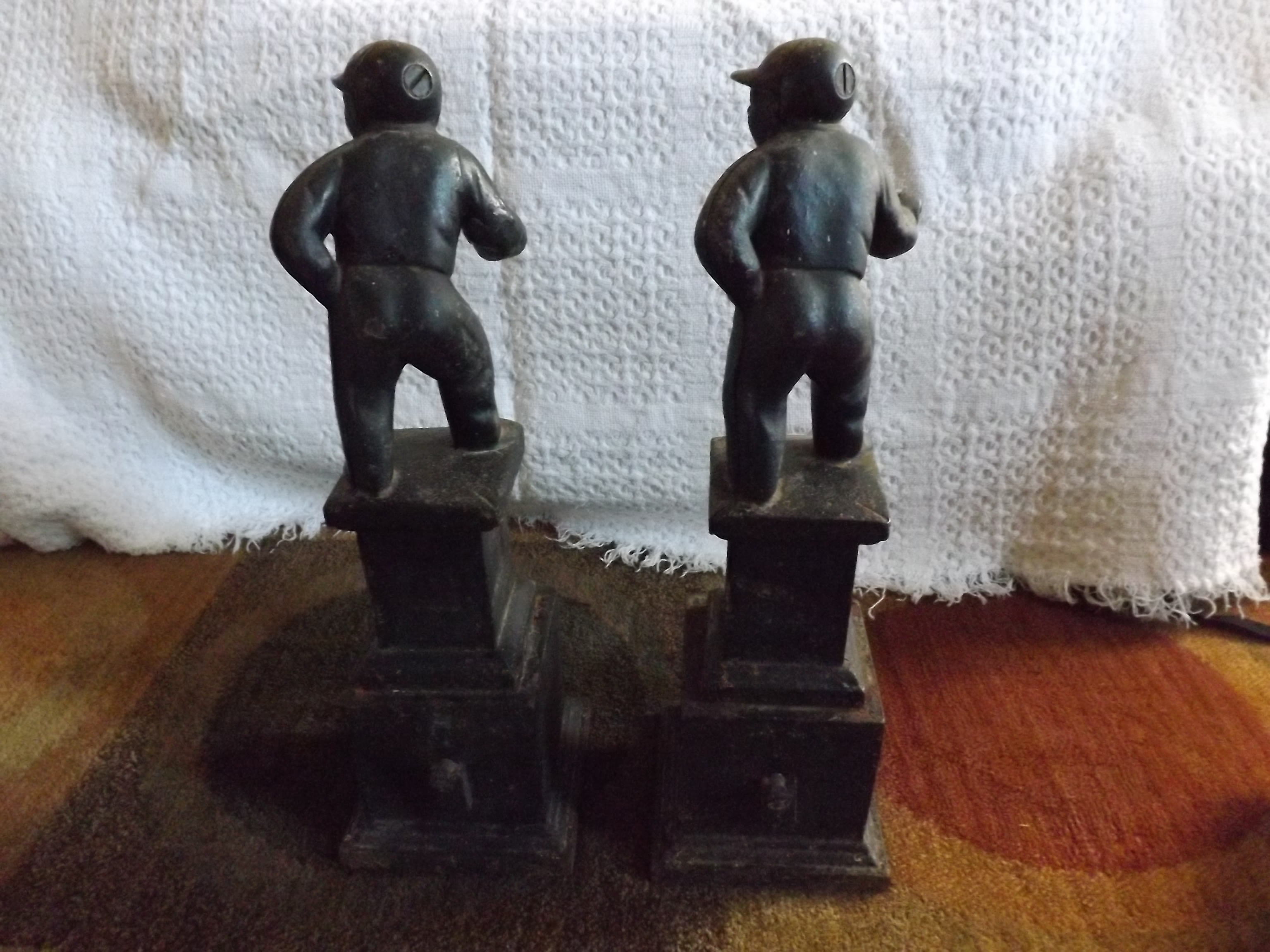 These guys are 16.5"s tall made of cast iron, the figures are made in two peices and held with a screw .the base is seperate from the figures and held with srews the fire place brackets are missing and the arm on one has been repaired I have looked and can find no info on them, would like to know when they were made and value Thanks