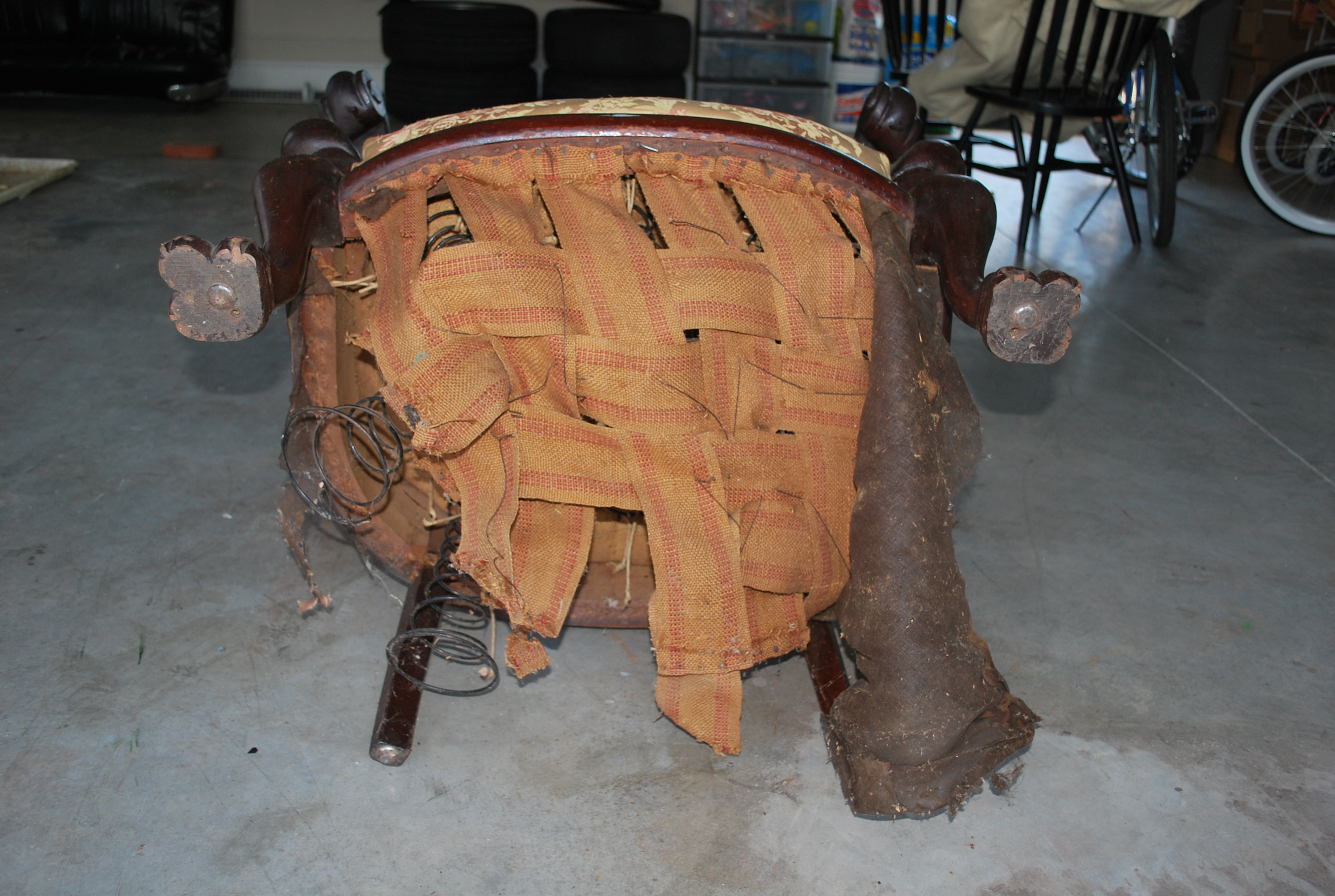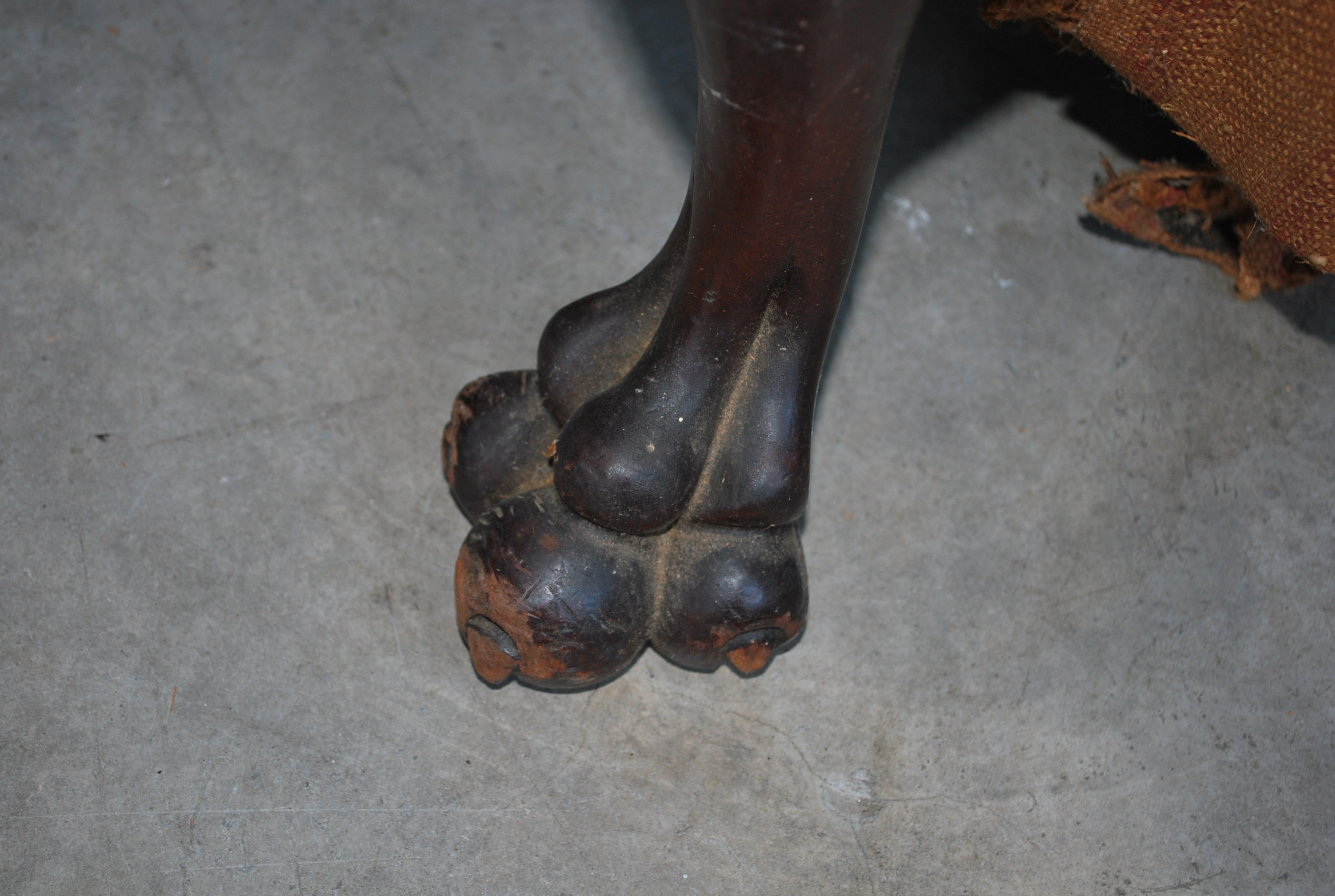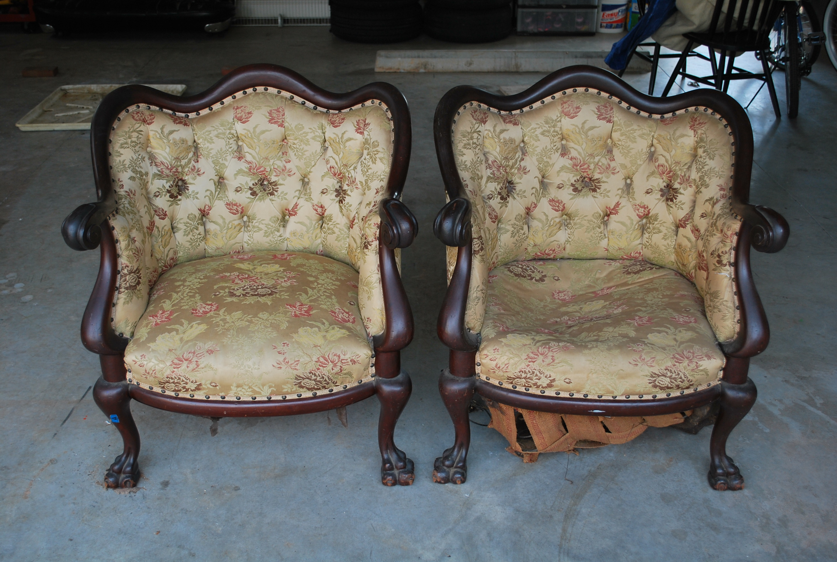 This is a pair of living room chairs once owned by my grandparents. The upholstery appears to be original and is in fair condition, thought it does need cleaning. The wood frame appears to be mahogany. The paw feet are worn. The bottom fabric and burlap that secures the seat springs on one of the chairs has come loose and needs to be repaired.