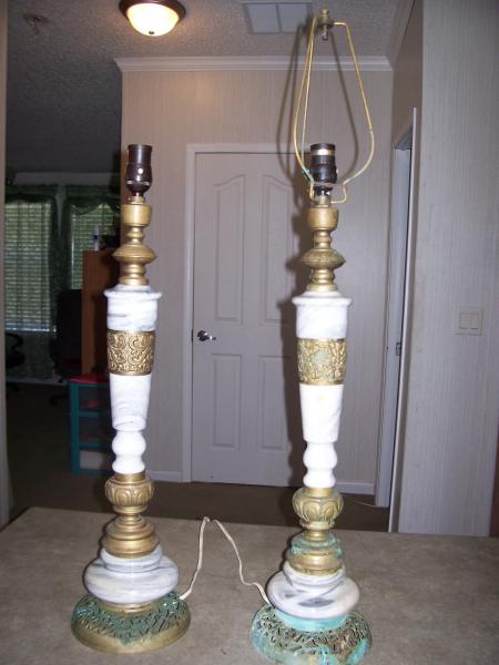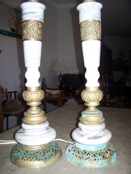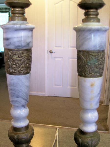 This is a pair of marble and brass lamps. The marble is white and gray. The base, cuffs and top are brass. The upper cuffs of the brass are detailed. One lamps has a pair of peacocks and the other lamp cuff has a dragon. Both lamps appear to be rewired and sockets don't appear original. Only have one cradle. Both lamps do work though. Discolored area on marble below the brass cuff with the dragons on it. Patina remains intact since I'm not sure how to remove it or if it should be removed. Both lamps have had only a wiping off with water damped cloth. Any info would be greatly appreciated.