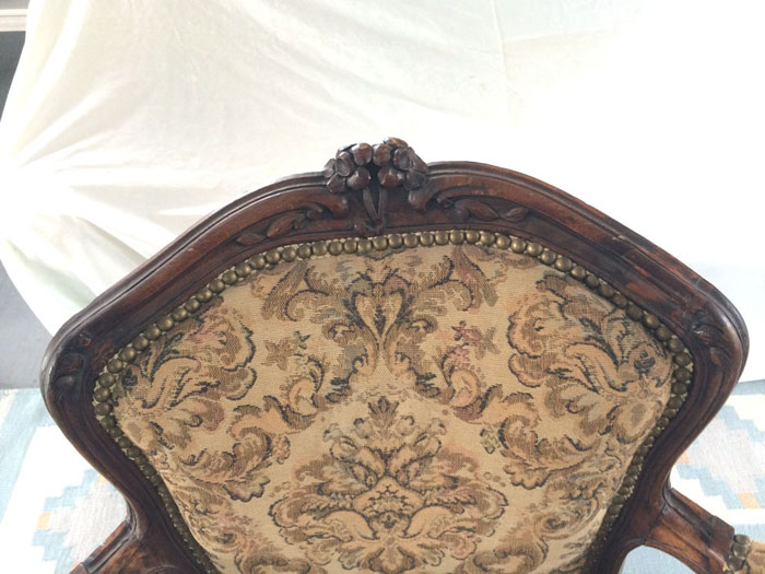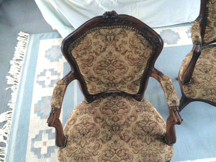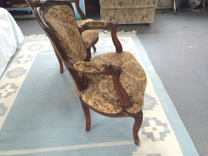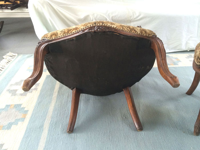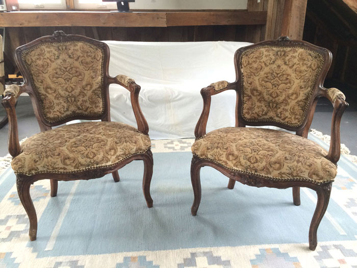 Antique matching parlor chairs. Purchased at antique store 18 years ago. Age, brand, orign unknown. Not altered or refinished by us in any way. Excellent condition.