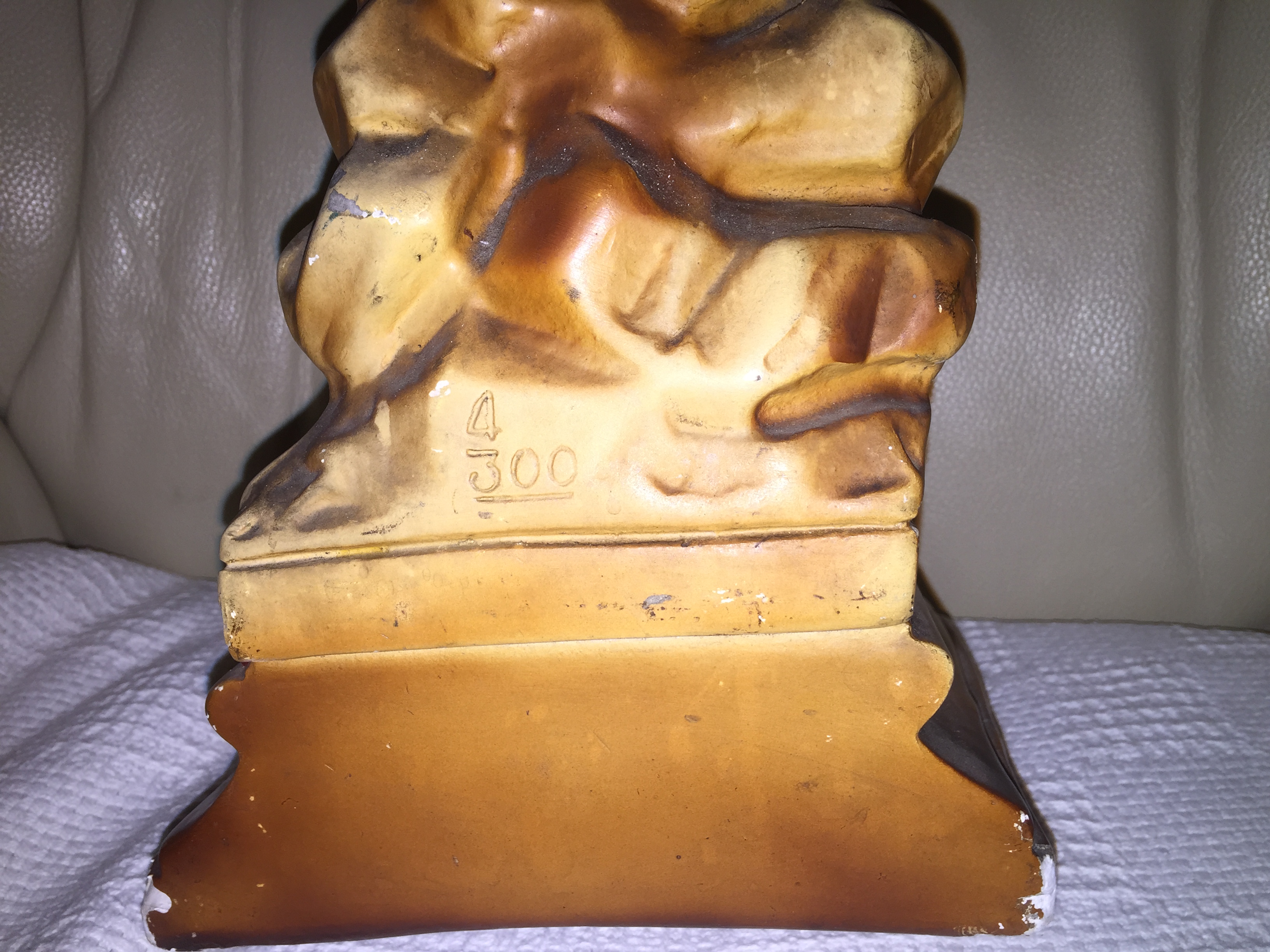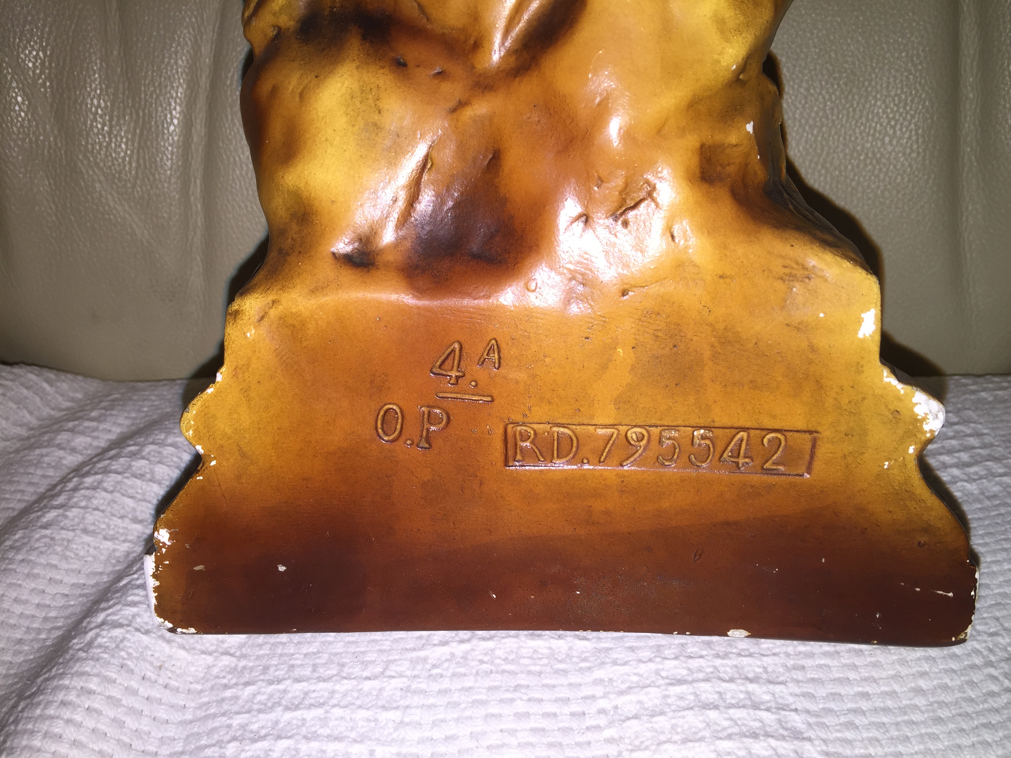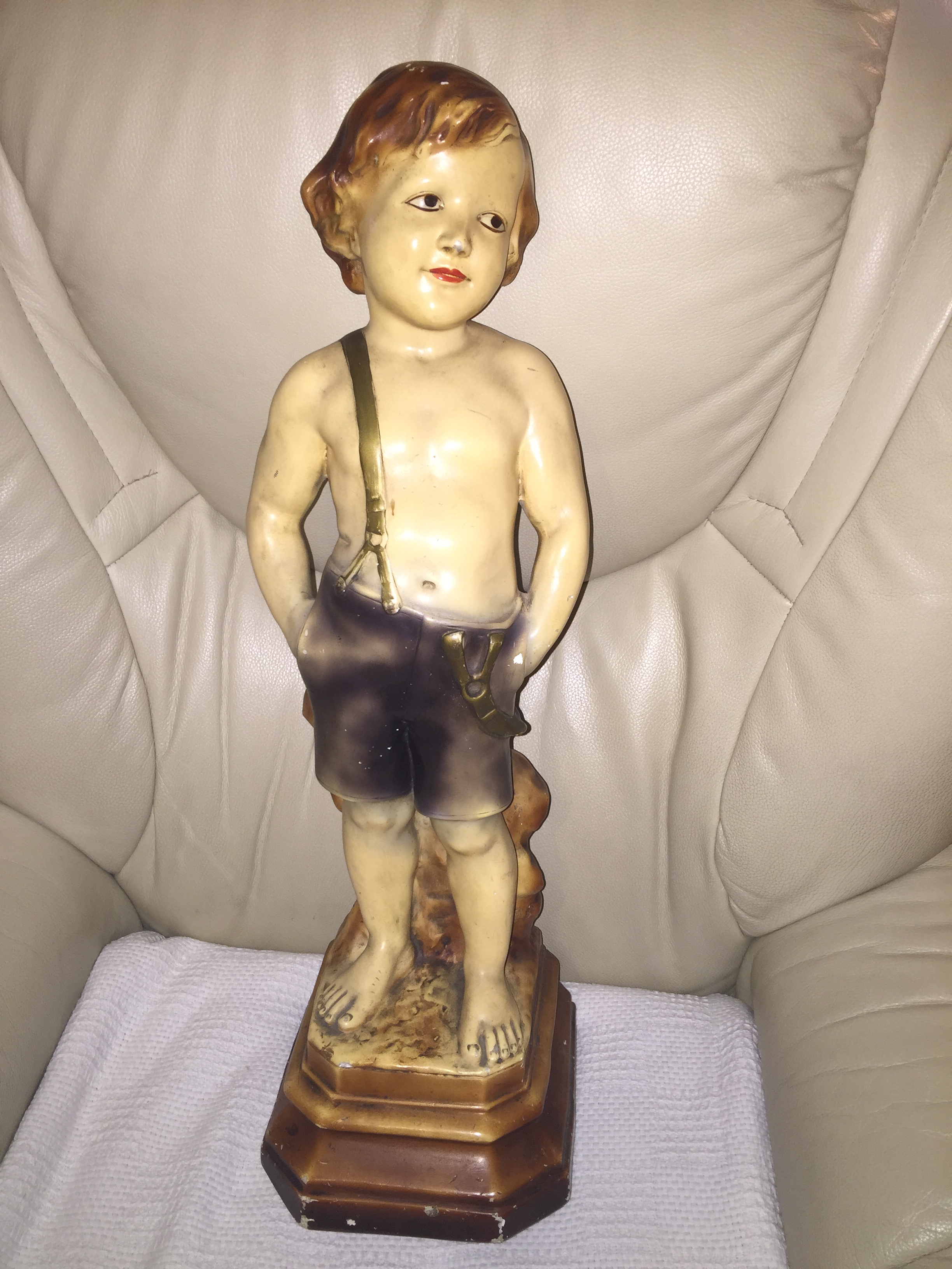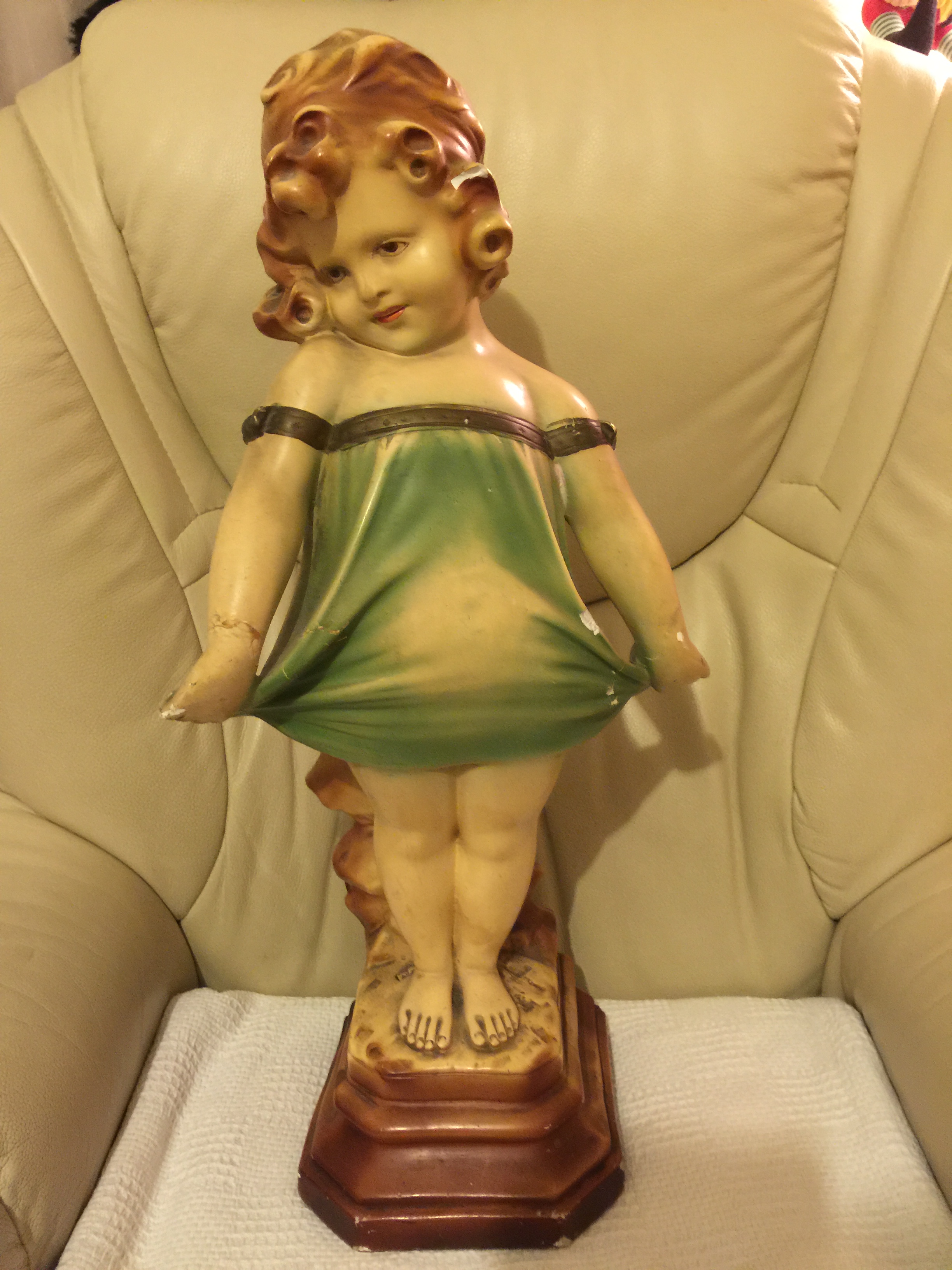 A pair of moulded plaster figures 24" tall, very old, damage on both.  Think they might be called The Shy Girl and the Shy Boy.  some letters on the back of both figures.  Rd 795542