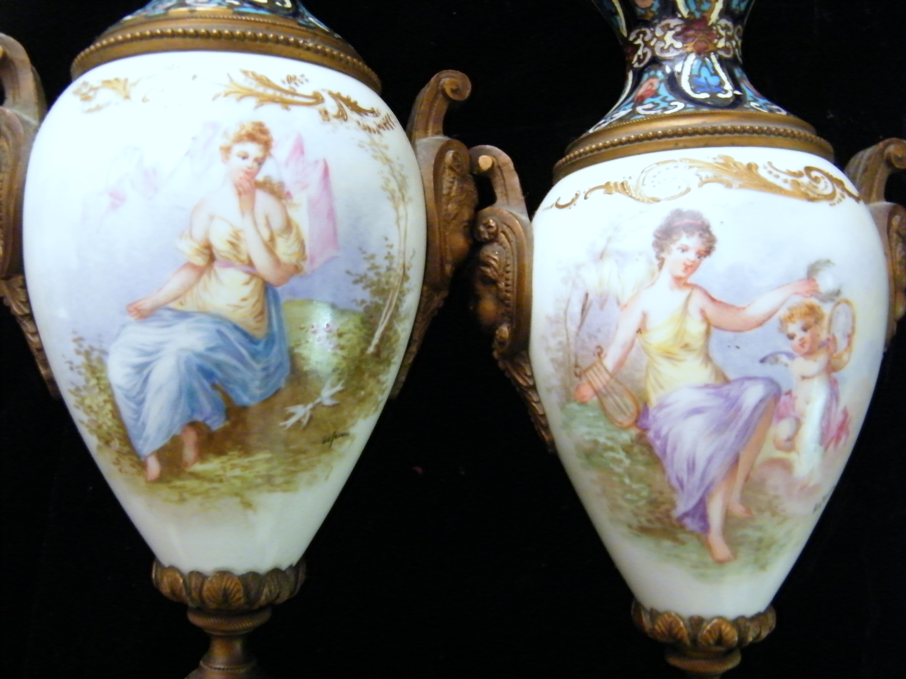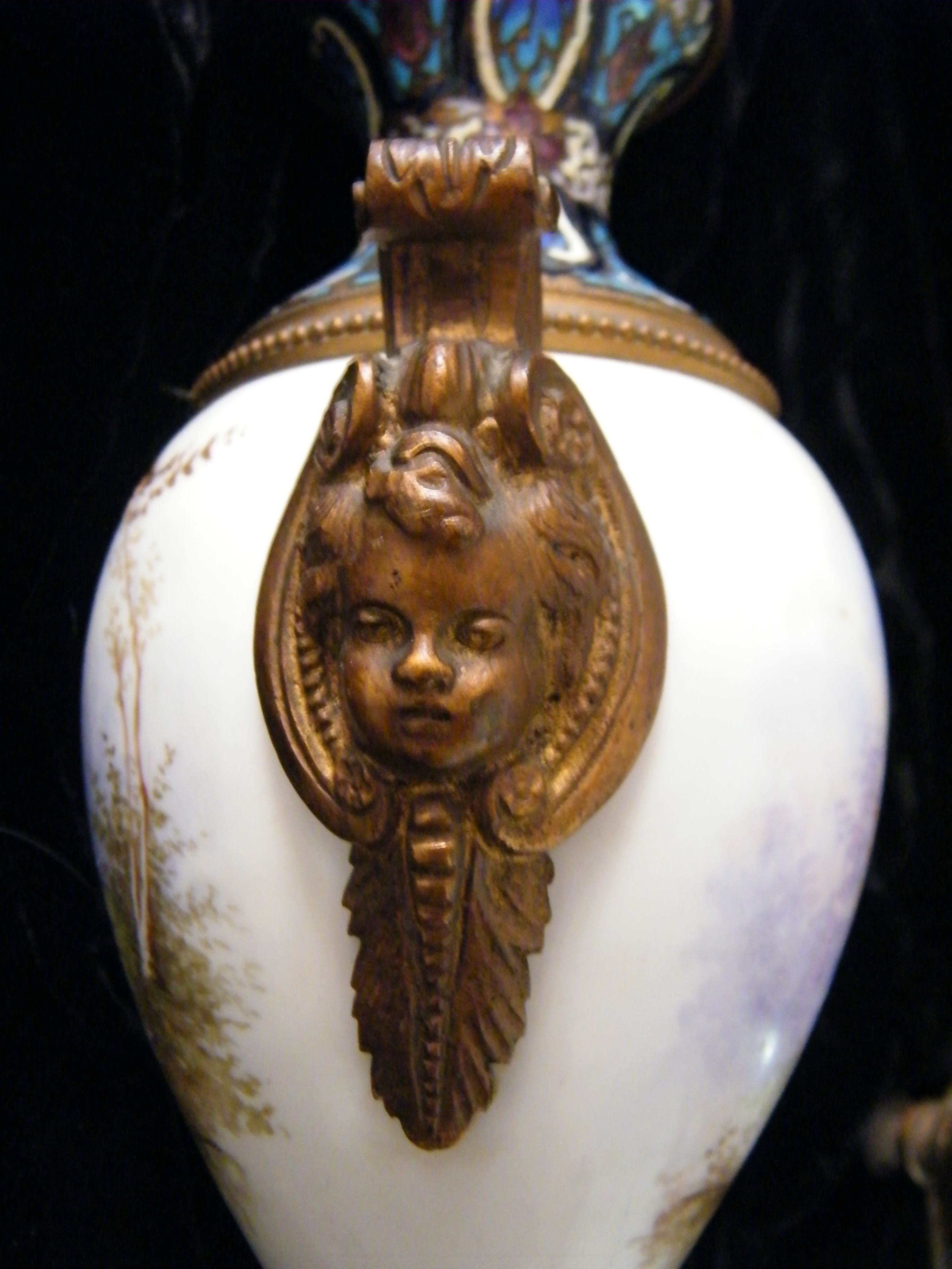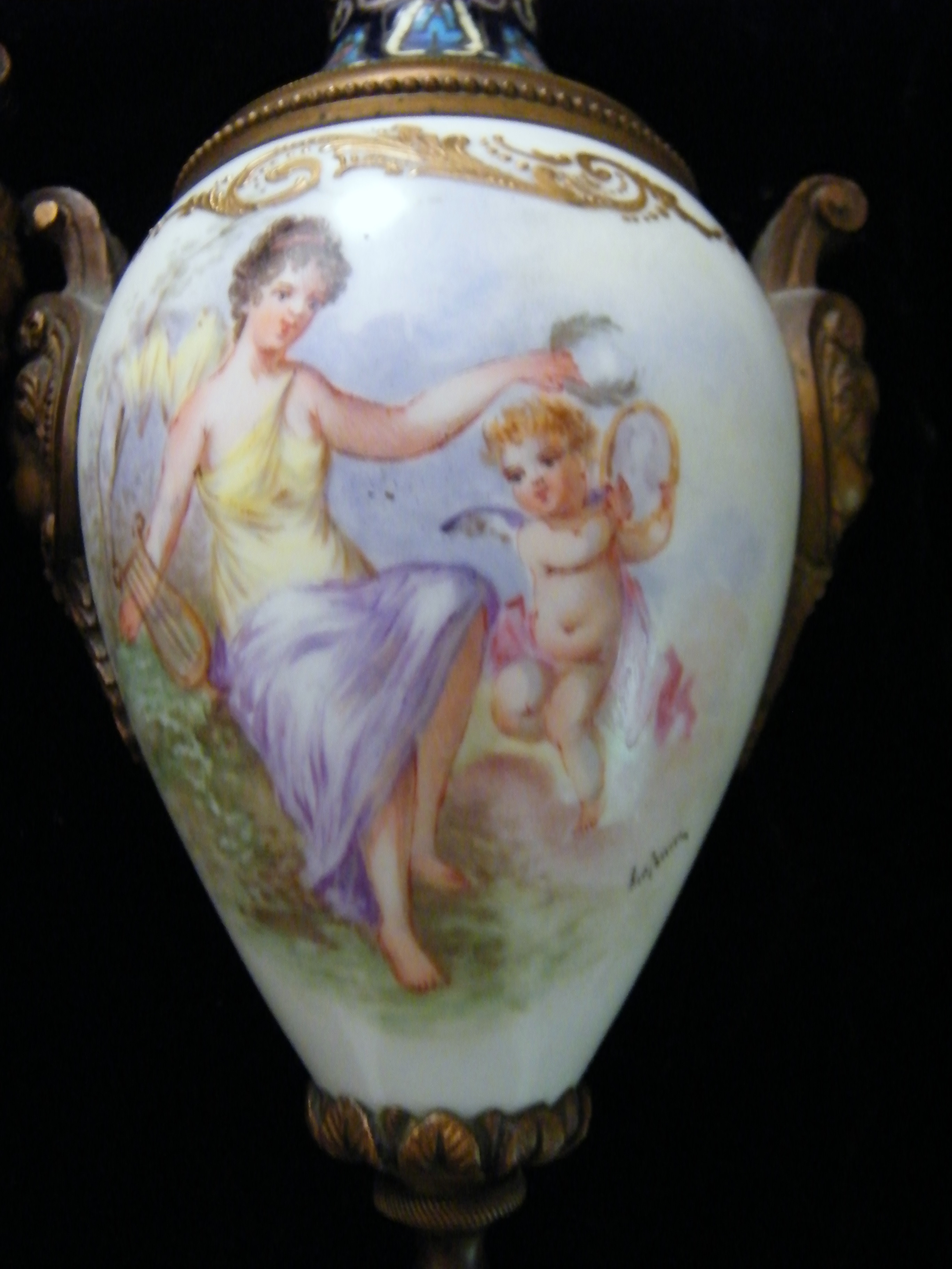 I am needing an appraisal for these two beautiful candle holders. Each candleholder has beautiful hand painted scenes on a white porcelain bulb that is in the middle of the brass(or metal) parts. There are four different painted scenes. There are brass cherub heads on both sides of each holder. The tops and bottoms have colored enameled designs on them. They have quite unusual bottoms or "feet". Not sure, but perhaps they were attached to something much larger originally and maybe not, I just don't know. I did not think to get a picture of the bottoms, but they have six stems that they sit on. The painted scenes are a seated lady, another seated lady with a cherub next to her. She is holding a harp and the cherub is holding it's Halo. On the backside of one holder there is a painting of a gazebo with trees around it. On the other, there is a painting of some broken columns, also with trees around it. They are marked on the painted areas. It is a bit difficult to decipher, but I believe it says "le franc".