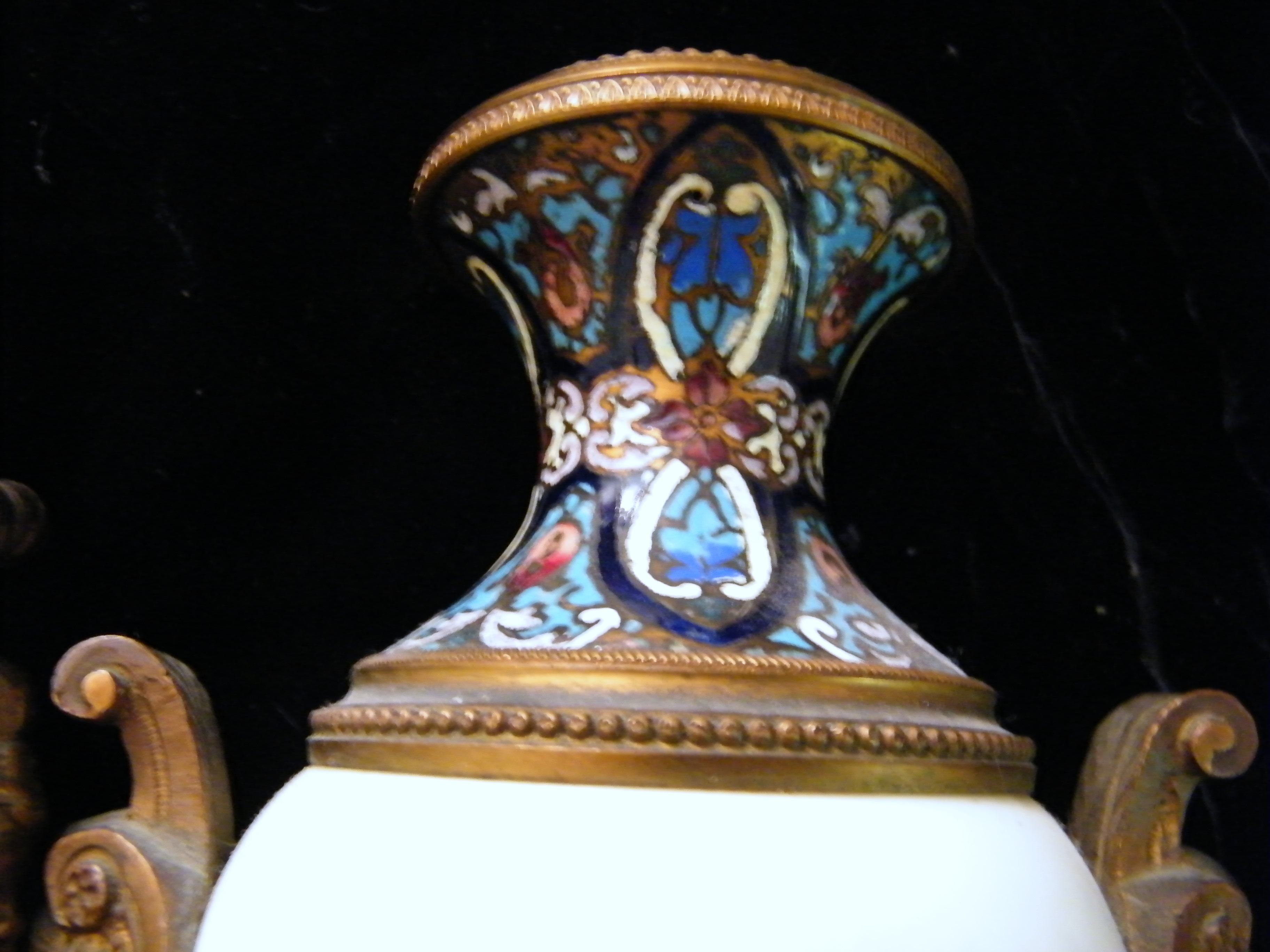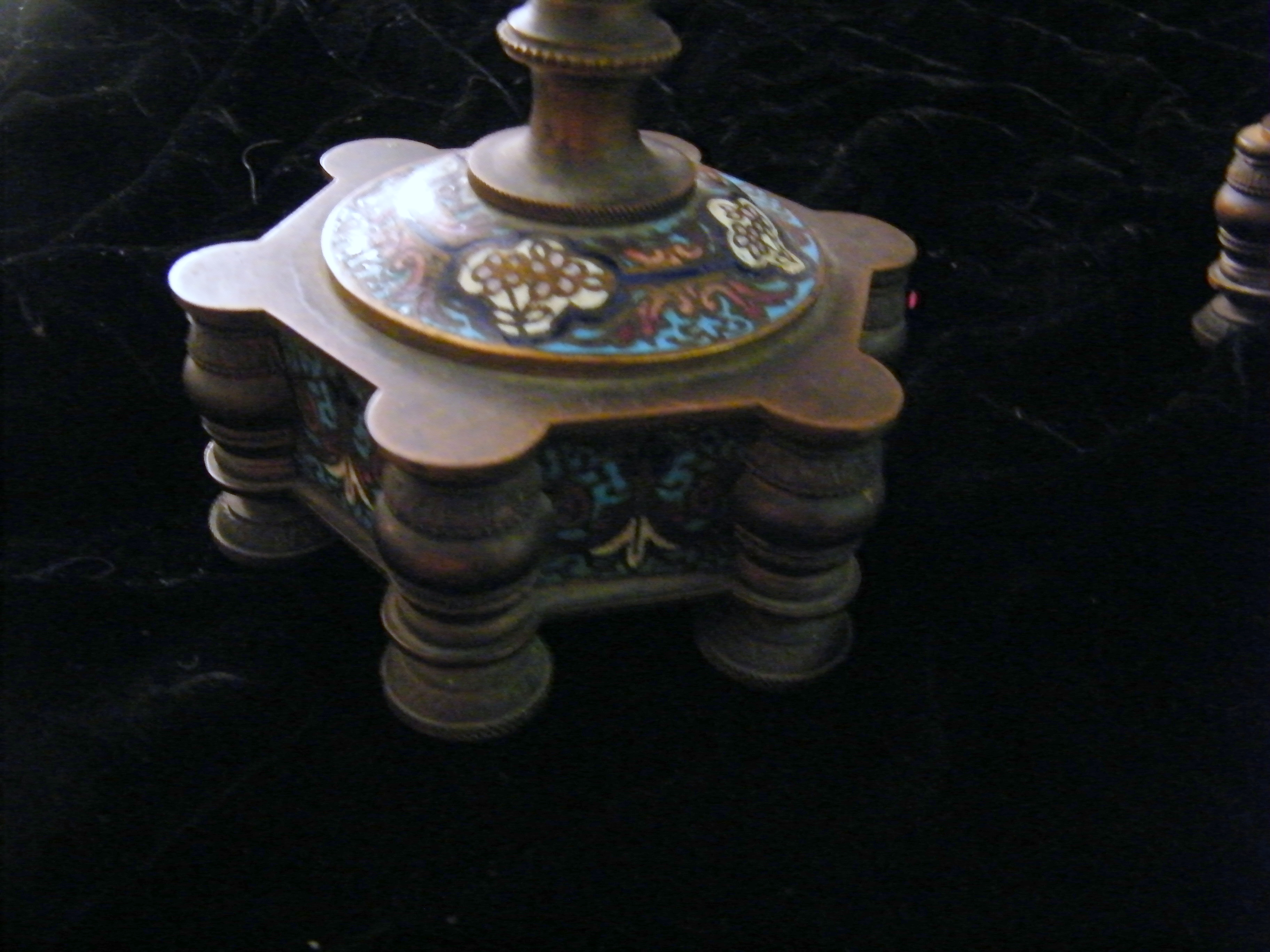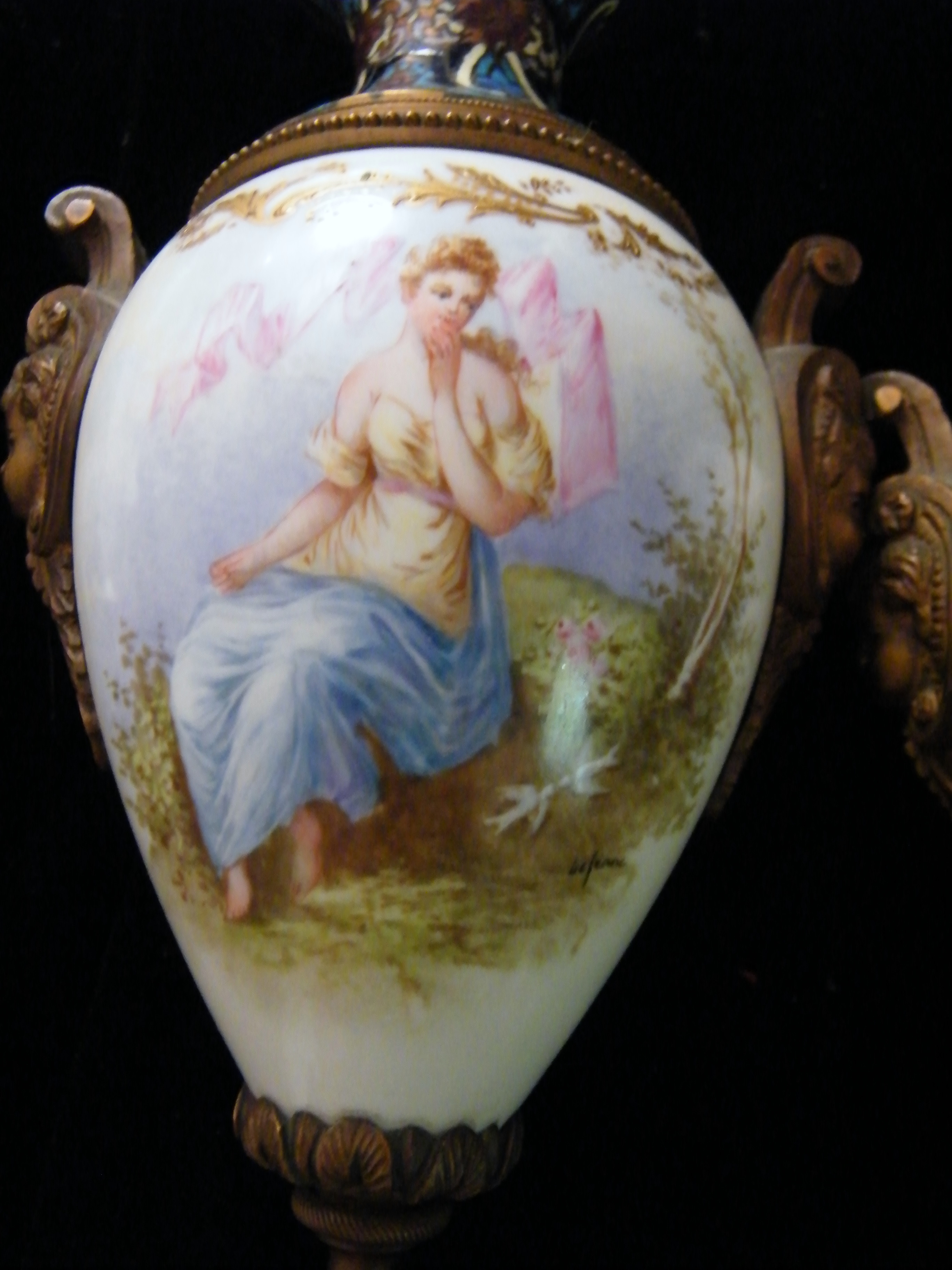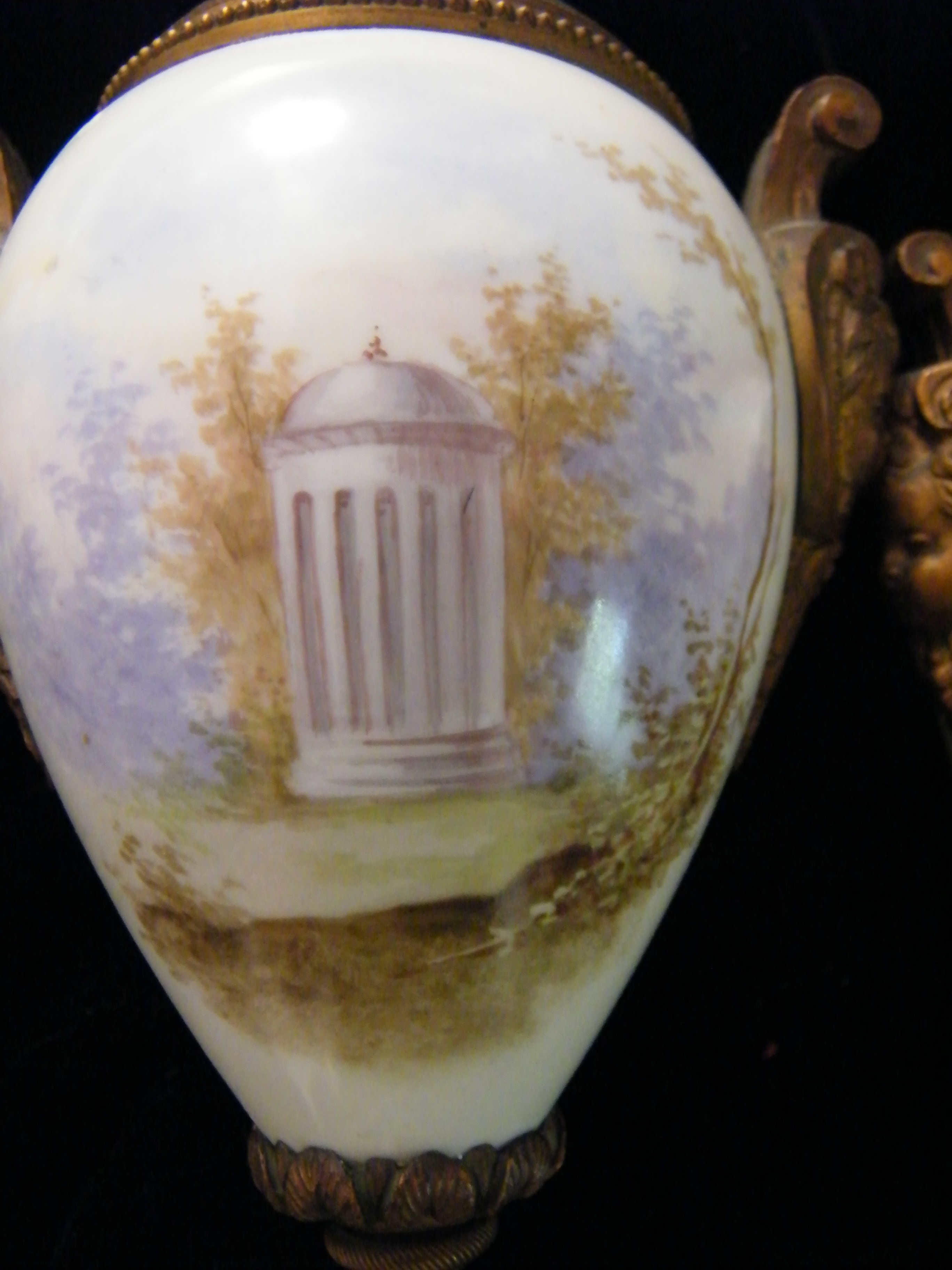 I am needing an appraisal for these two beautiful candle holders. Each candleholder has beautiful hand painted scenes on a white porcelain bulb that is in the middle of the brass(or metal) parts. There are four different painted scenes. There are brass cherub heads on both sides of each holder. The tops and bottoms have colored enameled designs on them. They have quite unusual bottoms or "feet". Not sure, but perhaps they were attached to something much larger originally and maybe not, I just don't know. I did not think to get a picture of the bottoms, but they have six stems that they sit on. The painted scenes are a seated lady, another seated lady with a cherub next to her. She is holding a harp and the cherub is holding it's Halo. On the backside of one holder there is a painting of a gazebo with trees around it. On the other, there is a painting of some broken columns, also with trees around it. They are marked on the painted areas. It is a bit difficult to decipher, but I believe it says "le franc".