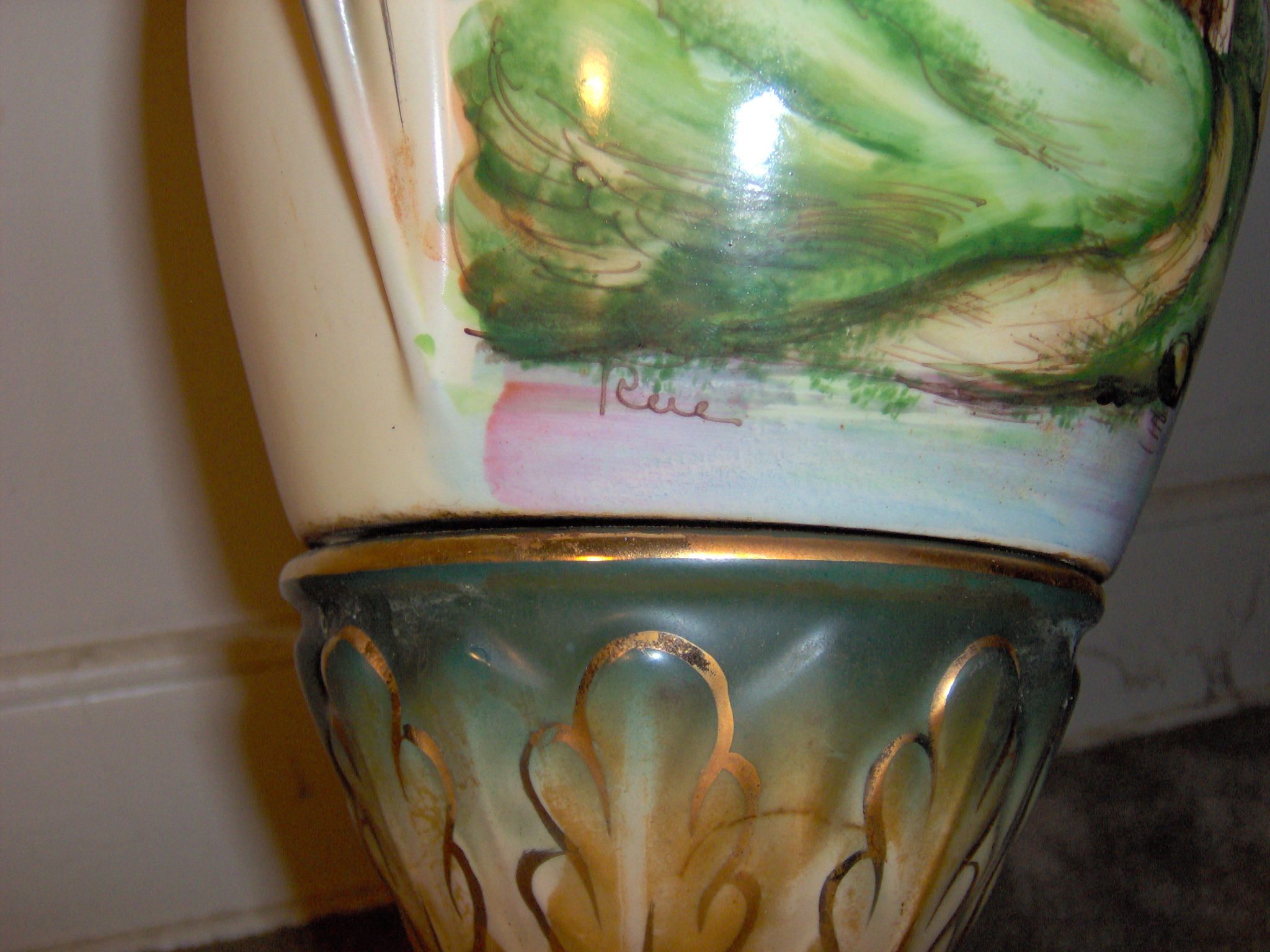 The lamps stand 36 inches from base to top of finial. They sit on a pierced metal base and the cherubs holding up one of the urns are an unknown metal. The lamp with the scene (that runs completely around the lamp) is signed by the artist. The name is Rue or perhaps Rere or Rire (I can't tell)