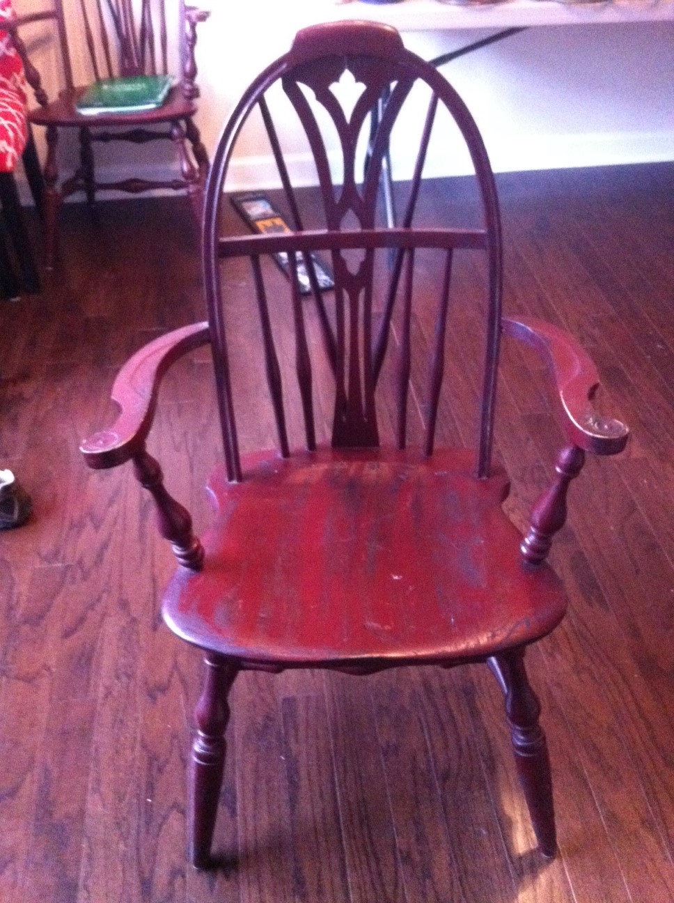 These are two Reischman Chair from the label, they are different than any I have seen online, they are a windsor style chair but with turned legs, and carved arms. They are also braceback and have a center panel different than any I have seen online (I have seen the wagon wheel but nothing like this. They are red in color, I don't know the type of finish or if this is original.