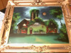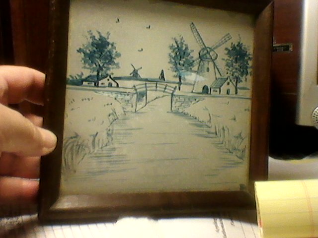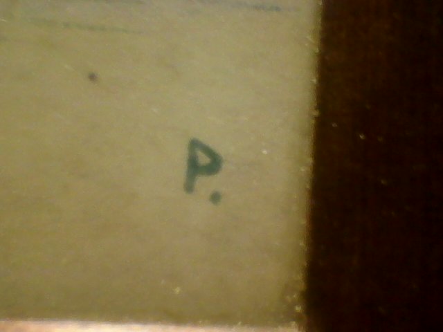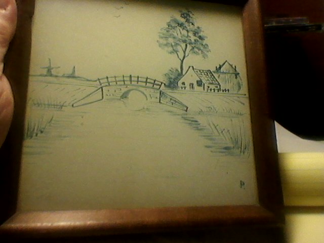 Pair of reversed glass drawings. Ink is blue with ivory background. One is signed in corner with a "P." One is in very good shape because the protective backing is still there. The other one has lost the protective backing and some of the ivory background is thinning. 6 inches square.