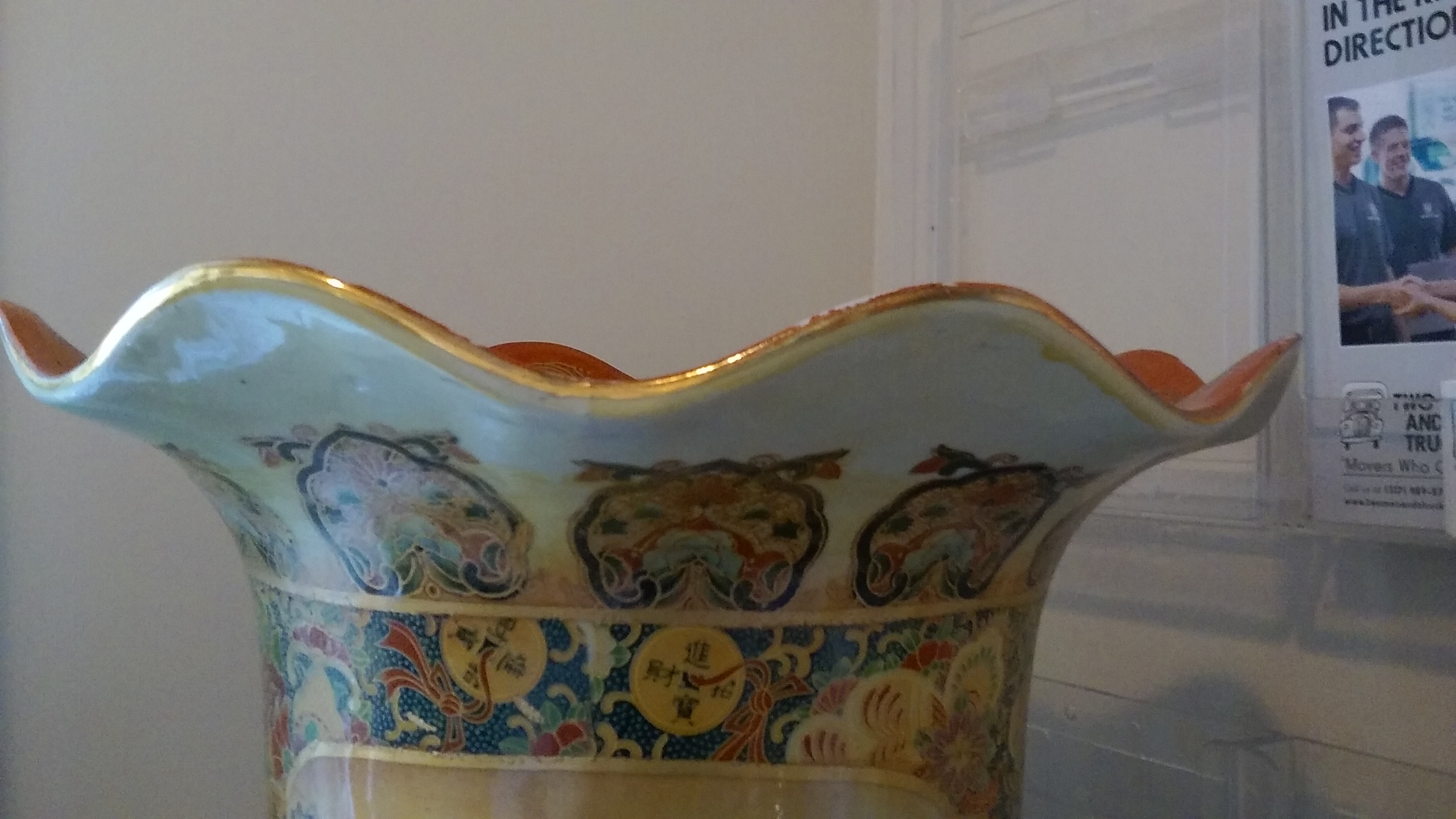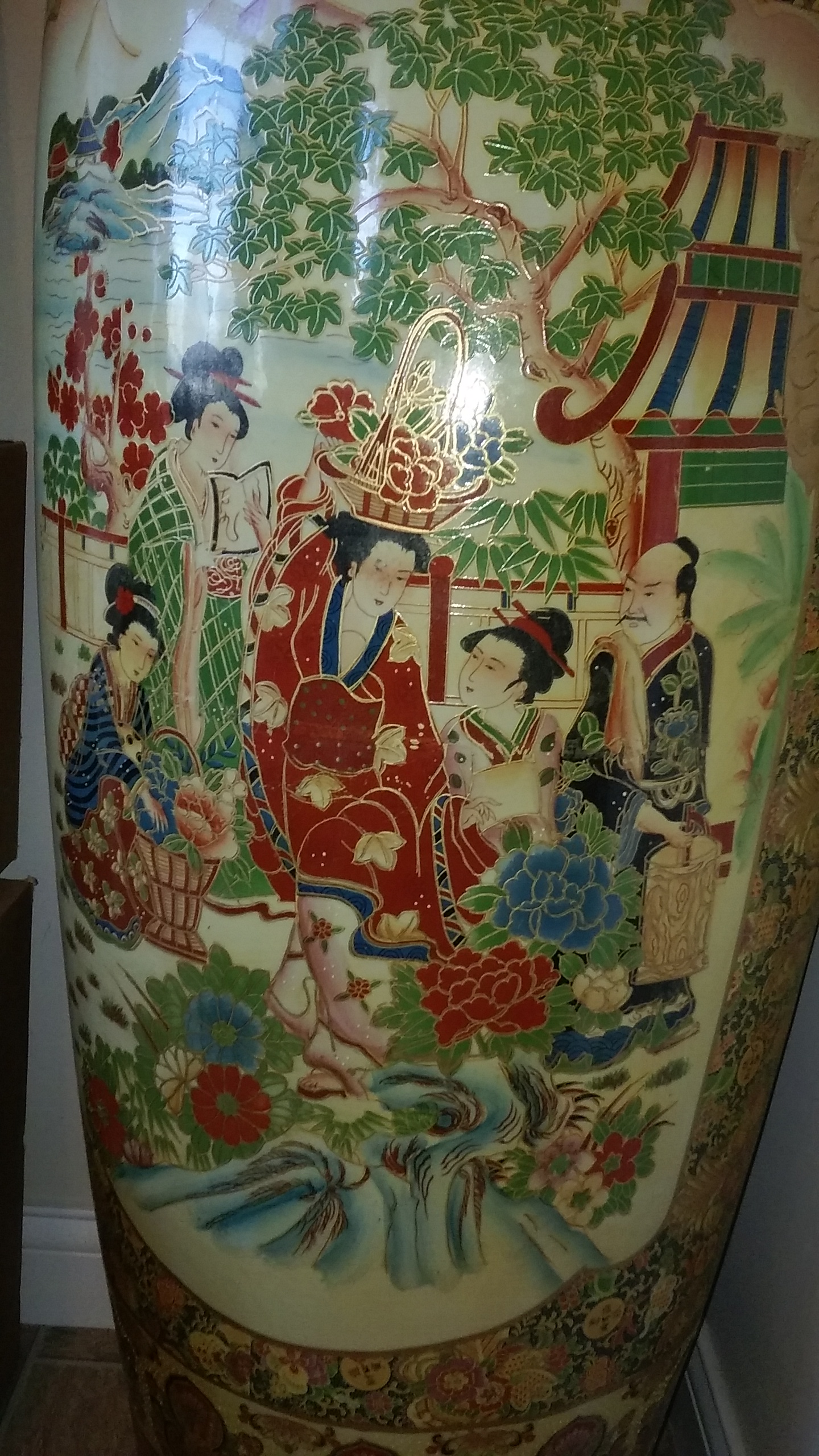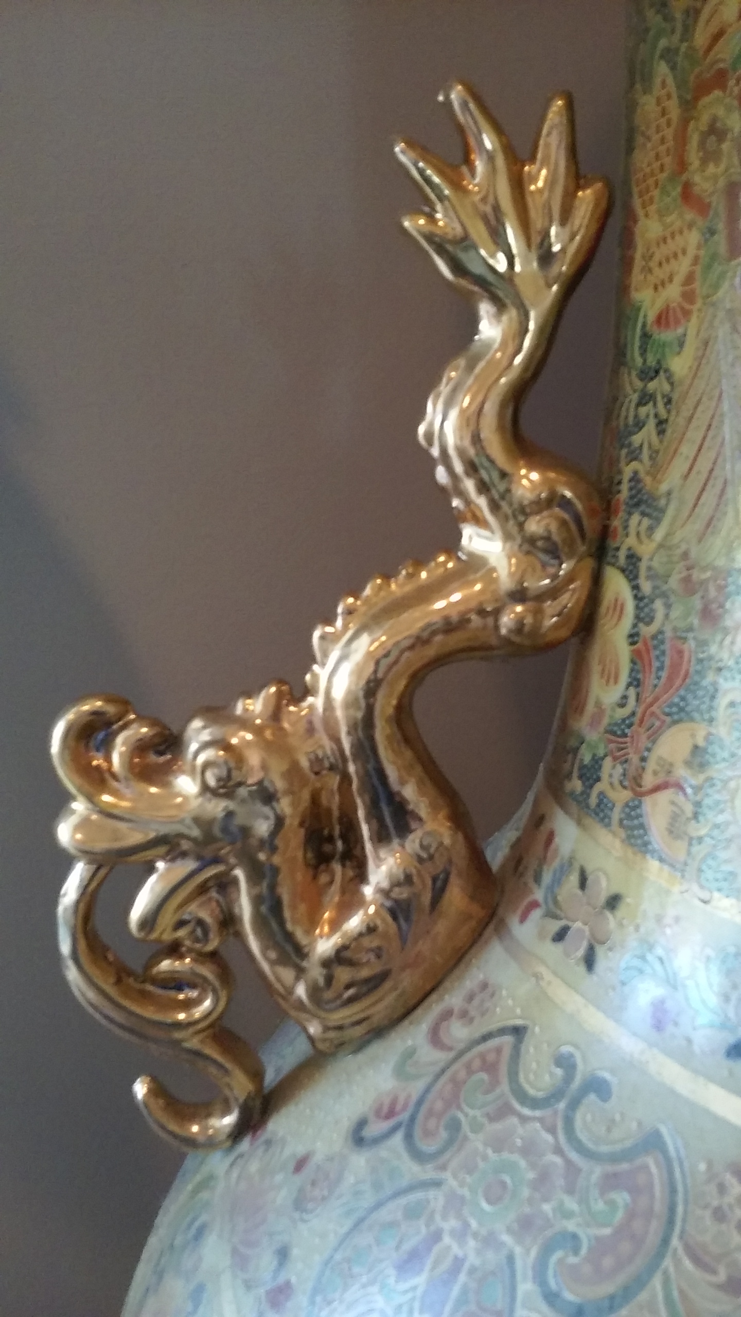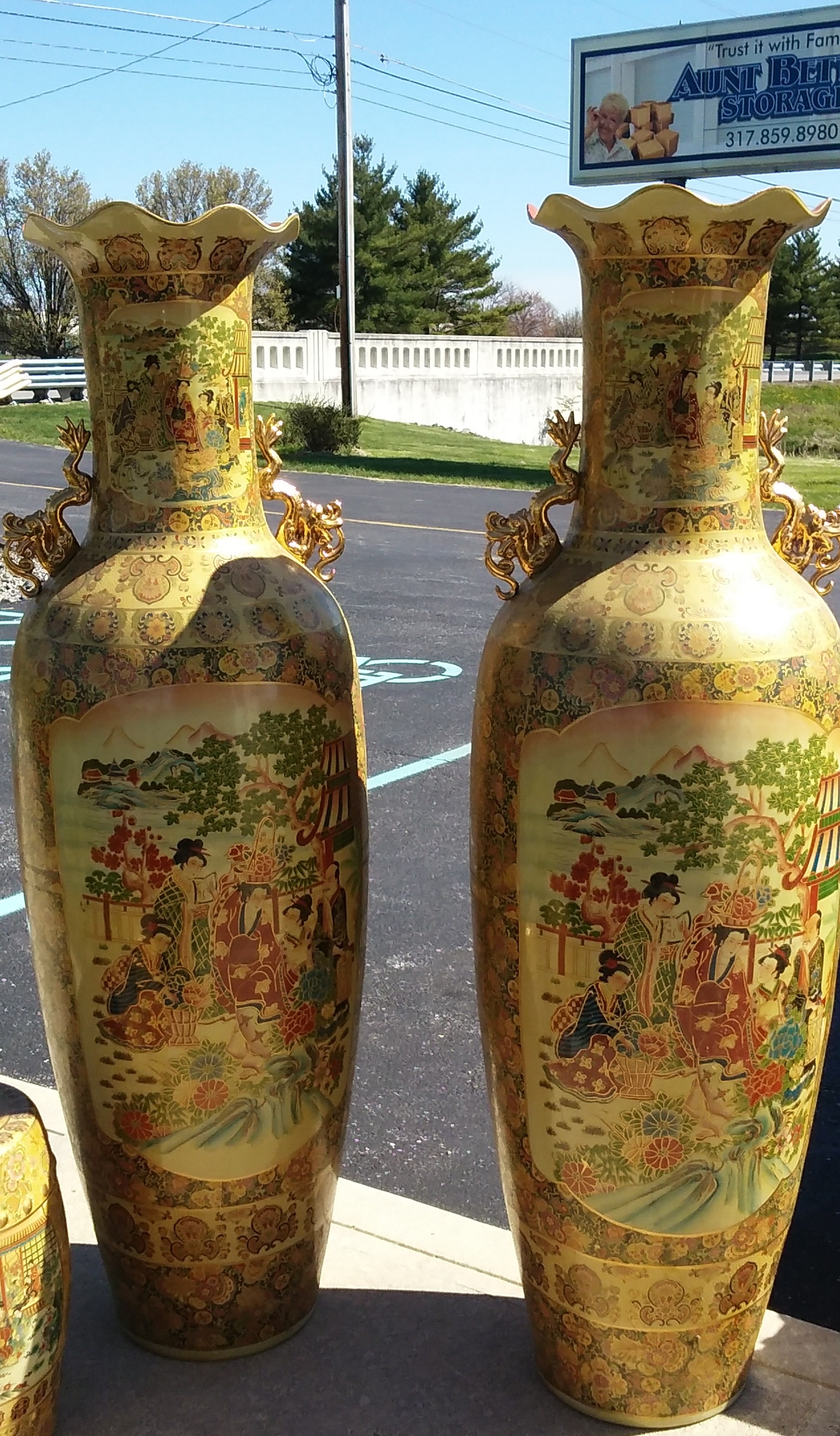 Matching Japanese Satsuma Vases, five feet tall with gilt dragon handles. Colors are bright with no damage or chips.