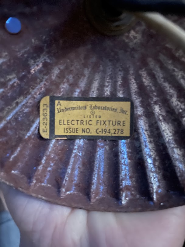 no marks except for the one sticker on the part that connects to the wall that says underwriters laboratories. inc. electric fixture issue no.C-194,278 on side of that it has E-23633