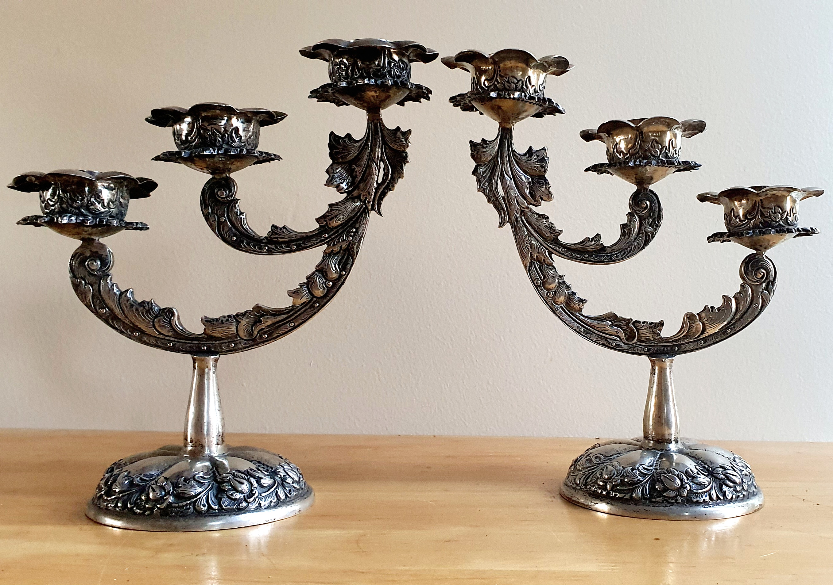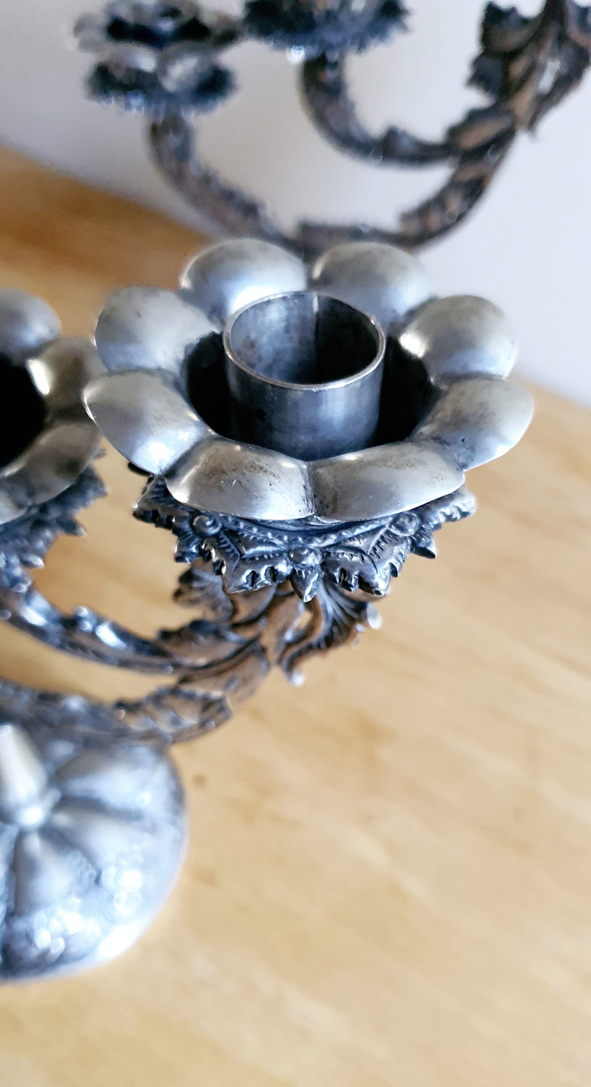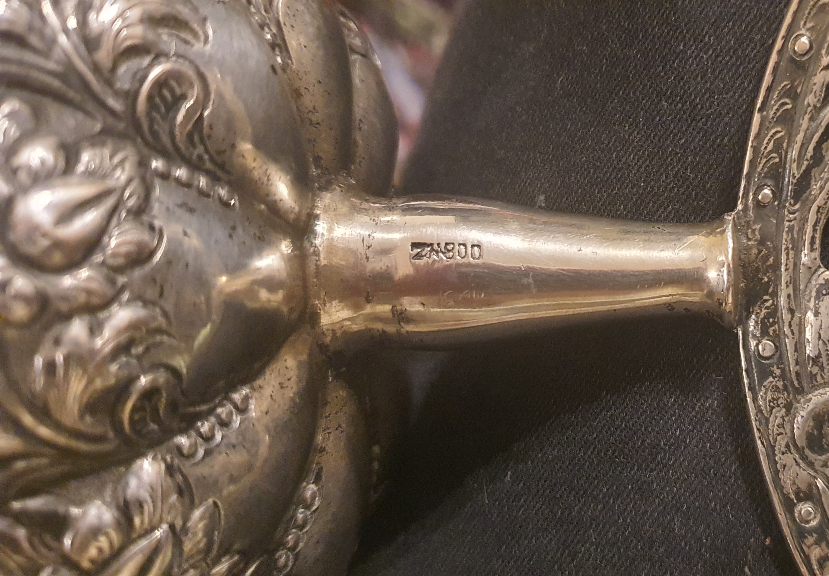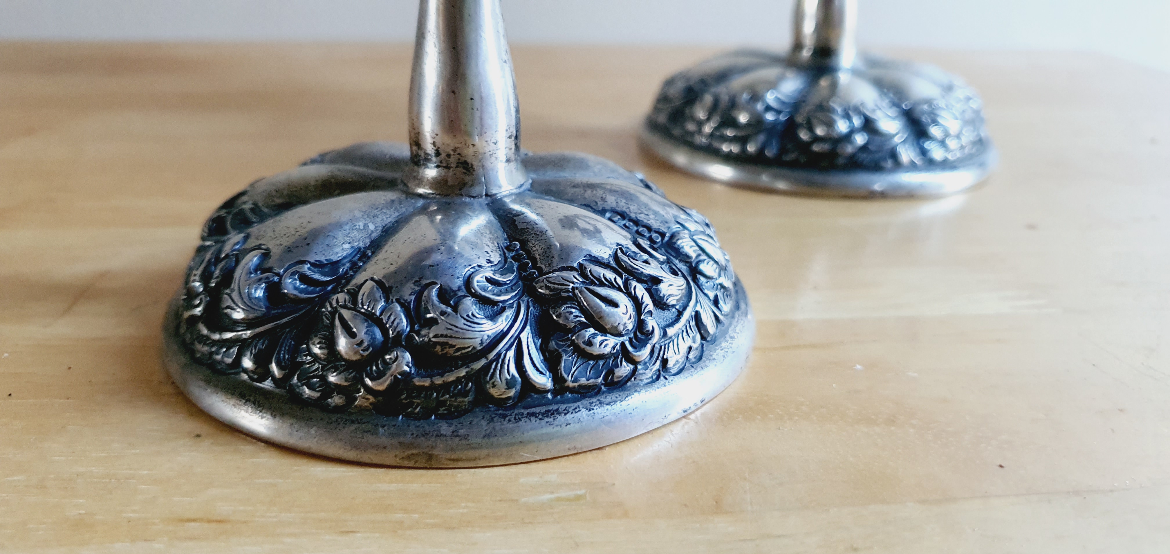 Pair of silver stamped candlestick holders. Detailed flower, leaf and vine theme. Stamp on both stems ZM800. Stamped letters and numbers indicate that this item is of age. Possibly Art Nouveau?