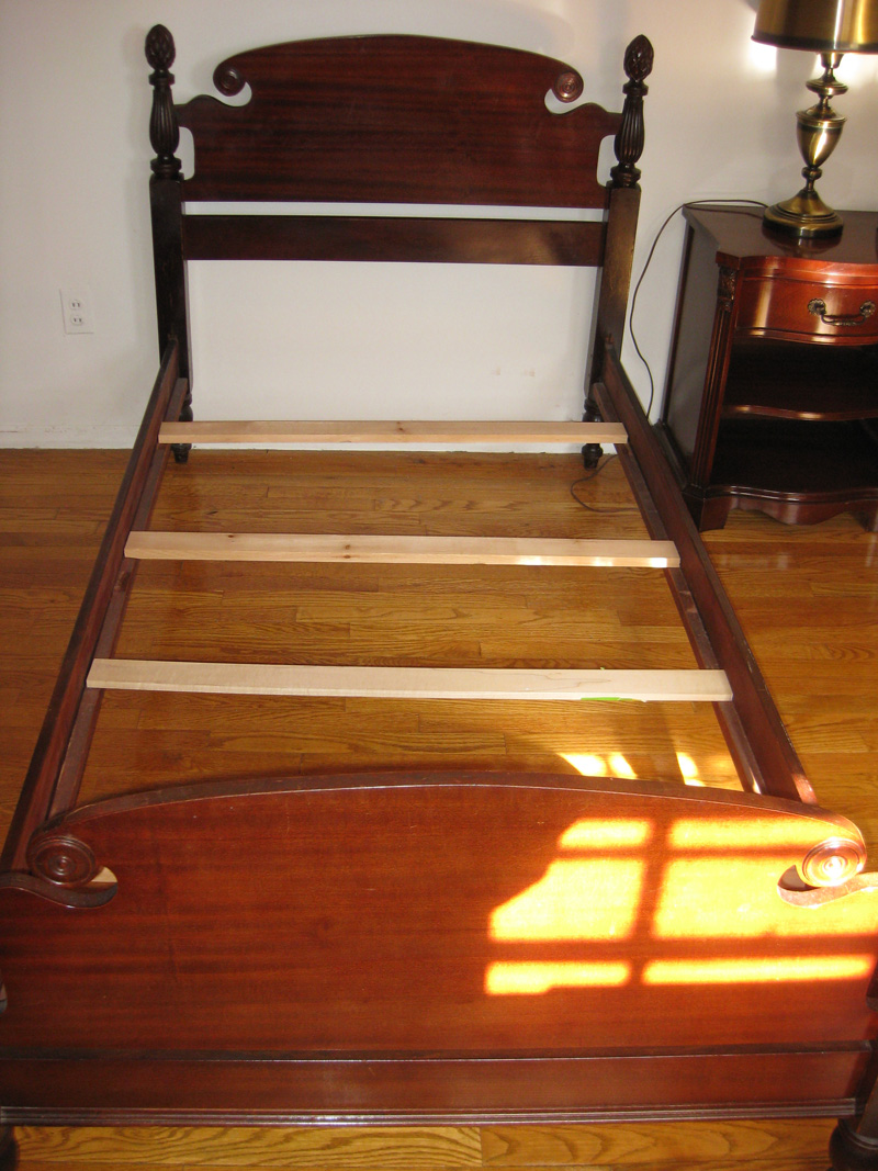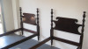 Estimated to be at least 50-75 years old. It really is in excellent condition (of course there are a few minor scratch/blemishes). I cannot find a manufacturer name on any of the pieces. I think it is Mahogany wood. As you can see from the pictures, it has a high gloss reddish color.