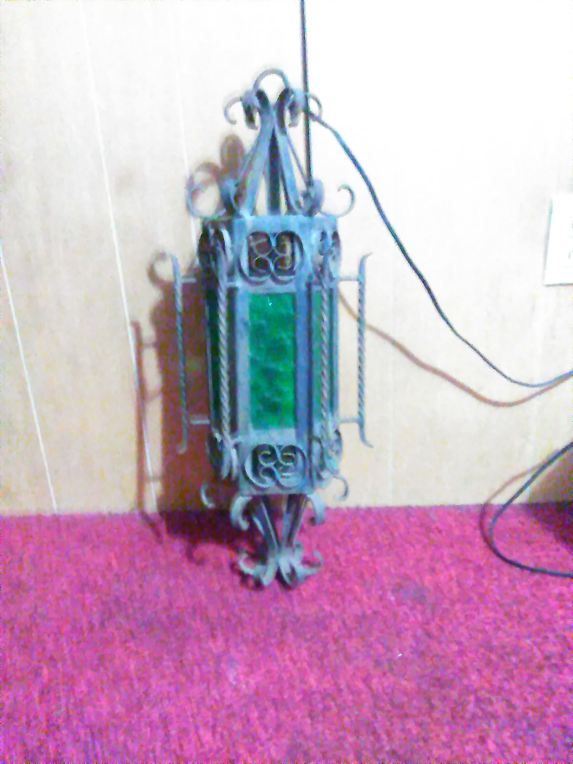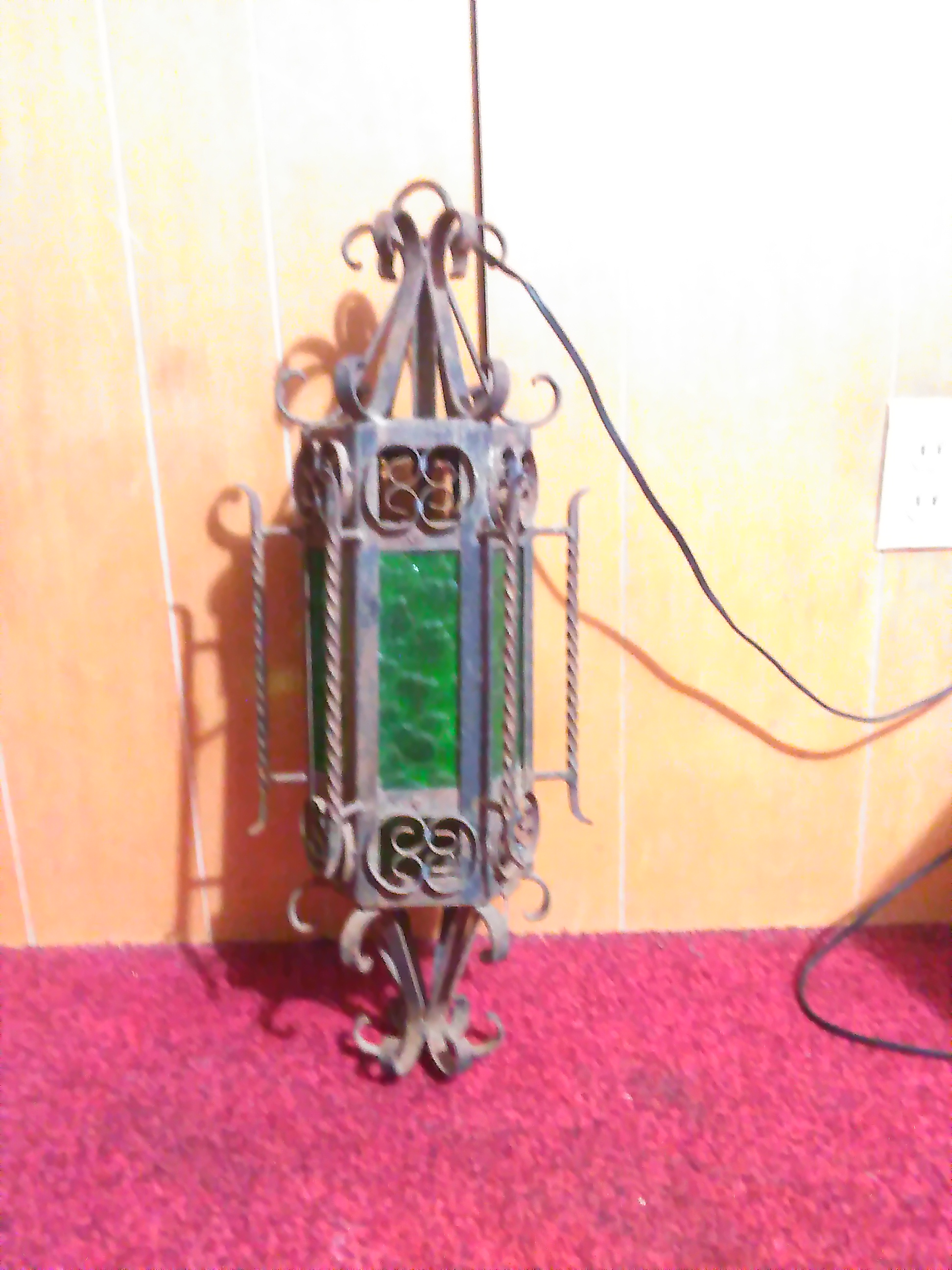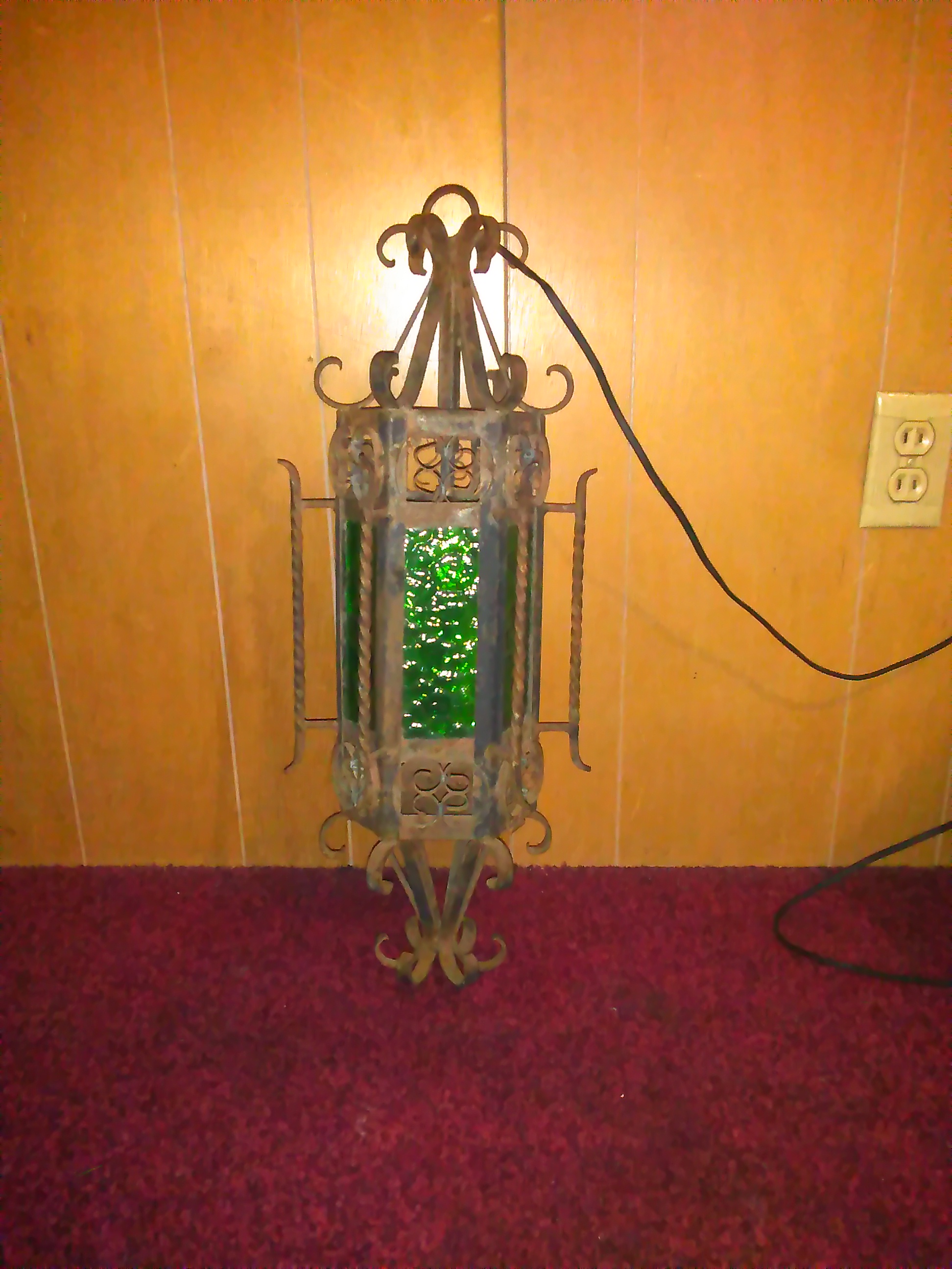Vintage gothic style hexagonal shaped wrought iron hanging lamps. There are 6 dark green beveled glass panes and are chorded so obviously they are electric. There is a drop panel on the bottom held in place by a screw that can be removed in order to change the light bulb. There are two of them so I assume that they came as a pair