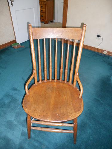 Pair of wood chairs. One has the mark Mann Bros Milwaukee on, the other doesn't. They are identical though.