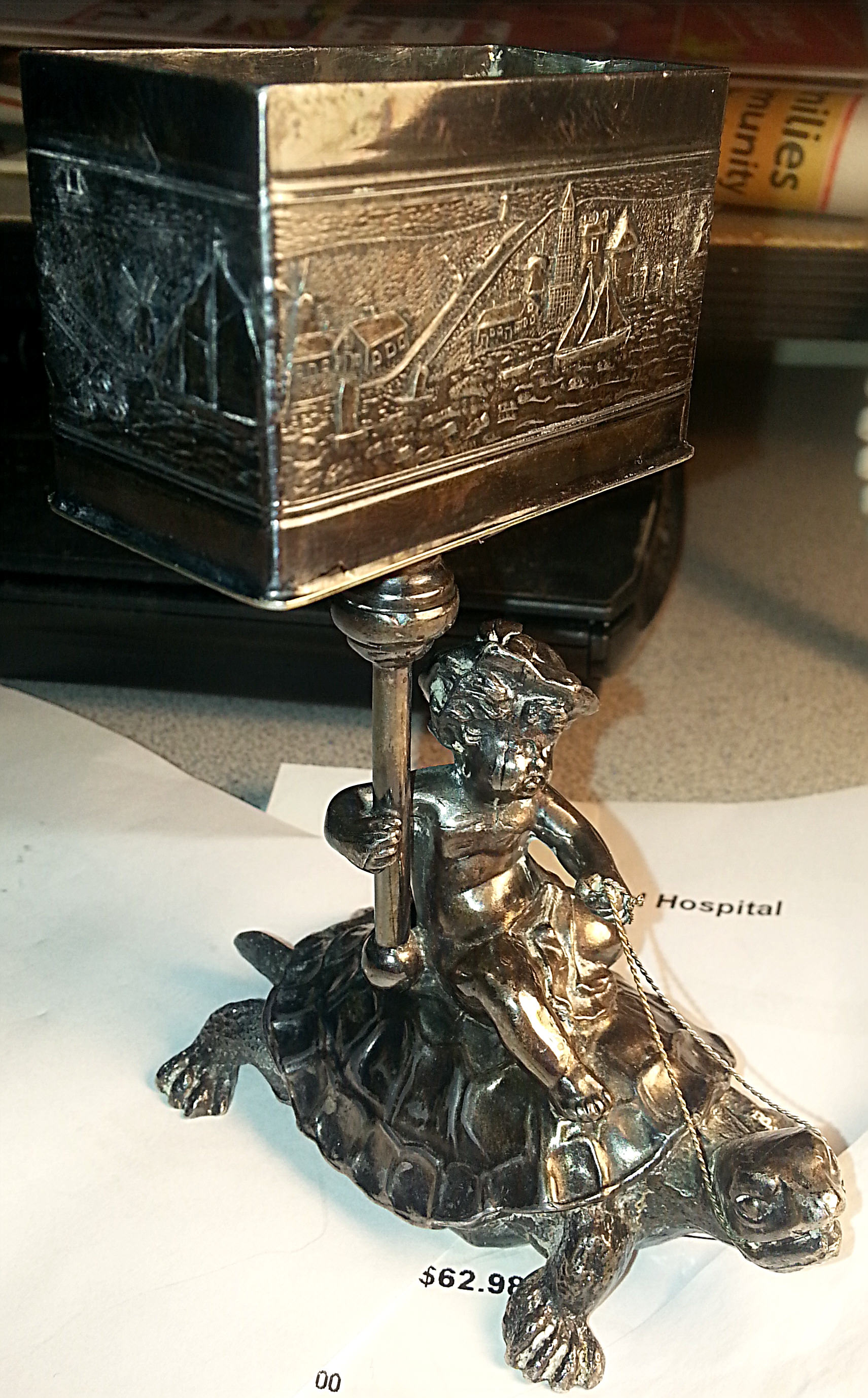 This charming cherub is riding a turtle and holding a container for a package of