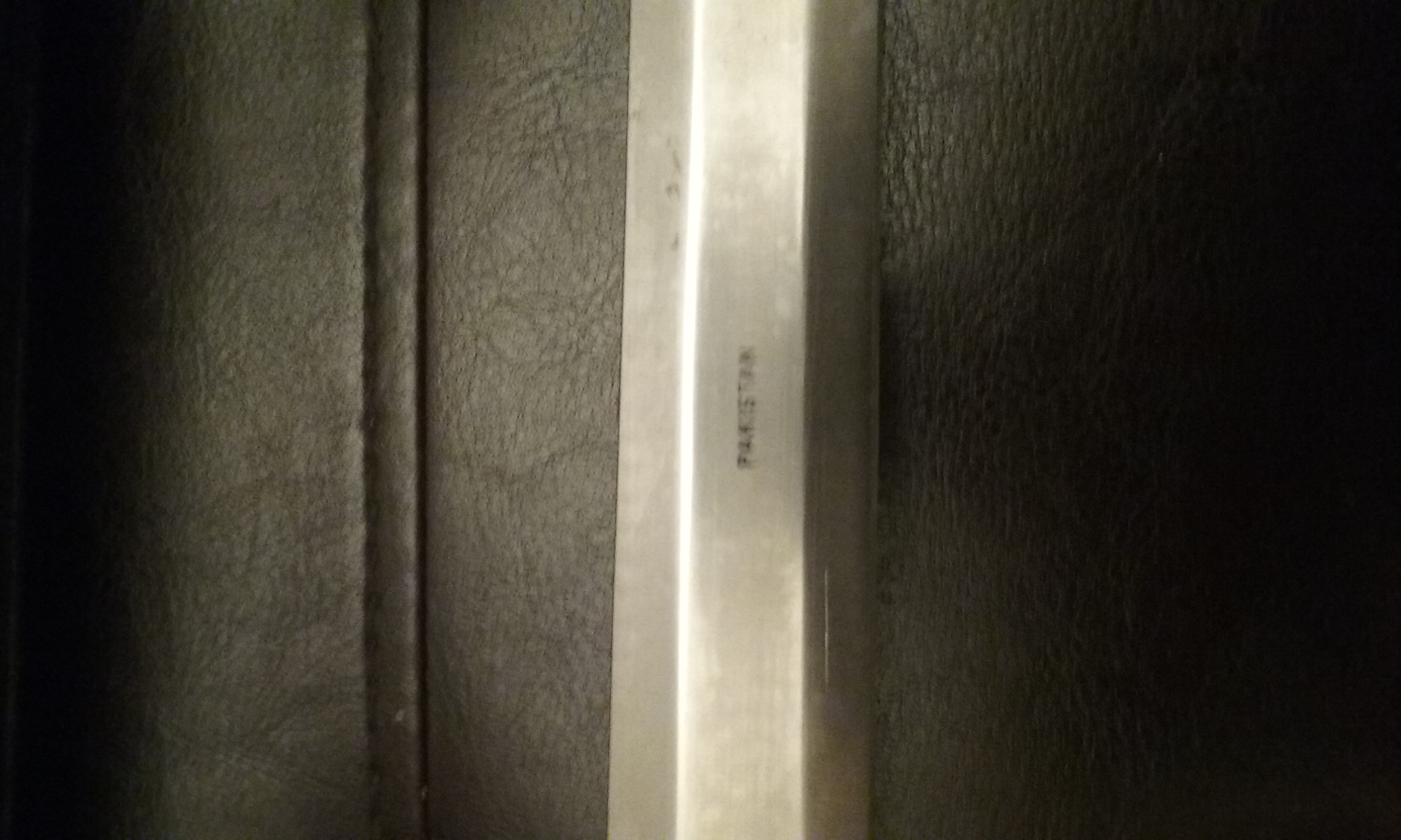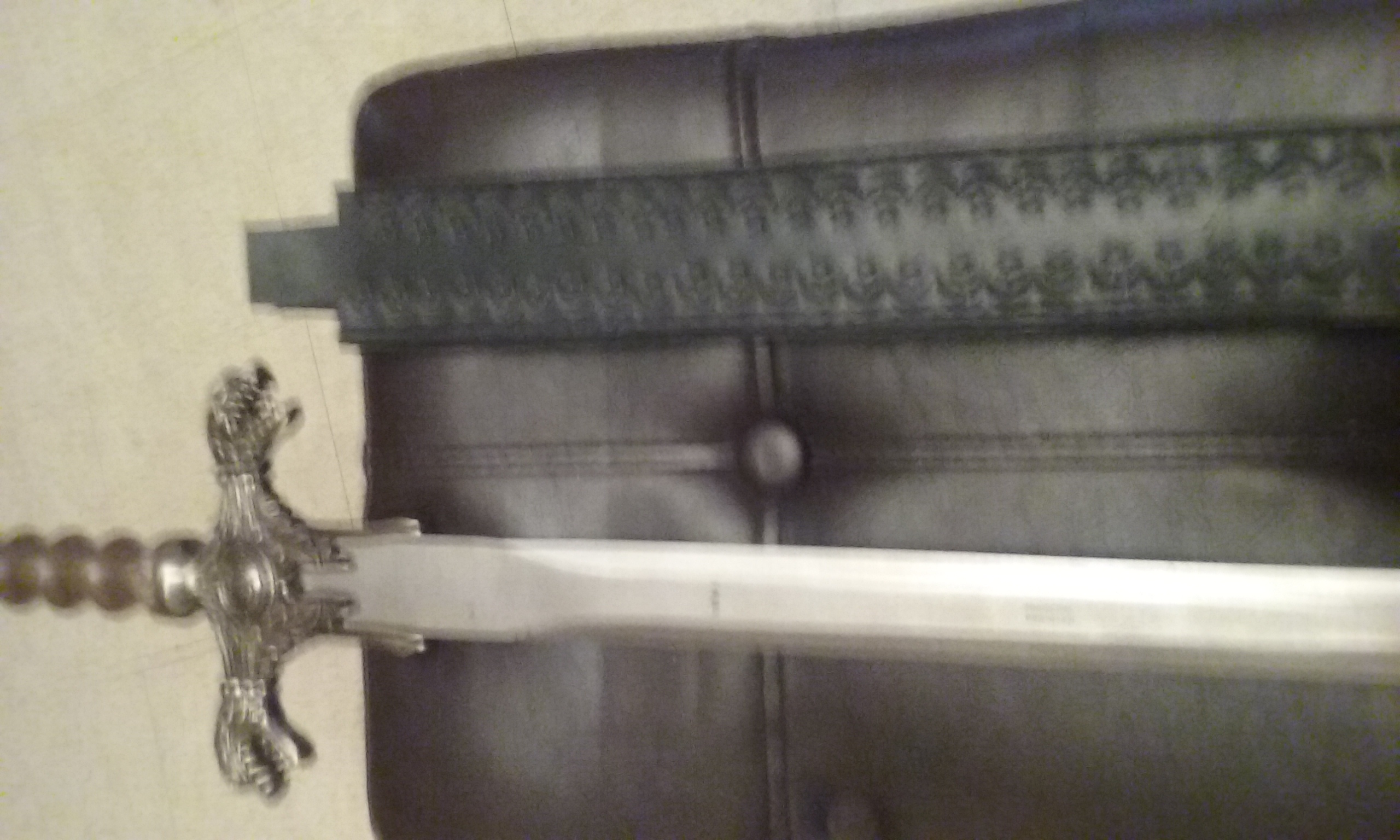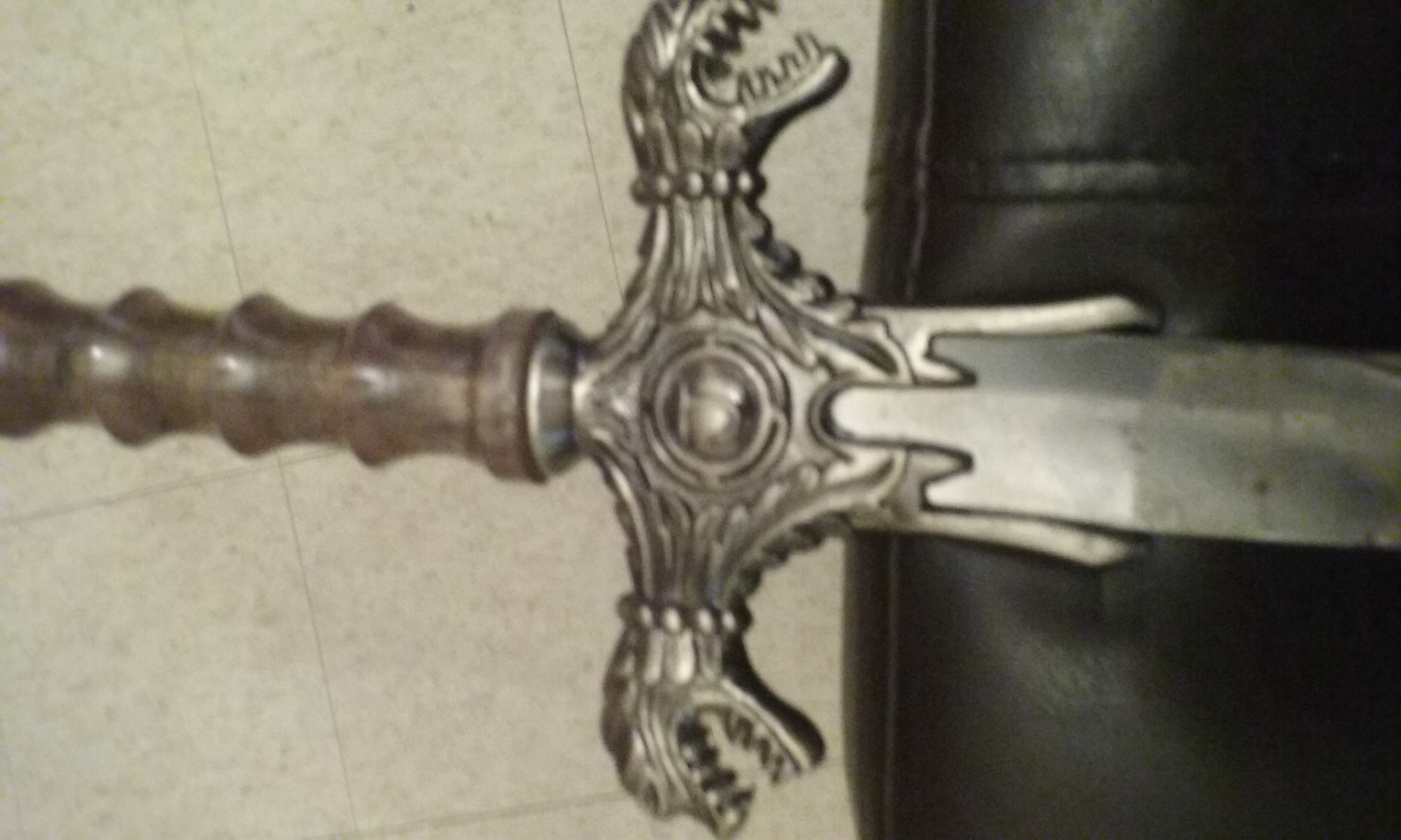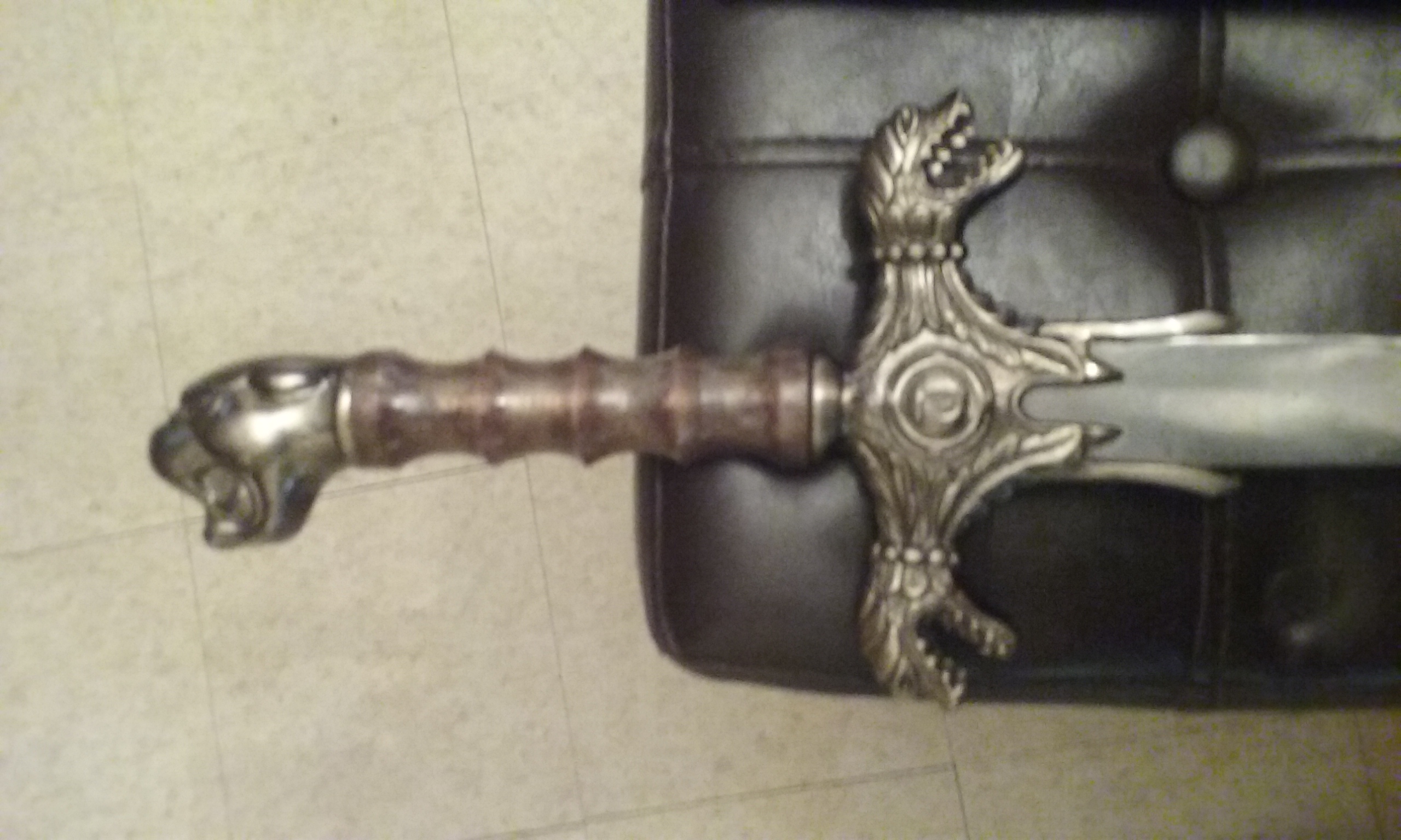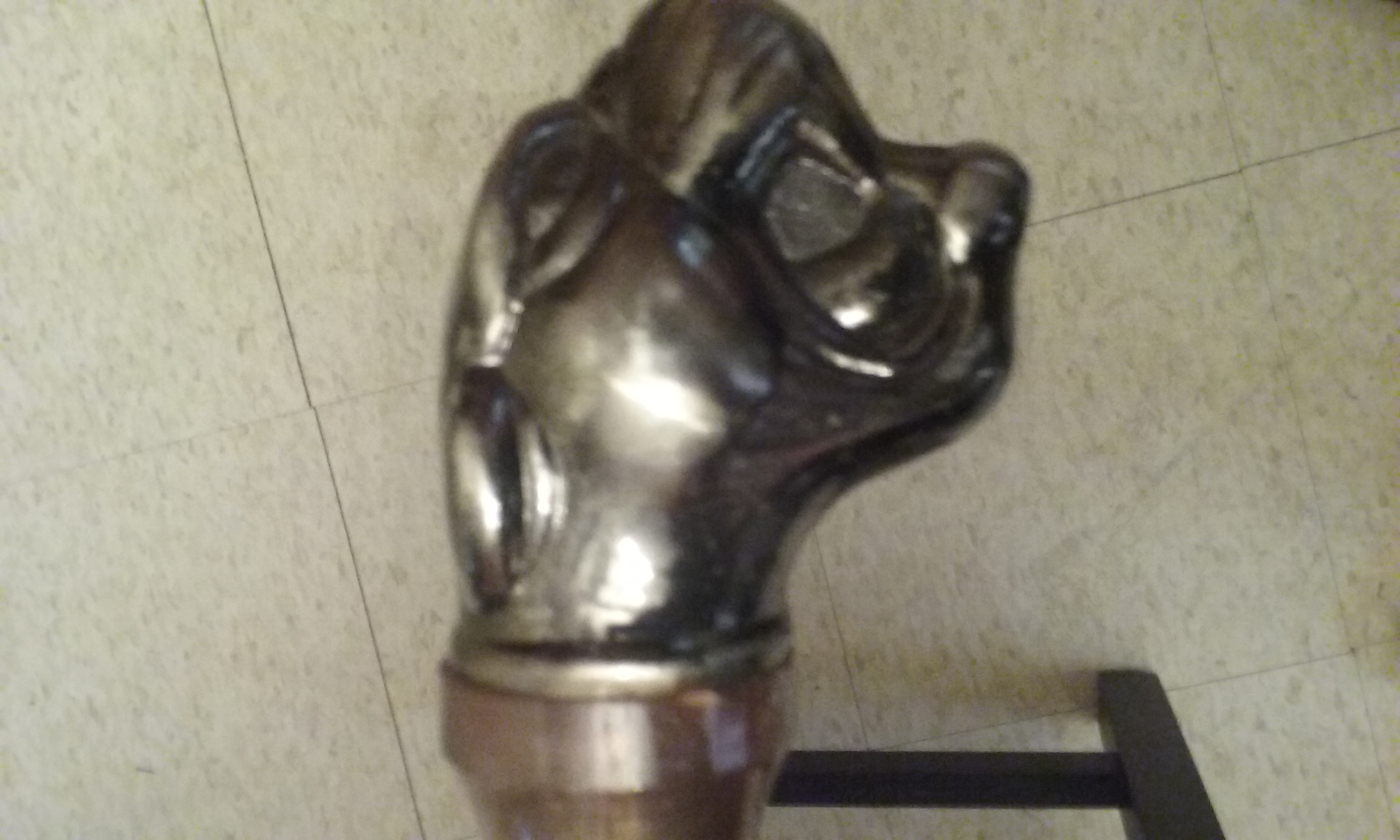 Marble or marble like handle with gold or gold like panther on the end and demons on the side.