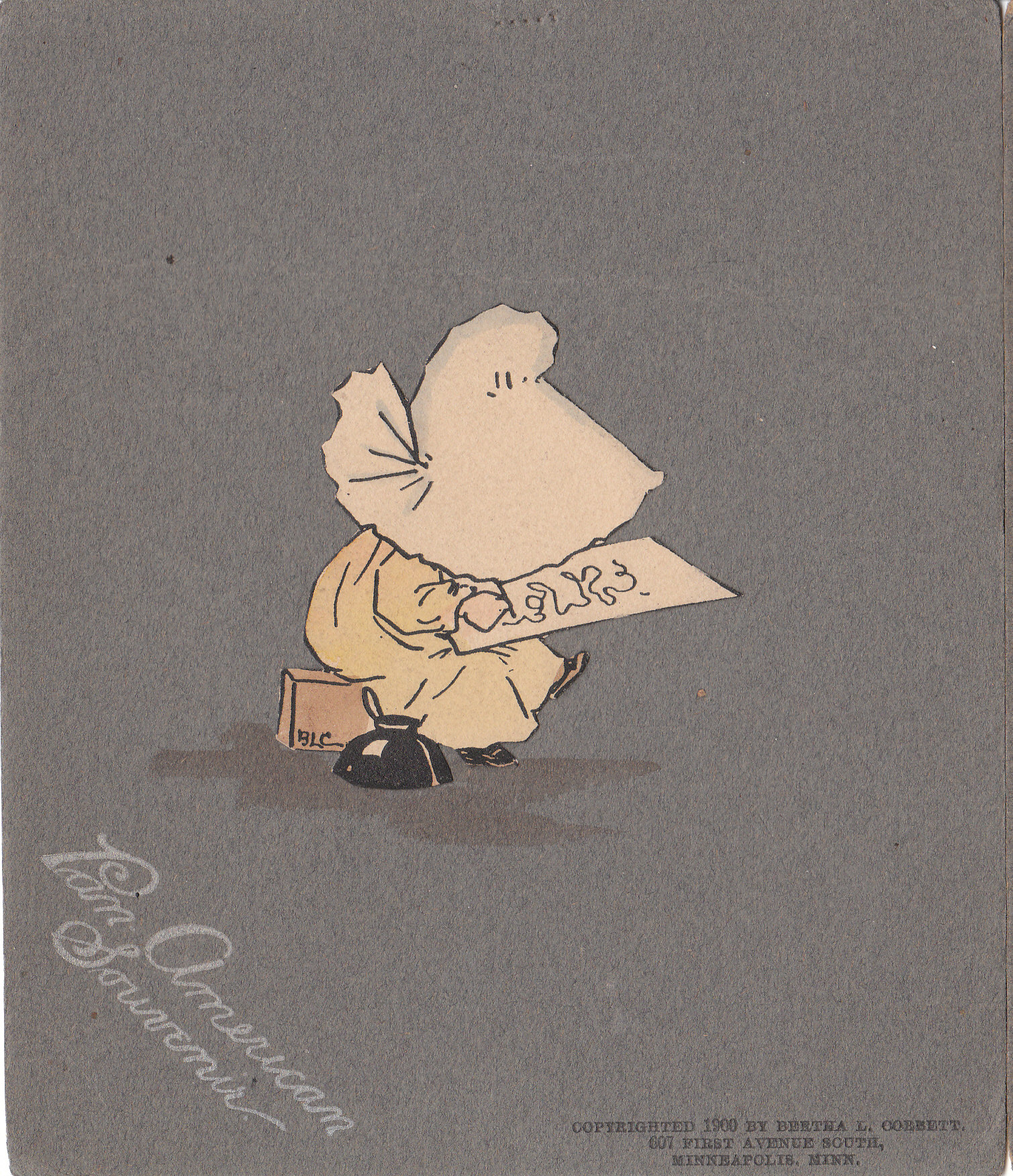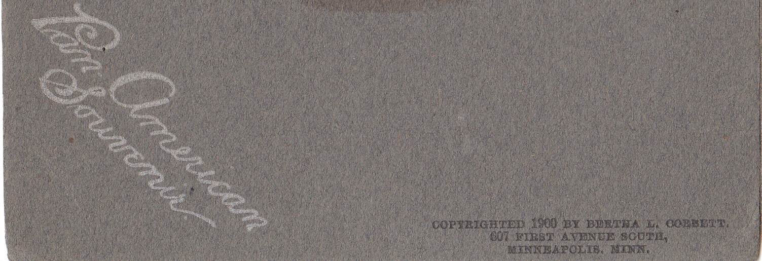 Acquired among other Pan American souvenirs, these are the most intriguing. They are 5" by 6" and say 'Pan-American Souvenir' in the corner. The opposite corner reads, 'Copyrighted 1900 by Bertha L. Corbett... Minneapolis, Minn.'