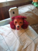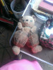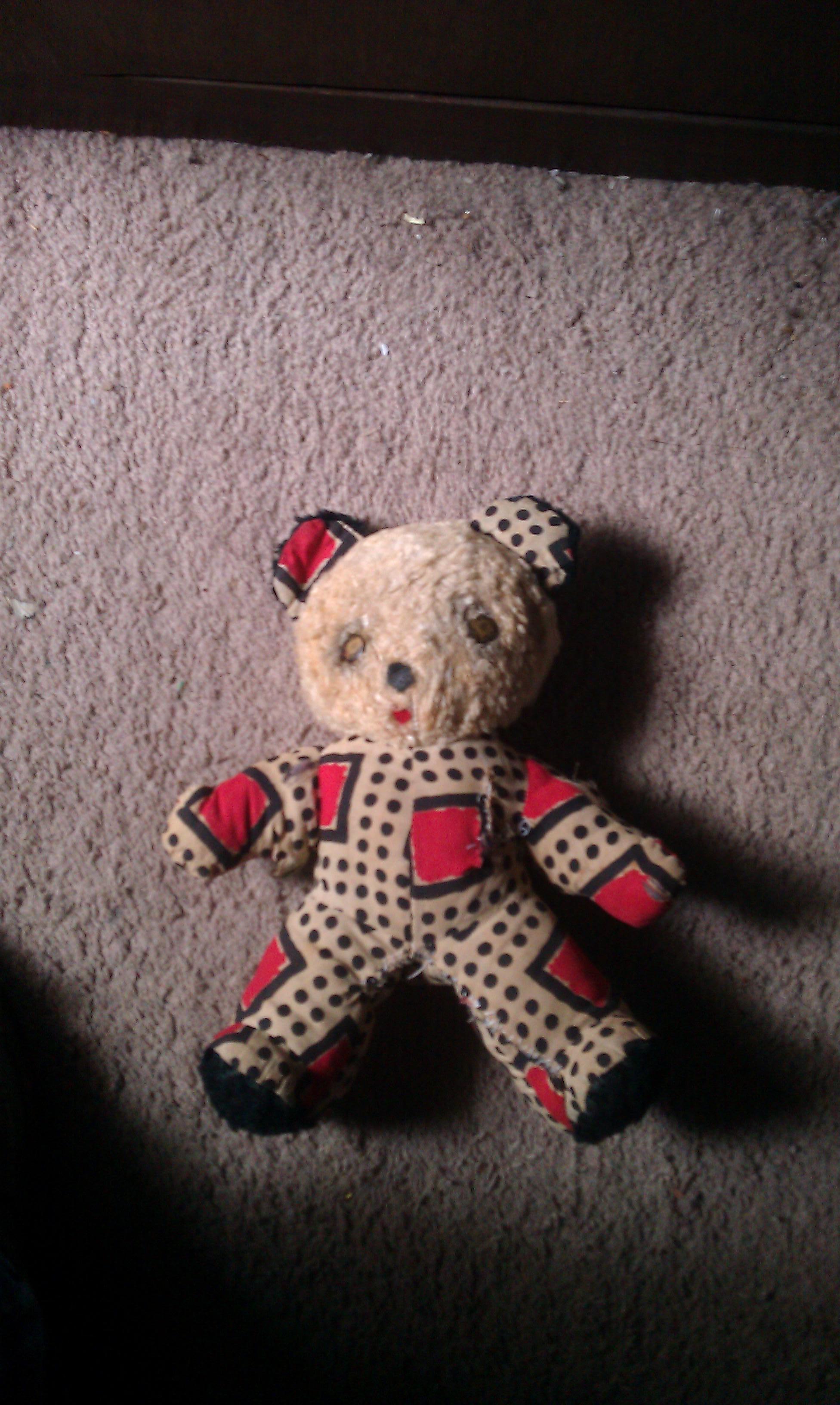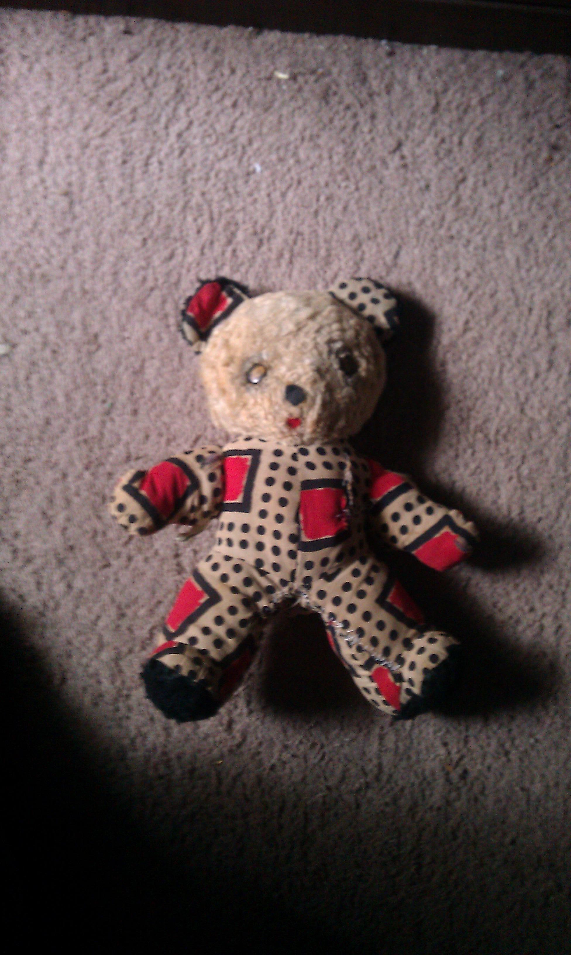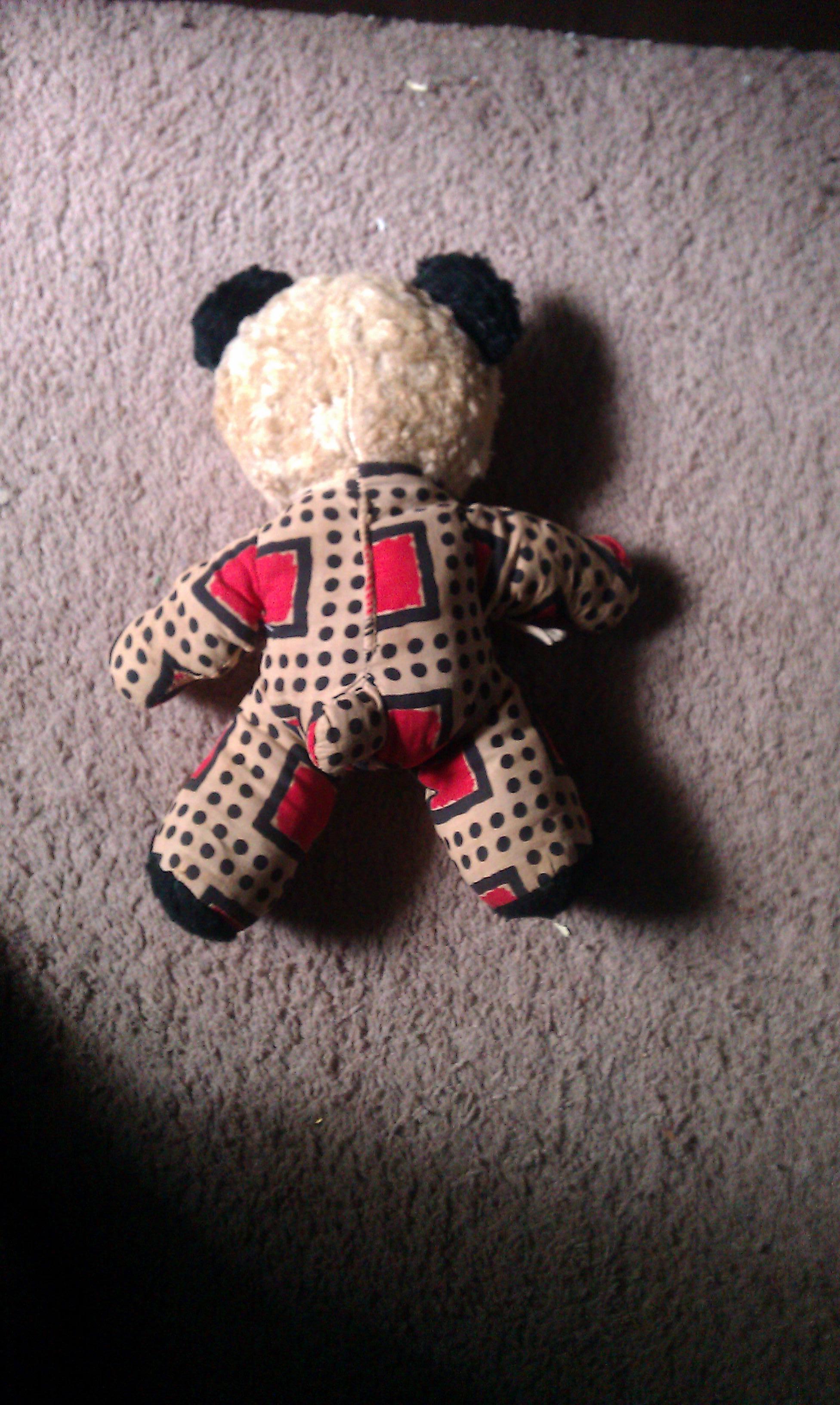 I have a bear clothed in white body with black poka dot and black squares with red filled centers. It has metal buttons for eyes. The ears match the coloration described for clothing.