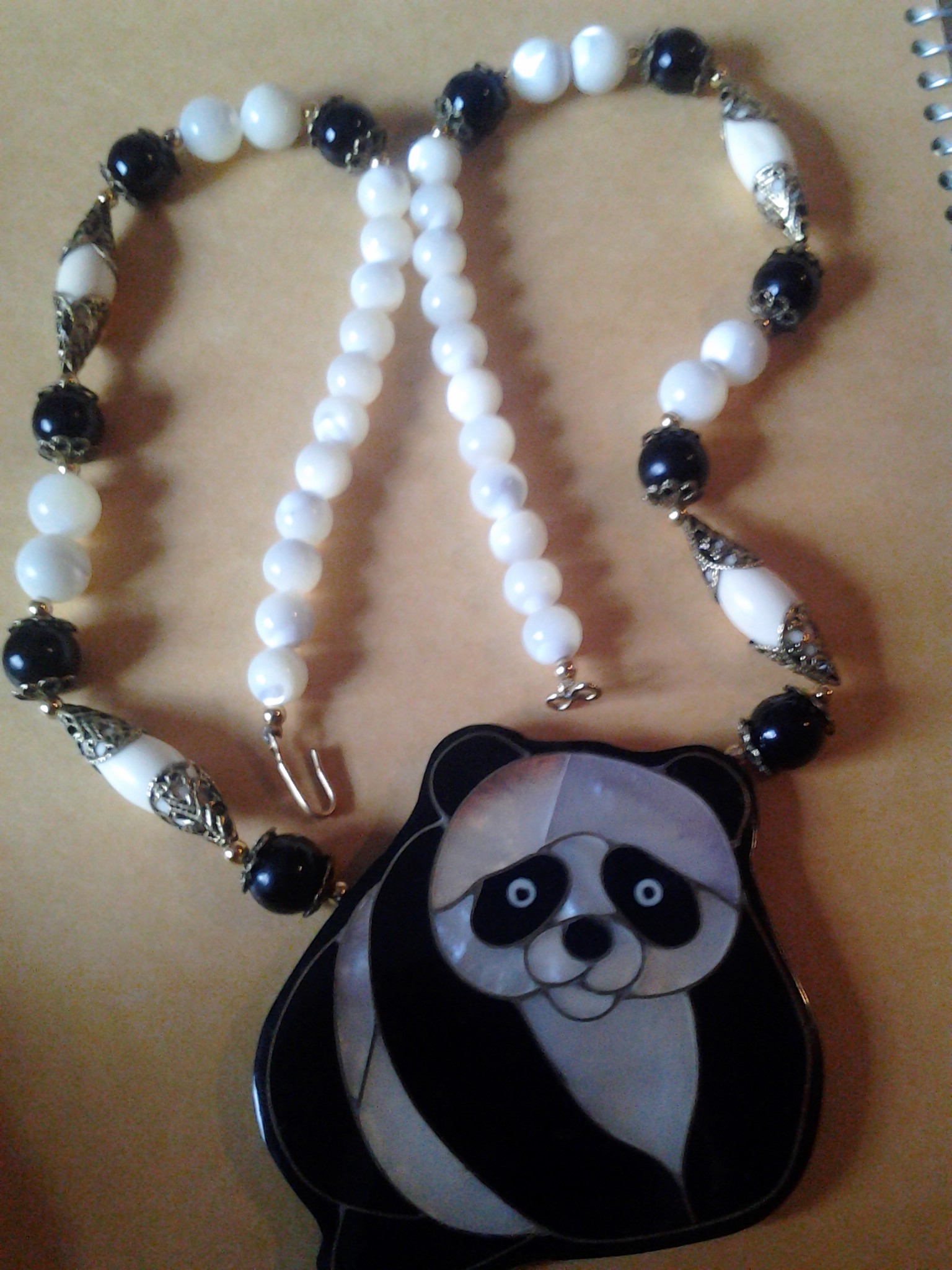 I have a panda necklace The panda seems to be mother of pearl and black onyx on the back. The necklace appears to also be mother of pearl or ivory and black beads with gold jewelry findings. The beads are round but some are oval shaped with pointed edges.