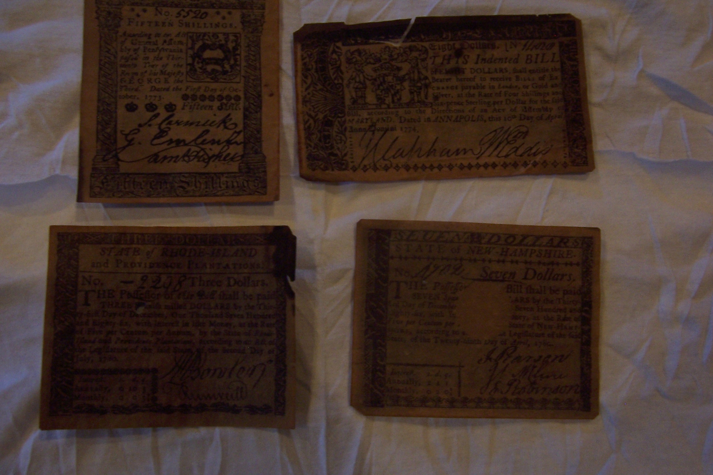 This are payment bill notes from RNew Hampshire,hode Island, Pennsylvania, and Maryland. I dont think they are in great shape, but you can read evrything on the bills. They are all a different amount and all have been numbered and signed by hand in a different ink.