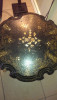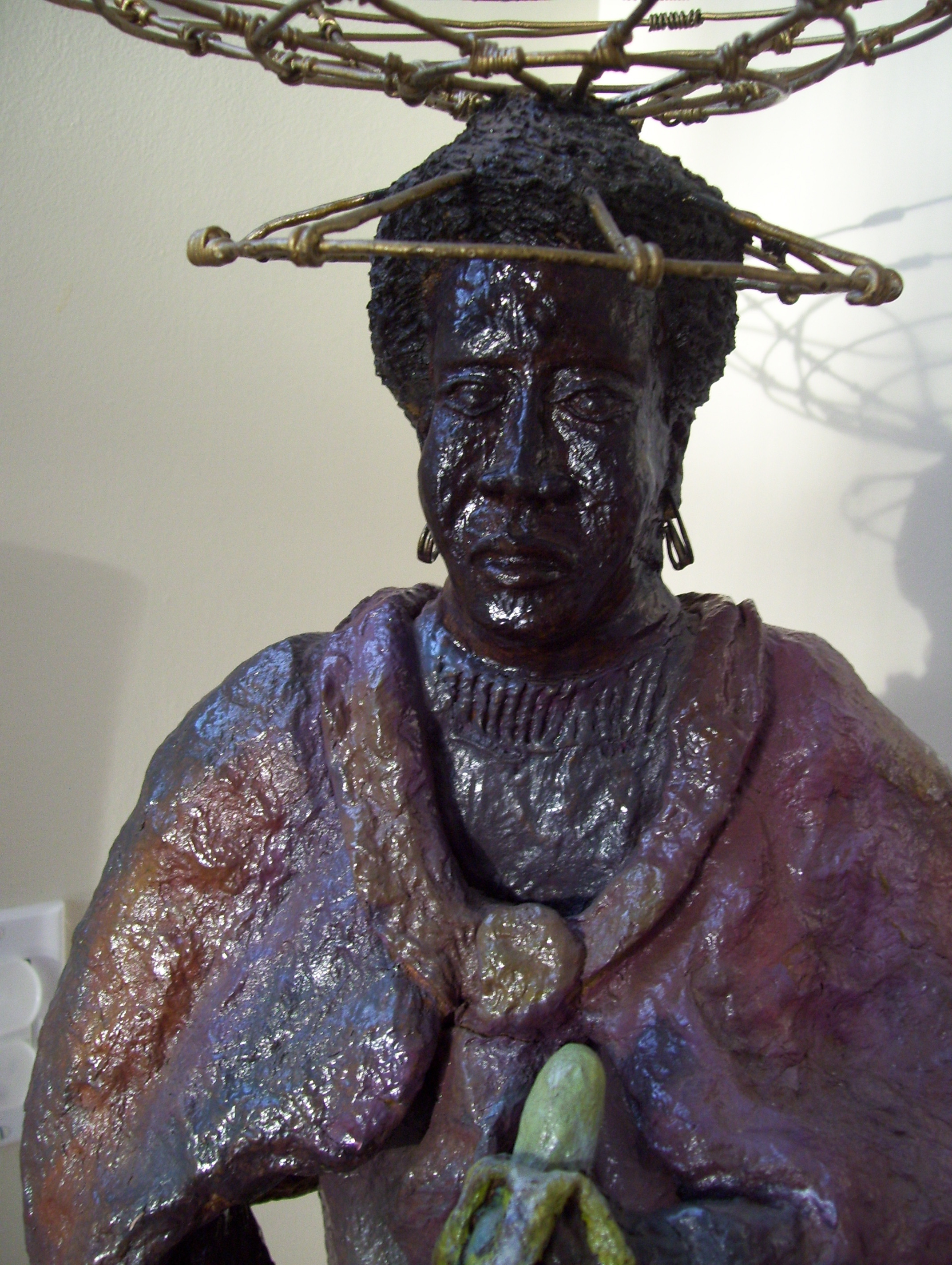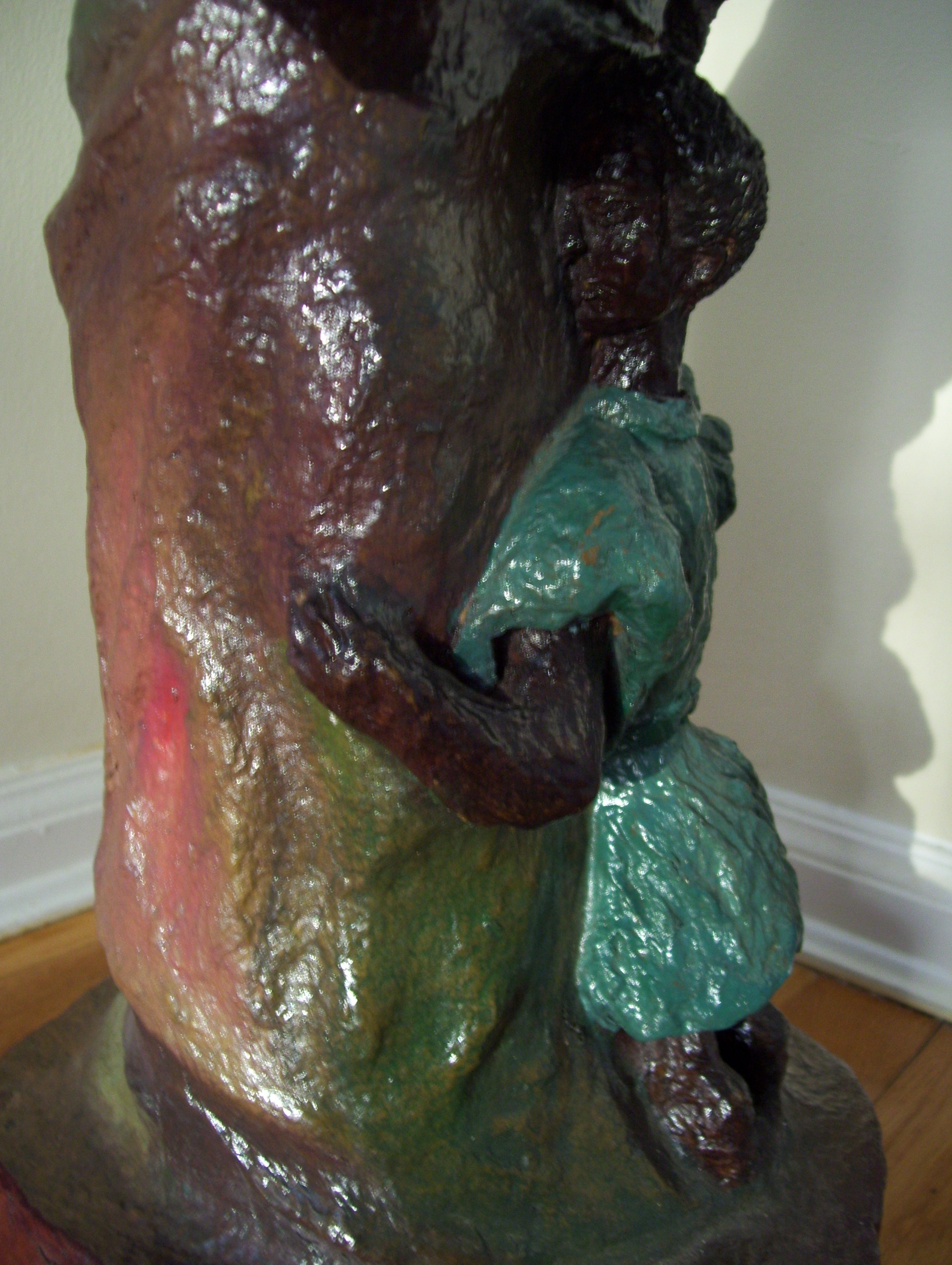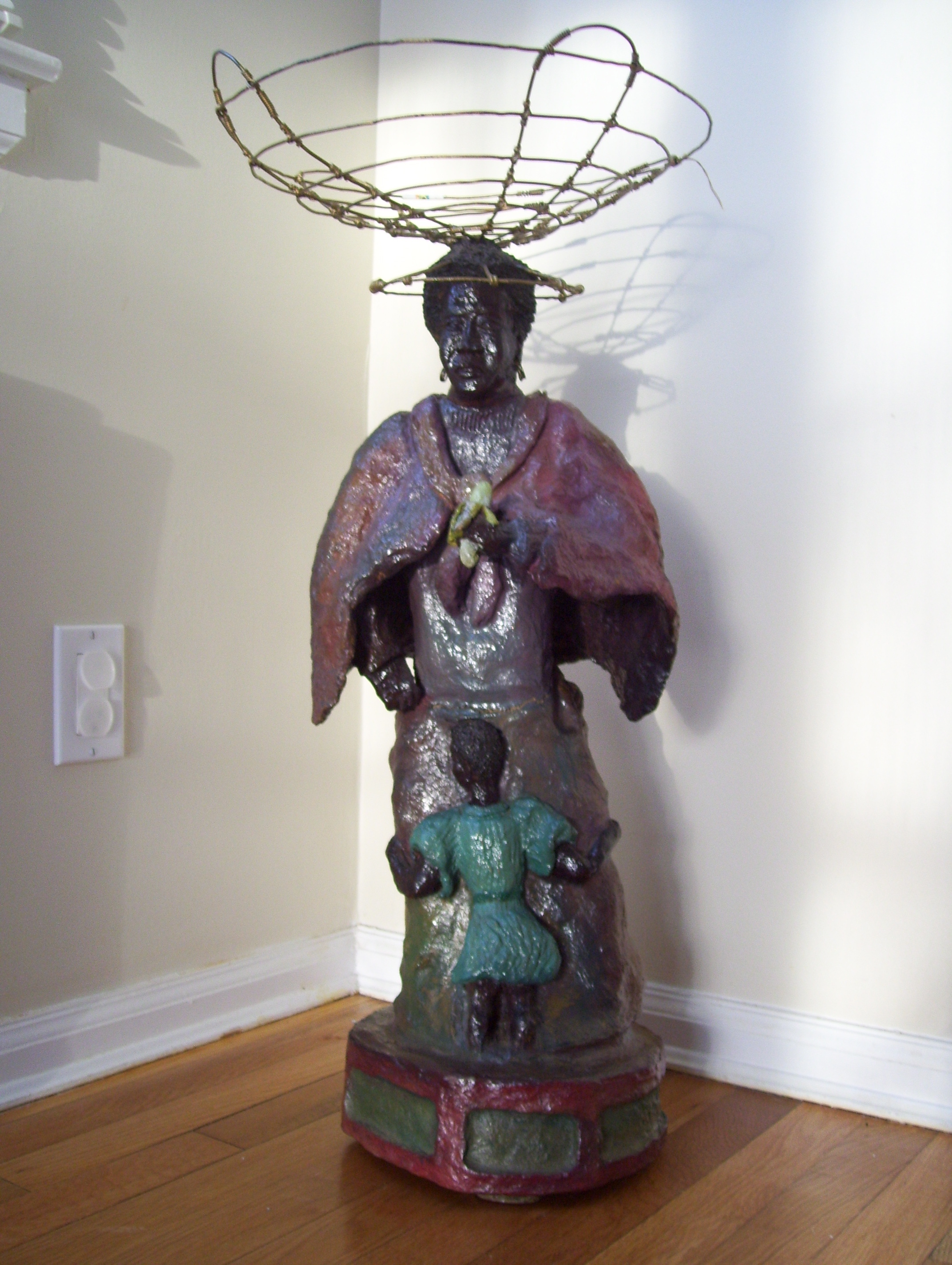 This statue is made from paper mache and has a shiny type of lacquer on it. It is a mother and a child. The mother is holding a banana. There is a basket on the woman's head made of wire. The statue including the wire is 29" in height. The statue itself is 25" high. There are no markings on it, but there is a small piece of a sticker price tag on it, but it does not say anything. There is also a string hanging from it, it looks as if a tag was attached to it at one time. It is a very interesting piece of art.