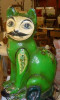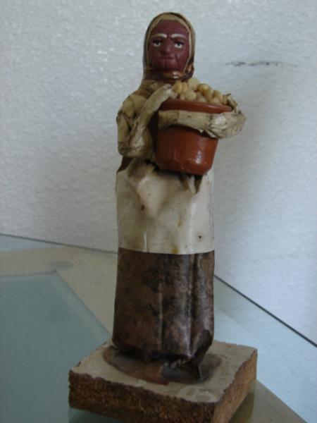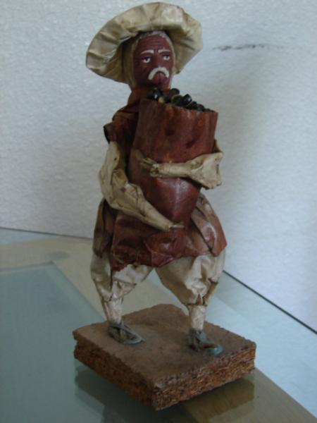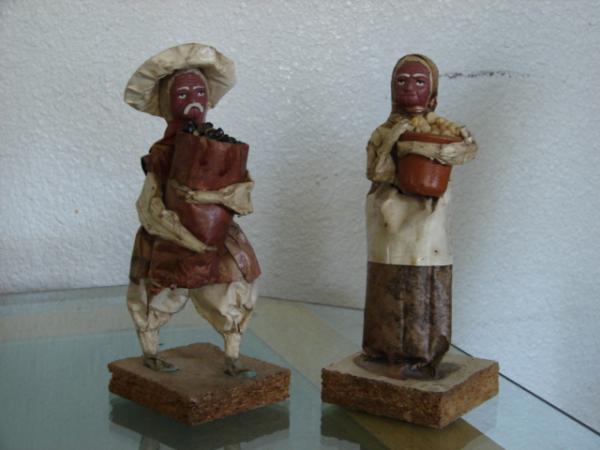 The size of these figures is 8 x 3 inches each. I can't find a mark on both figures. The bases are scrap wood. The faces and the pot that the lady is holding seems clay; the content of the pot and the paper bags that they are holding are pebbles, all the rest is made of paper.