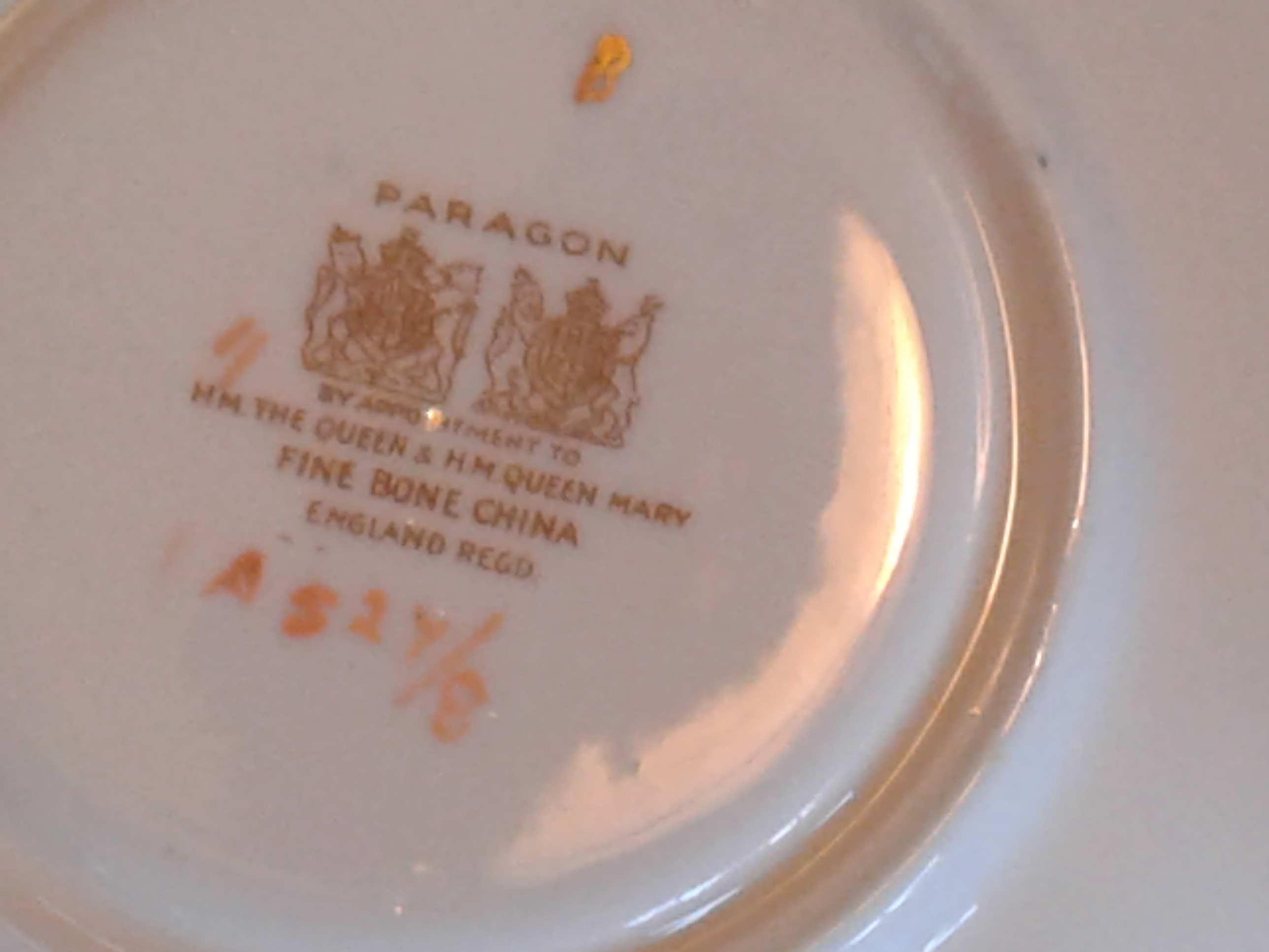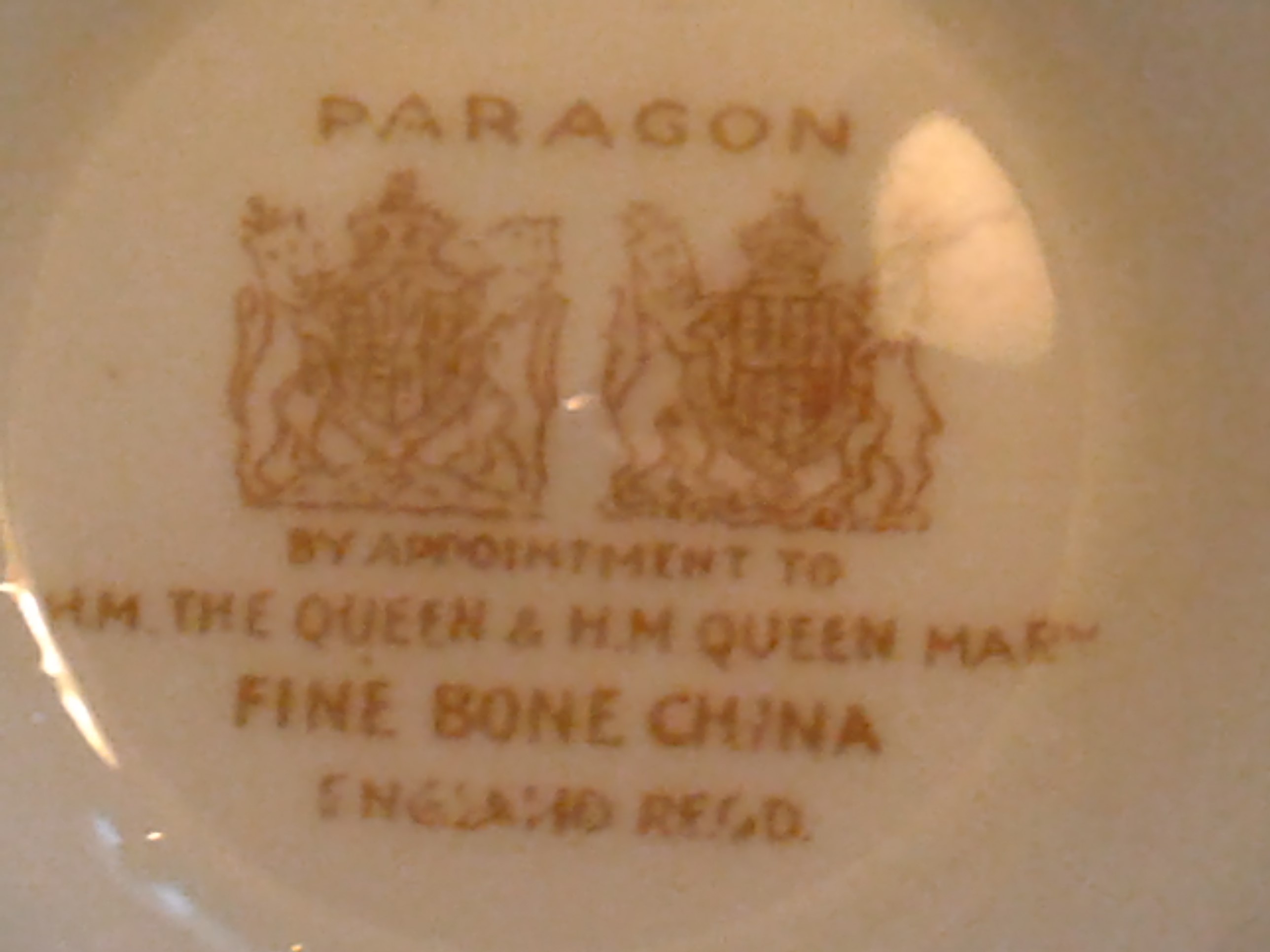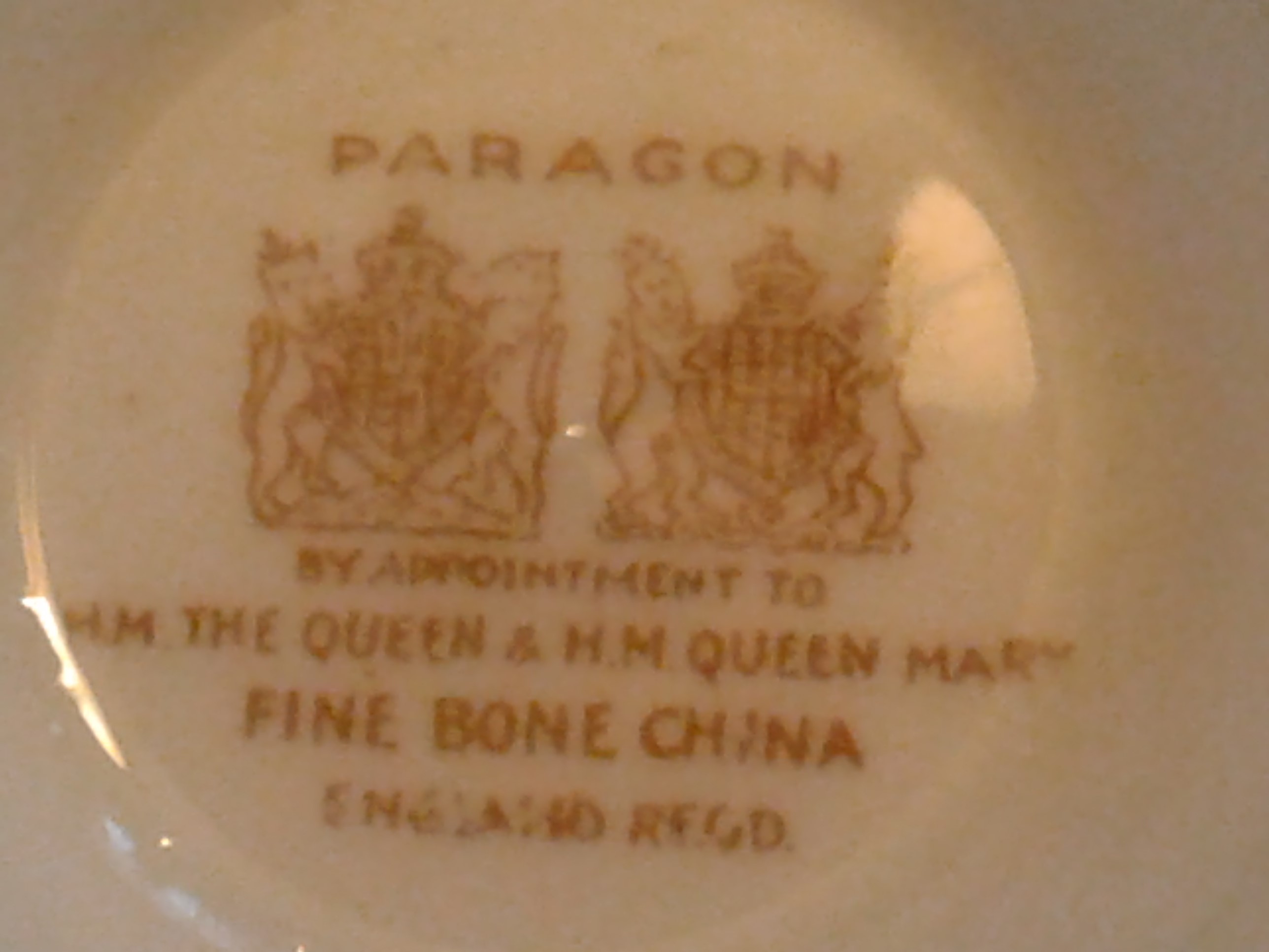 This cup and saucer was made by Paragon in England under Royal Warrant and was designed to represent the person named on the warrant and approved by them. Your teacup and saucer was made between 1937 – 1952. This mark is for Queen Elisabeth, known to her death as Queen Mum and wife of King George VI and her Mother in law was Queen Mary. In the 1930’s the company Paragon got in a bit of trouble as they had begun using the name Royal on some pieces without receiving a warrant.