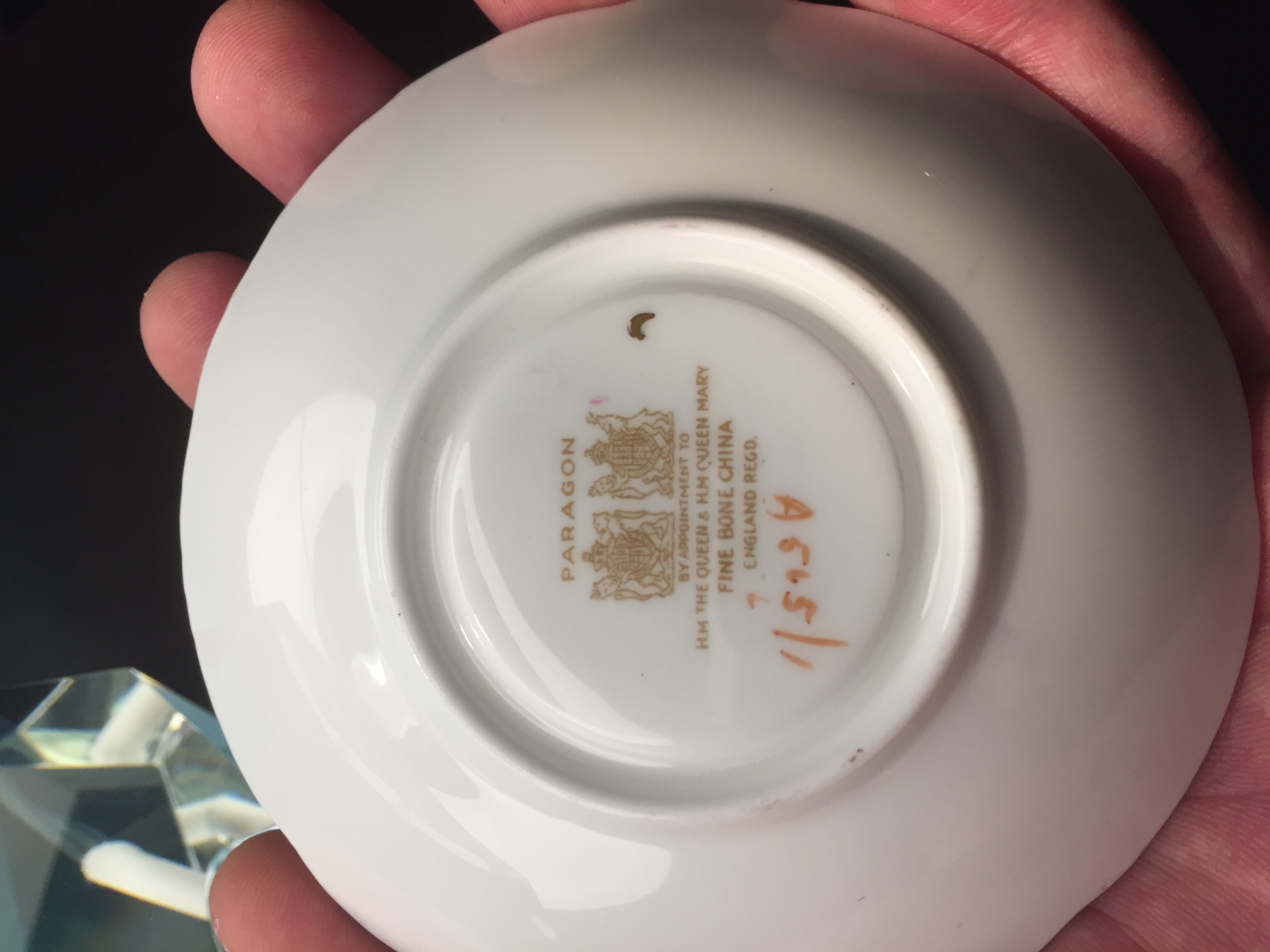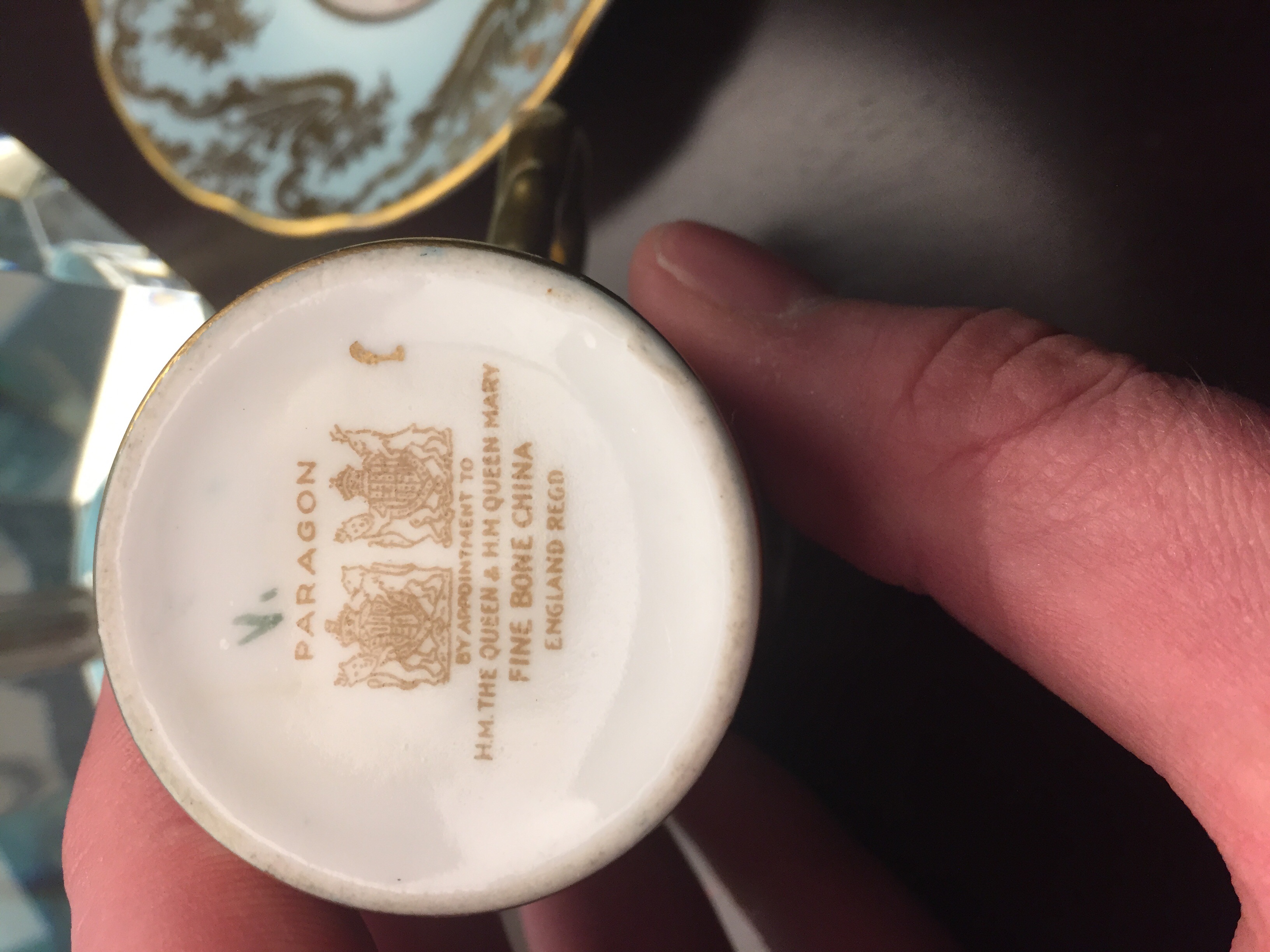 Paragon espresso cup and saucer set with makers mark by appointment of "H.M. The Queen and H.M. Queen Mary".