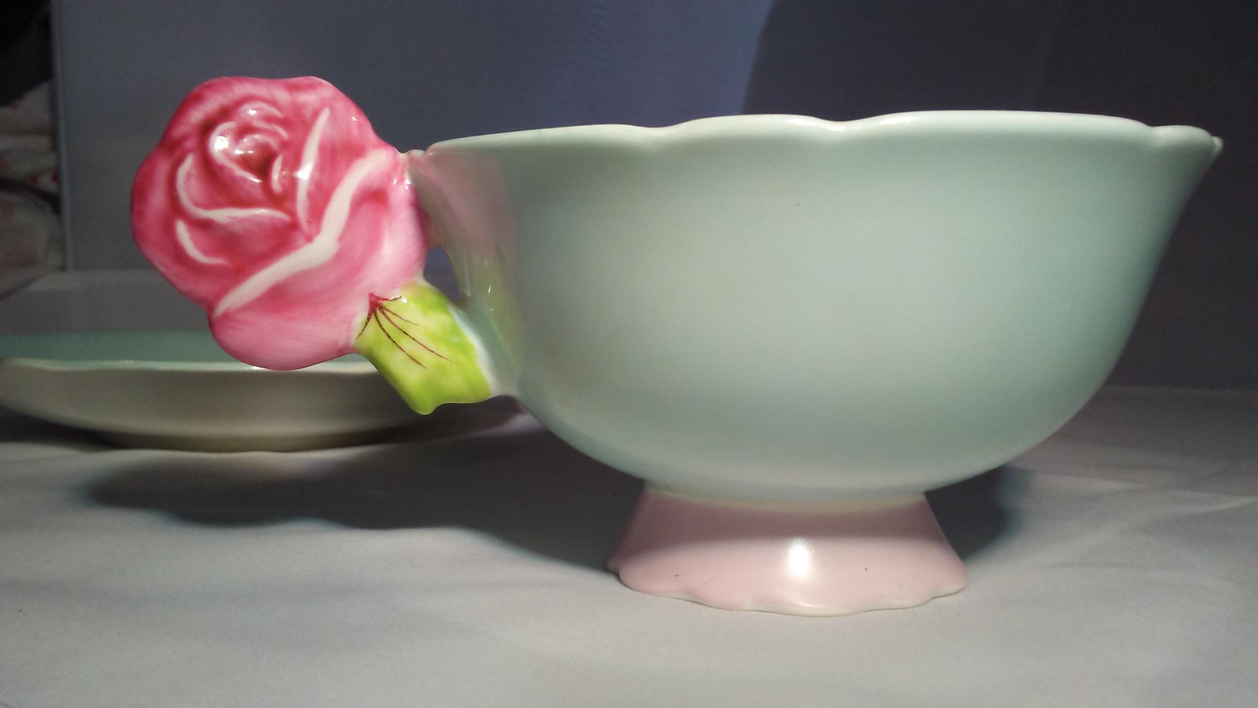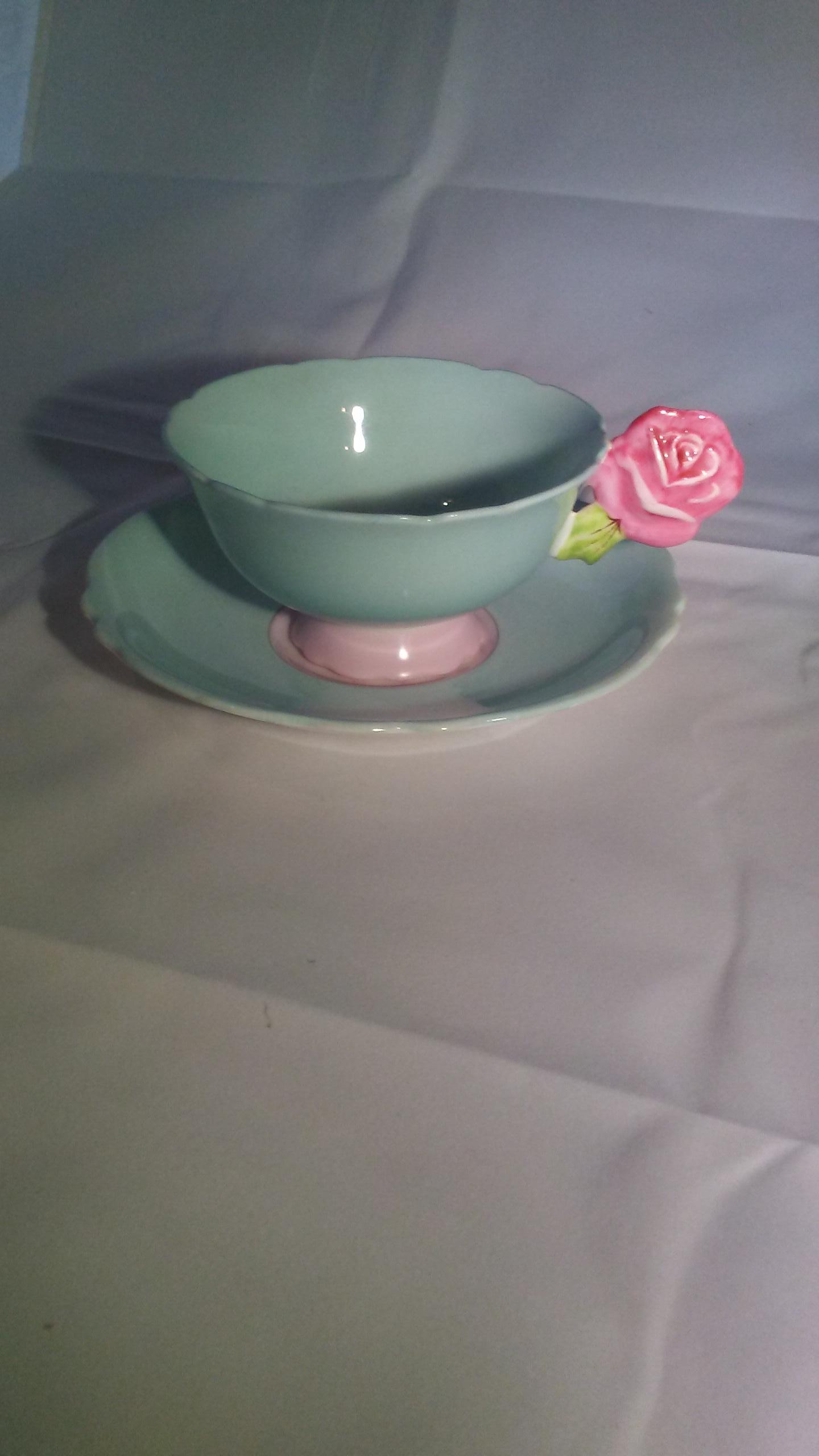 I bought this beautiful tea cup and saucer with a rose handle . Light blue cup and saucer with pink middle of saucer. On back of saucer it reads: By appointment to H.M. THE QUEEN & H.M. QUEEN MARY FINE BONE CHINA ENGLAND REG'D. There is a goldish colored dot in middle of PARAGON and above that it is hard to read but it MIGHT be : G 1 6 or 616???? Hard to tell