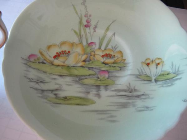 fine bone china , i'm told from WW 2...beautiful water lilly scene on both saucer and inside cup...