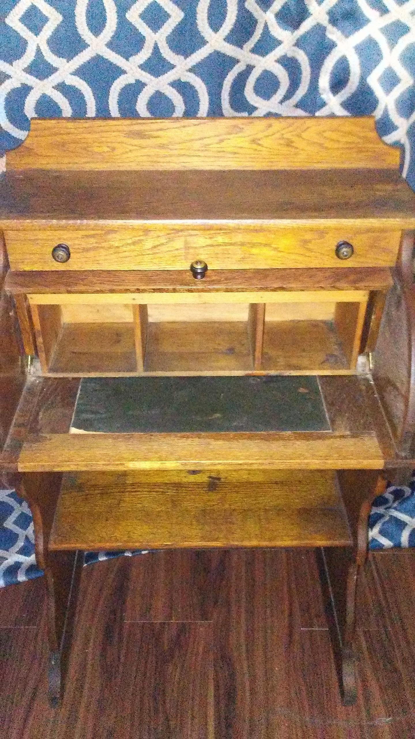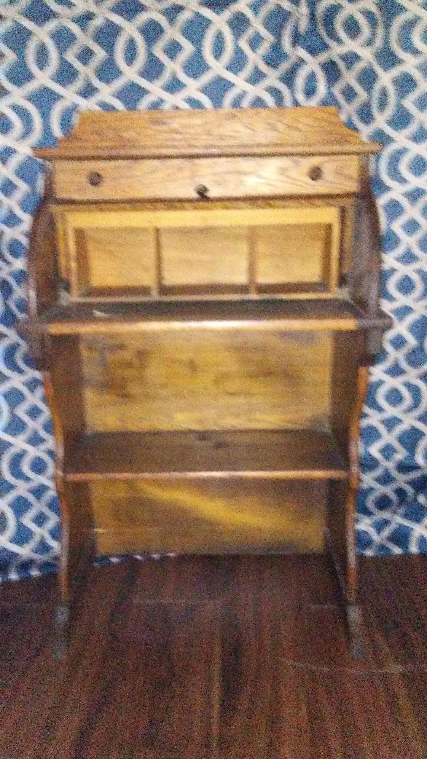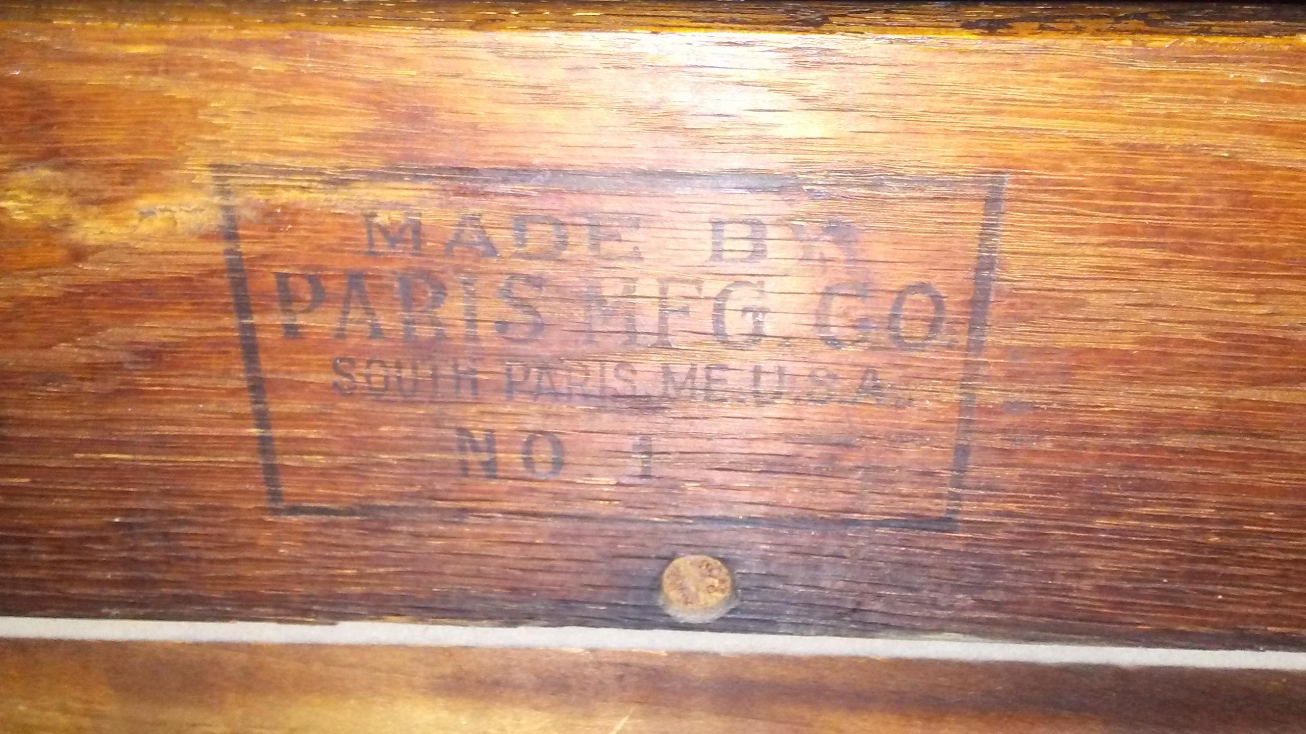Very small childrens roll top desk with stamp on back stating made by Paris Mfg Co . Soth Paris, ME. U.S.A. No 1