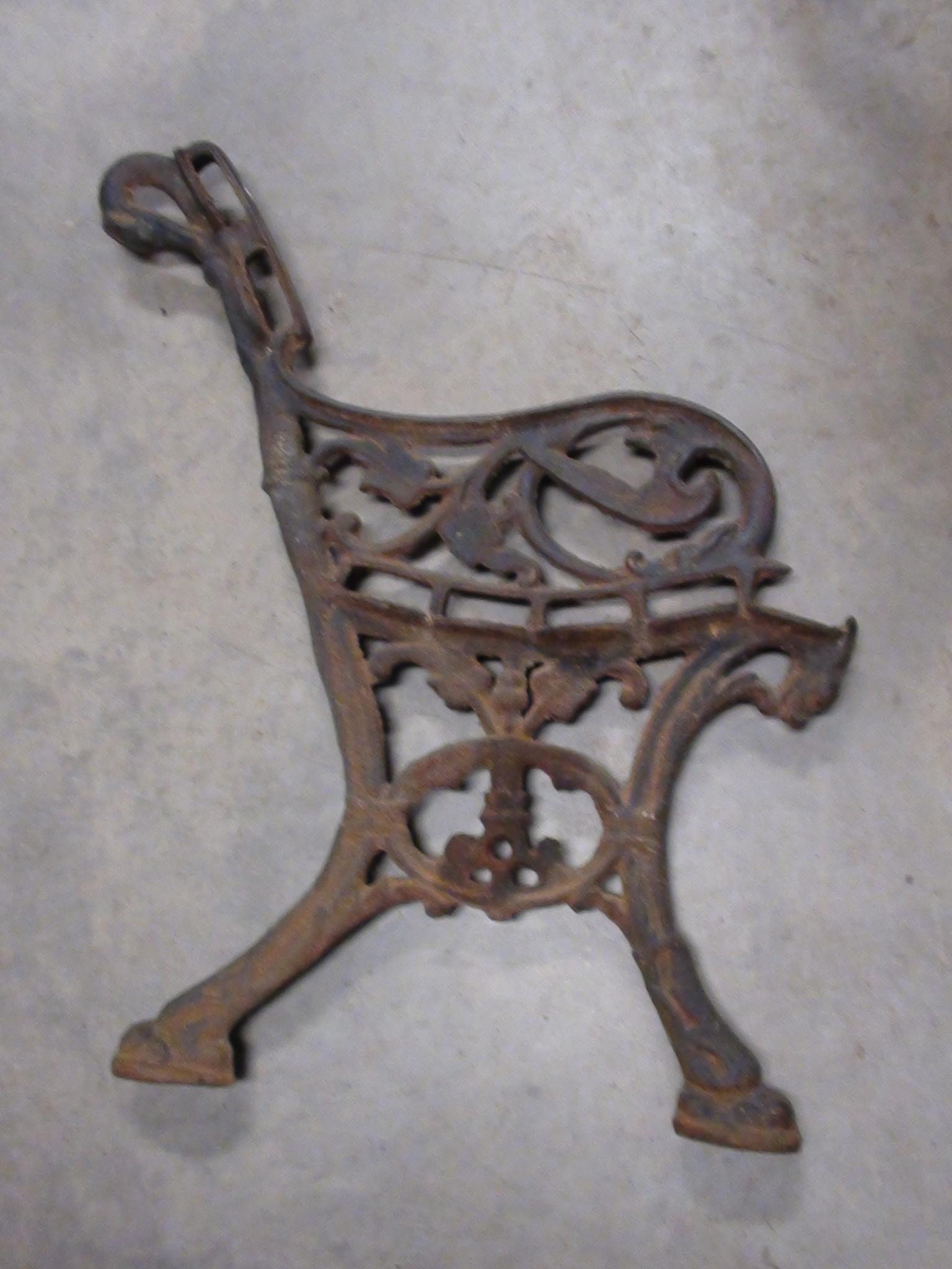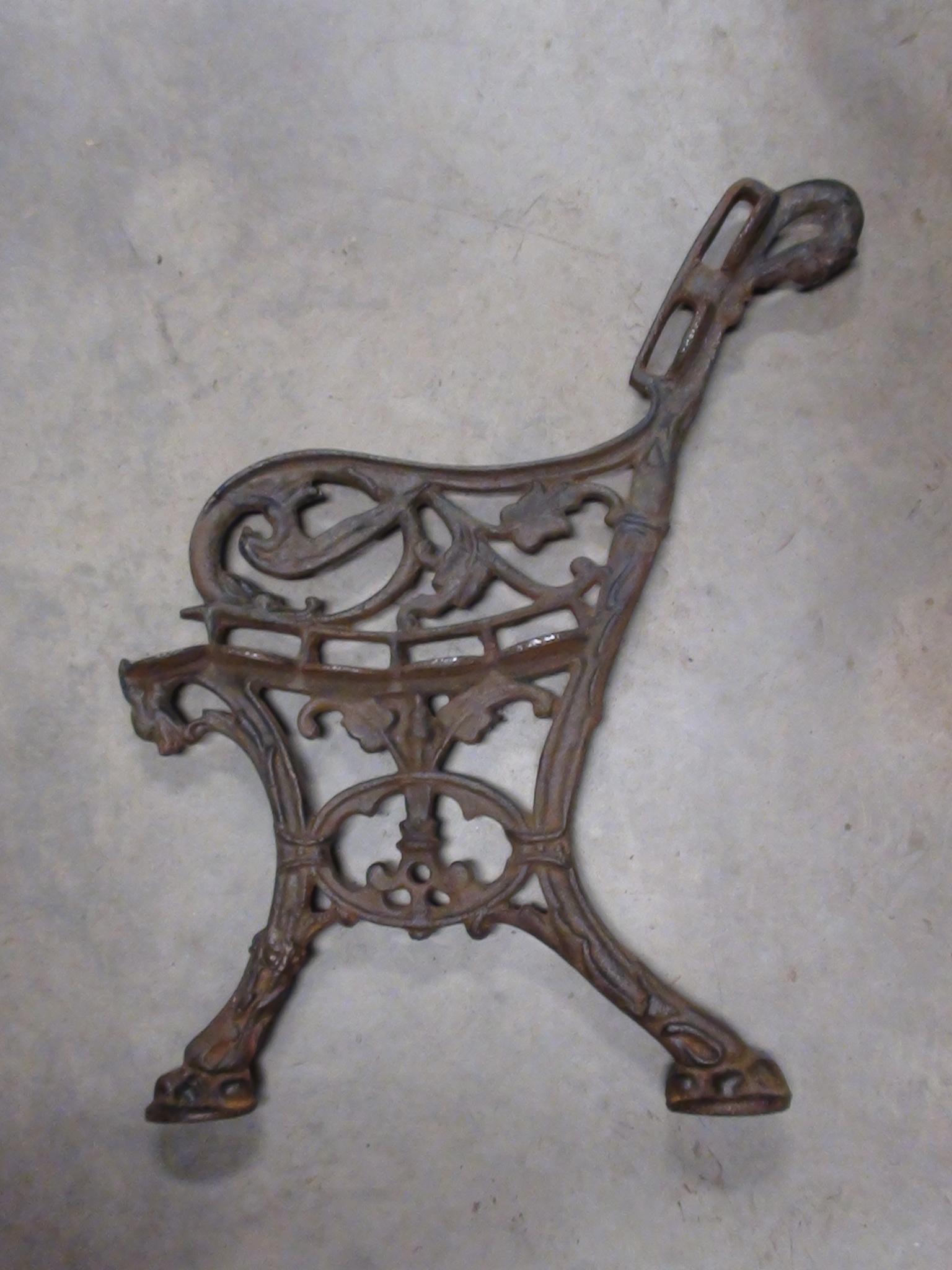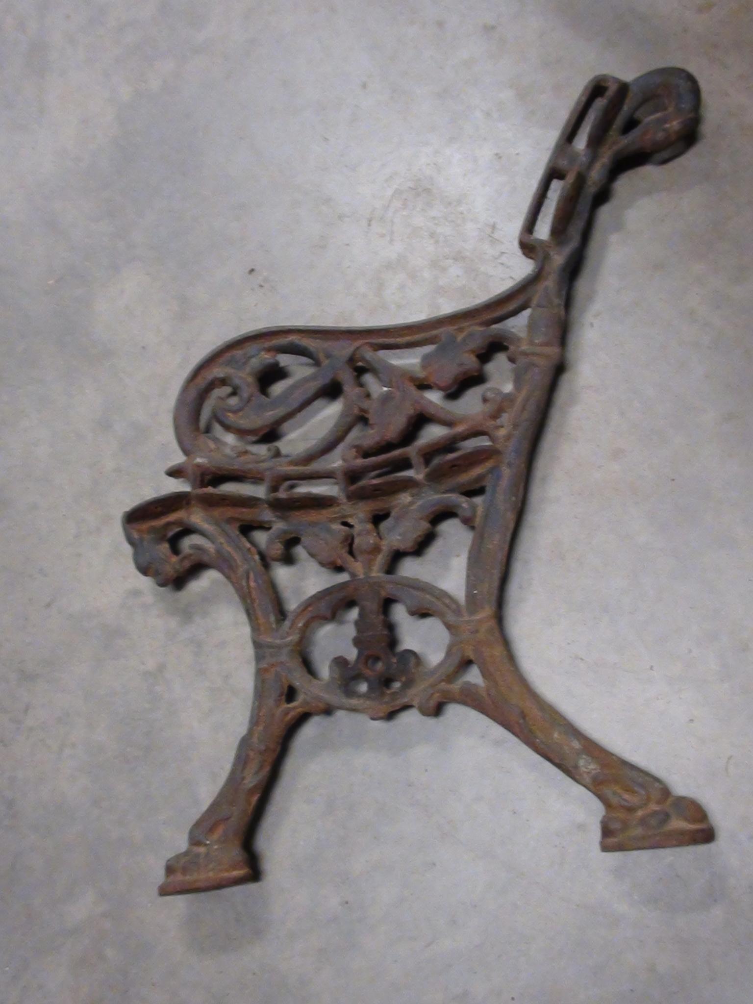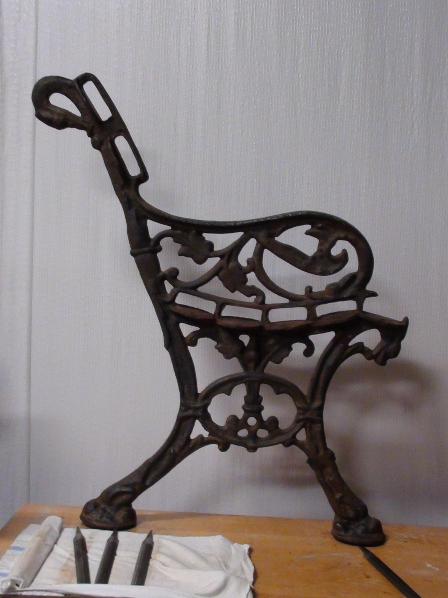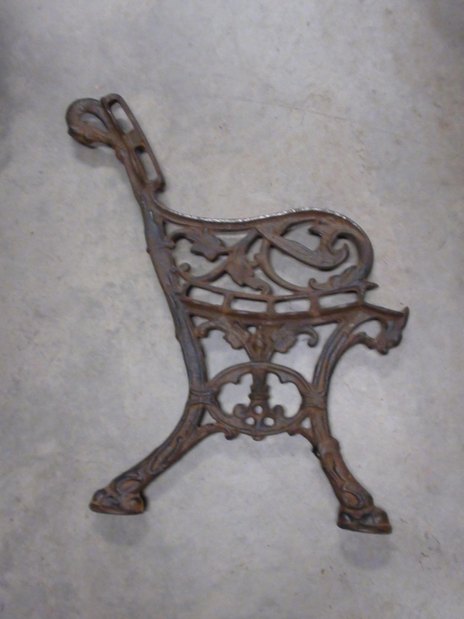 A pair of cast Iron park bench ends (illustrated) and tie rod. Ouroboros motif, the ancient mystical symbol representing a dragon devouring its own tail. They are heavy with each weighing about 32 lbs. I have seen other Victorian iron bench ends but have not seen this dragon head motif before, or by searching on line. They were a rough casts with some porosity and flashing. I cleaned them up so they could be safely handled. I wire brushed, used a rust treatiment, primer, and will finish them a flat Green. They appear to be very old from the casting method and the pitting on tie rod. I removed what I consider to be the replacement slats to the original slats. The ones removed were oak and were beginning to rot and the fasteners were moden carriage bolts that were rusting away. I have machined new white oak planks and have gotten the bronze carriage bolts to reassemble with (bronze bolts can be quite expensive now).