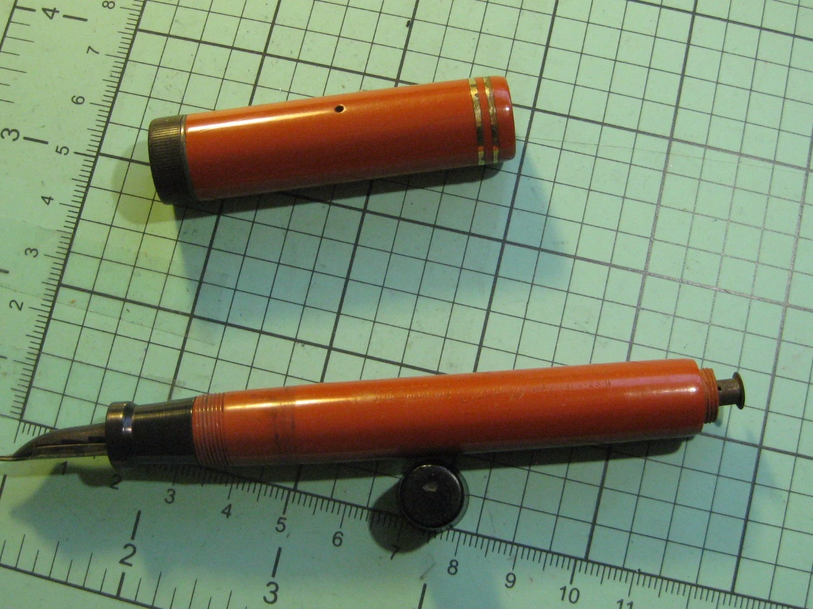 Parker Duofold Orange Fountain Pen. Made by Parker Pen Company. Materials: Plastic, metal. Estimated value: $30 – $70. Condition: Fair. The market for vintage fountain pens is currently stable, with moderate demand among collectors.