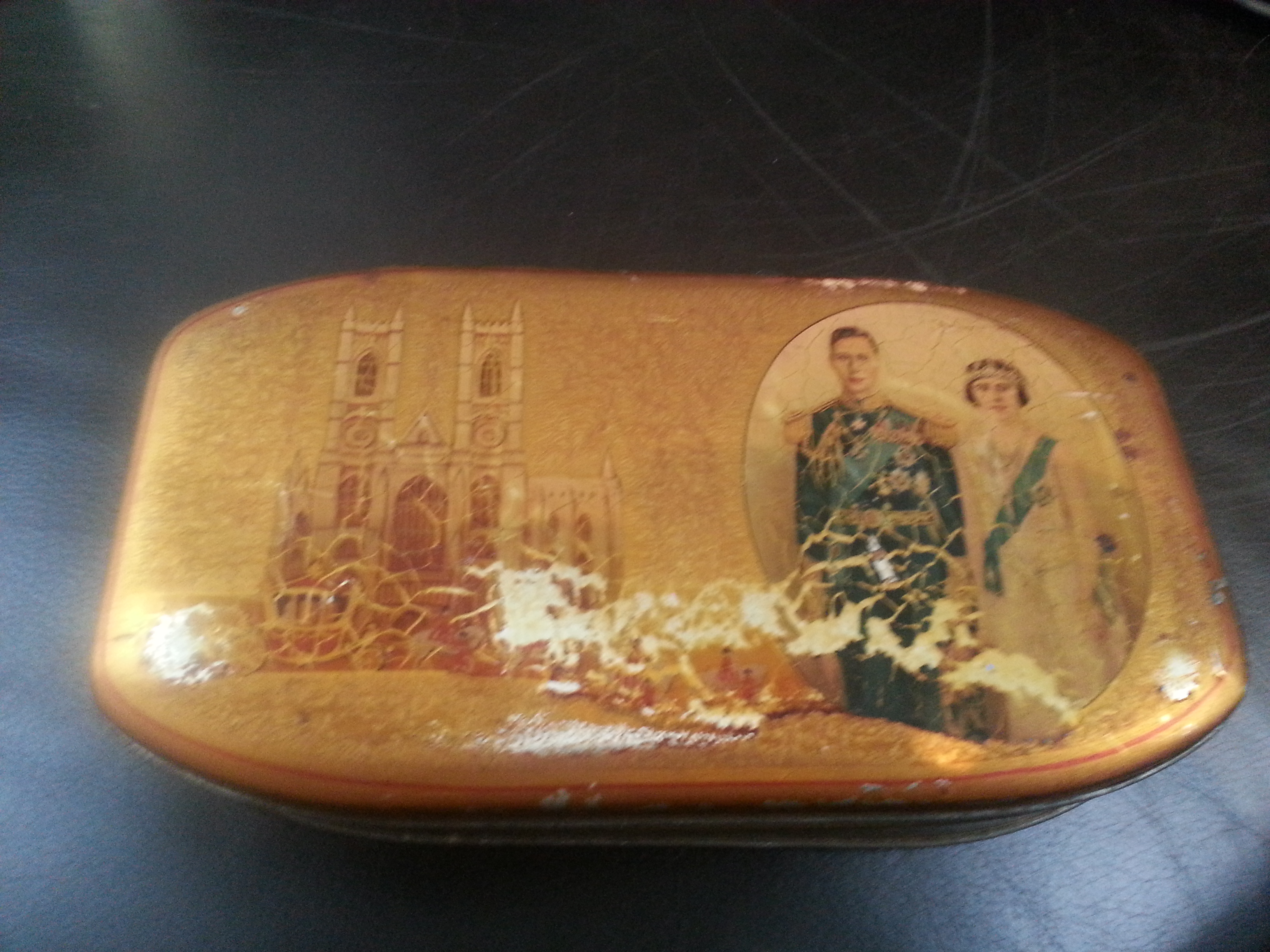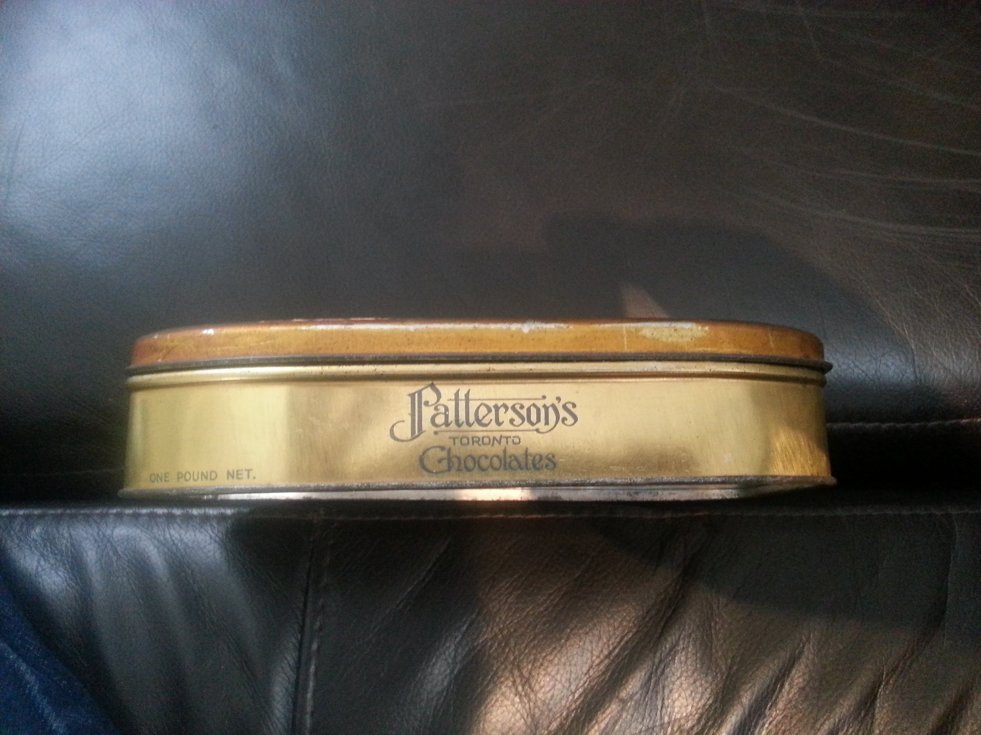 Tin is not in mint condition. Some colour is missing and picture is crackled. Side says "Patterson's Toronto Chocolates" Side says "Container Made in England: