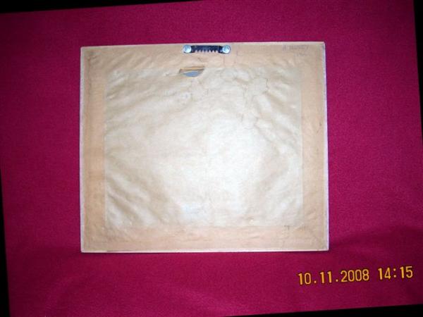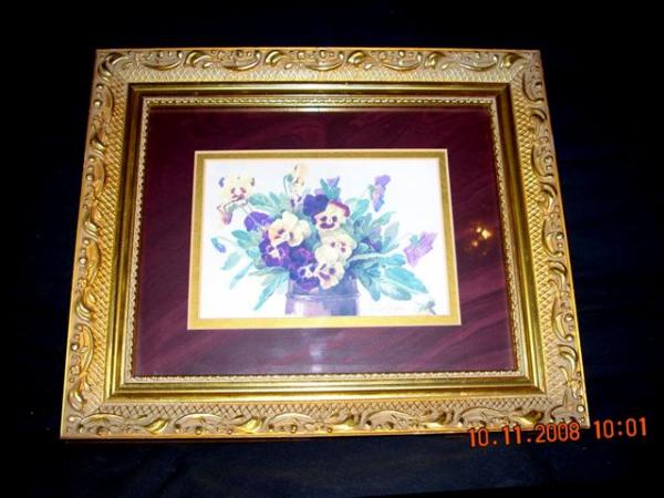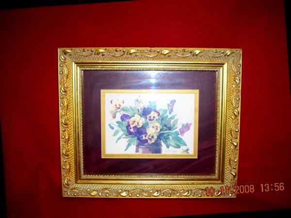 I don't know much about the painting and did a little research online about the artist Paul de Longpre. I assumed the painting is a watercolor. It is yellow and purple pansies in a vase. It has a gilt frame with a few tiny chips only noticeable when you look closely.It is signed at the right lower bottom of painting. There are two sets of numbers written on the back with pencil A105557 & 1290.There is a little tear on the paper covering the back. The painting is in excellent condition.