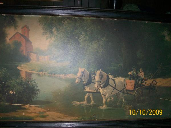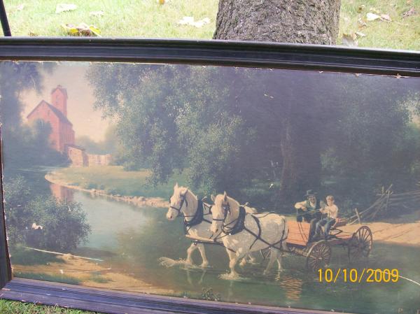 This is a print called "the Big Moment" it is from a calender series Detlefsen did in the 1950's called "Horse and Buggy Days". The dad is teaching the son to drive across the creek. Detlefsen was said to have reflected on his own boyhood for inspration in his paintings.