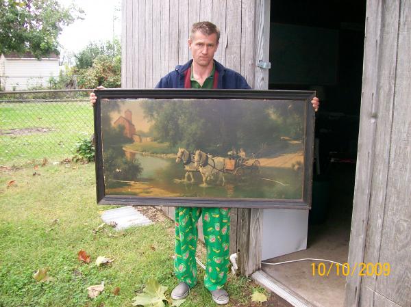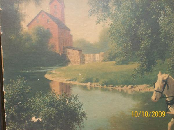 The painting was in fair condition when I got it. There are a few scratches on it and the painting itself has seemed to have shrunk from the frame. The pigments of the paint have changed colors. Since it came away from the frame you can see a brighter blue in the upper left hand corner compared to the rest of the painting. It was apparently stapled to the frame and it seems the previous owners had removed it at one time because they decided to tape it back to the frame with duct tape.