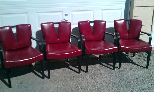 There are four chairs. They are black with red leather and red striped velvet on the backs. There is a small tear in the leather on one. The seats need new foam. They may have originally had springs?? I do not know if the upholstery is original. We had no idea what these were, but after purchase did some investigating and we THINK they are Paul Frankl chairs. Would love verification of this and an appraisal plus would love to know if the upholstery is original. Thanks!