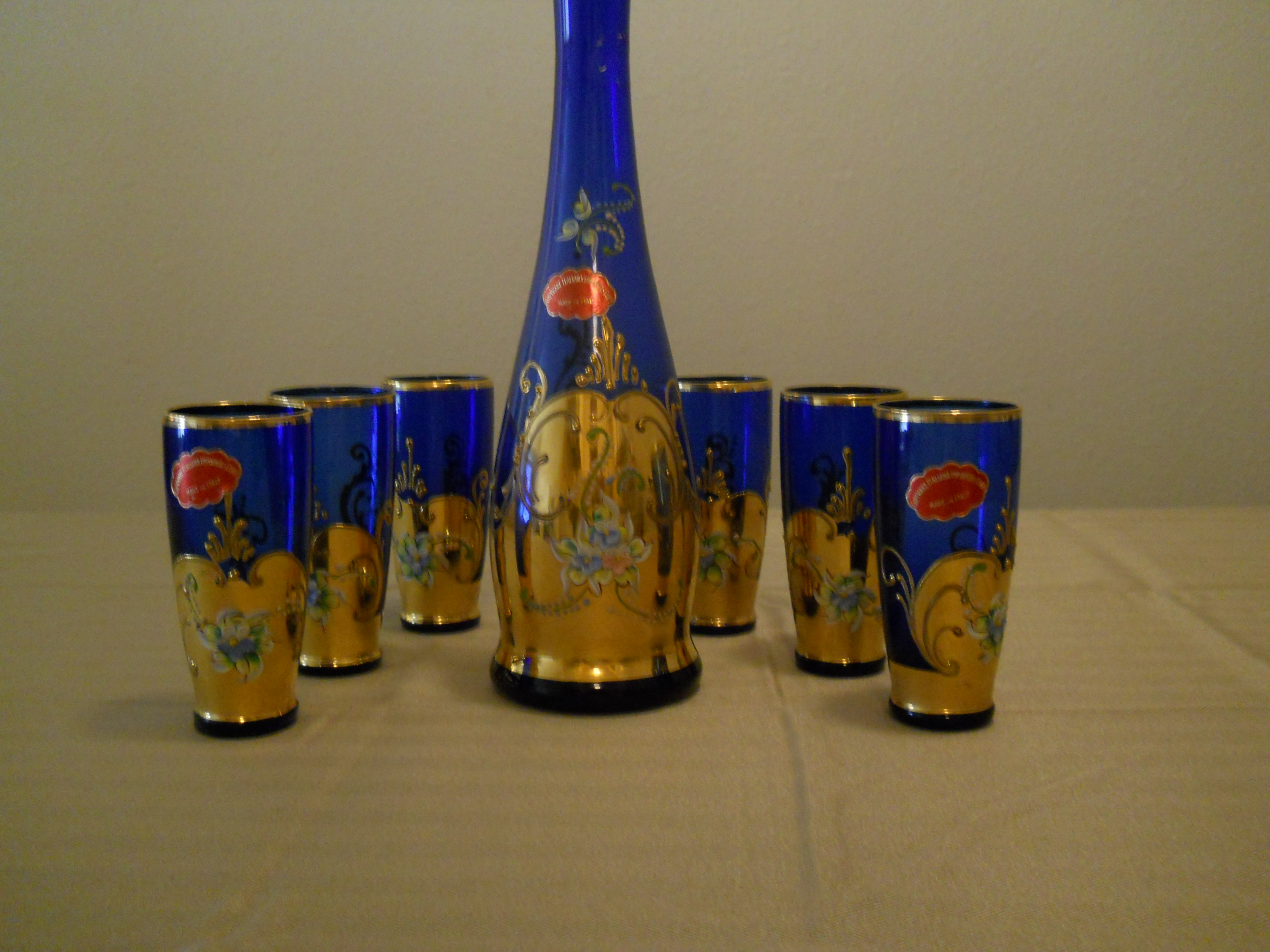 The items are made in in Italy. The colbalt blue 7pc set ihas a sticker underneath that reads Pauly &co., and the ruby red Basket also reads Pauly&co.(there are some numbers as well #31577 plus the intials N.R.underneath the large colbalt blue bowl.) The 7pc decanter set has a metal(alluminum?) sticker on the bottle and 2 glasses that reads "Giftware ITALIANA IMPORTERS CORP-Made in ITALY. Each item has gilded gold with hand painted flowers. These are older than I thought. Most likely they are from the 1950's