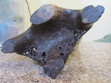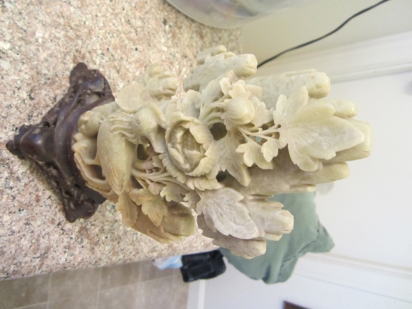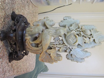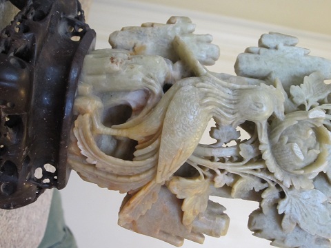 It's a stone , greenish in color it has a peacock and flowers carved on it and it also has a brown carved stand. some people think it might be soapstone. it has no markings or signatures.