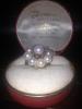 5/16 inch pearl is set/surrounded by 12 1/16 inch sapphire stones which are set/surrounded by 18 14k white gold (diamond shaped) leaves?, with 14k white gold band/settings. On the inside of the band "ROMANY14K". Single band opposite the pearl/stones, then seperates into 3 thinner bands about 2/3 the way up on each side. The pearl/sapphires/gold leafs are not at 90 degree angles in relation to the band, instead they're at a tilt of about 60 degrees (one side) and 120 degrees (other side).