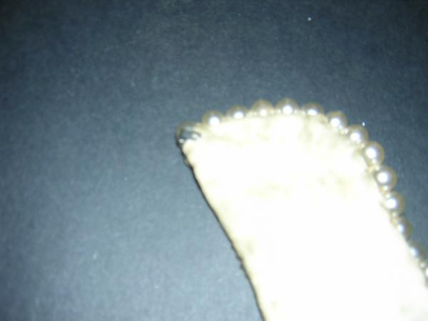 Pearl Necklace on a cloth background. It has about 8 pearls missing. It says Made in Japan on the back and it needs cleaned.